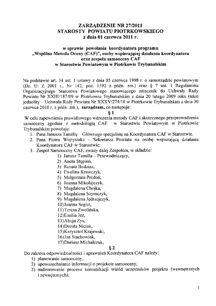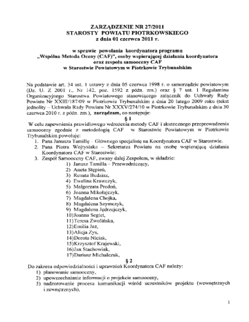 ZARZ^DZENIE NR 27/2011 STAROSTY POWIATU PIOTRKOWSKIEGO z dnia 01 czerwca 2011 r. w sprawie powotania koordynatora programu ,,Wsp61na Metoda Oceny (CAF)", osoby vvspicrajifcej d/ialania koordynatora oraz zespotu samooceny CAF w Starostwie Powiatowym w Piotrkowie Trybunalskim Na podstawie art. 34 ust. 1 ustawy z dnia 05 czerwca 1998 r. o samorz^dzie powiatowym (Dz. U. Z 2001 r., Nr 142, poz. 1592 z pozn. zm.) oraz § 7 ust. 1 Regulaminu Organizacyjnego Starostwa Powiatowego stanowi^cego zat^cznik do Uchwary Rady Powiatu Nr XXIII/187/09 w Piotrkowie Trybunalskim z dnia 20 lutego 2009 roku (tekst jednolity - Uchwala Rady Powiatu Nr XXXV/274/10 w Piotrkowie Trybunalskim z dnia 30 czerwca 2010 r. z pozn. zm.), zarz^dzam, co nastej>uje: §1 W celu zapewnienia prawidiowego wdrozenia metody CAF i skutecznego przcprowadzenia samooceny zgodnie z metodologia^ CAF w Starostwie Powiatowym w Piotrkowie Trybunalskim powohjje; 1. Pana Janusza Tamille - Glownego specjalist^ na Koordynatora CAF w Starostwie. 2. Pana Piotra Wojtysiaka - Sekretarza Powiatu na osob? wspieraja^ dzialania Koordynatora CAF w Starostwie; 3. Zespol Samooceny CAF, zwany dalej Zespolem, w skladzie: 1) Janusz Tamilla - Przewodnicz^cy, 2) Aneta St^pieh, 3) Renata Budzisz, 4) Ewelina Krawczyk, 5) Malgorzata Prcdori, 6) Joanna Mikolajczyk, 7) Magdalena Chojka, 8) Magdalena Szymczyk, 9) Magdalena J^drzejczyk, 10)Joanna Segiet, 1 l)Tcrcsa Zwolihska, 12)Emilia Jez, 13)AlicjaZys, 14)Dorota Niciak, 15)Krzysztot"Krajewski, 16) Jan Stachowiak, 17)Dariusz Michalczuk, §2 Do zakresu odpowiedzialnosci i uprawnien Koordynatora CAF nalezy: 1) planowanie samooceny, 2) upowszechnianie informacji o projekcie samooceny, 3) nadzorowanie procesu komunikacji wsrod uczestnikow projektu (wewn^trznych i zewn^trznych), 4) kontakty i konsultacje ze stronami zainteresowanymi projektem, 5) wsparcie Kierownictwa w tworzeniu grup samooceny oraz wyznaczeniu liderow gnip, 6) rekrutacja uczestnikow na szkolcnia z zakresu samooceny, 7) gromadzenie dokumentacji wspomagajacej prowadzenie samooceny oraz dowodow obiektywnych, 8) aktywne uczestnictwo w grupie samooceny, 9) wspomagania procesu osiagania konsensusu, 1 0)opracowanie sprawozdania na temat wynikow samooceny, ll)bezposrednia wspotpraca z ckspcrtami Partnera F5 Konsulting Sp. z o.o. w ramach projcktu ,,Przygotowanie jednostek samorzadu terytorialnego do stosowania Wspolnej Metody Oceny (CAP) w procesie mierzenia potencjahl i dokonan poprzez szkolenia pracownikow i pomoc doradcza" wspotfinansowanego ze srodkow Europejskiego Funduszu Spolecznego w ramach Programu Operacyjnego Kapital Ludzki Poddzialanie 5.2.2. Systemowe wsparcie ftmkcjonowania administracji samorzadowej. §3 Do zadan Zespohi nalezy w szczegolnosci: 1) aktywne uczestnictwo w grupie samooceny, 2) udzial w szkoleniach z zakresu CAP, 3) udzial w tworzeniu harmonogramu prac grupy, 4) przeprowadzenie indywidualnej samooceny: a. zbicranic dowodow, b. ocena poszczegolnych kryteriow, c. wskazywanie mocnych stron Urz^du, d. wskazywanie obszarow W7inagajacych usprawnien, e. wprowadzanie raportow do narz^dzia eTool, f. sporzadzanie raportow, 5) udzial w samoocenie wspolncj: a. wspomaganie procesu osiagania konsensusu, b. dostarczanie wynikow ocen indywidualnych oraz stosownych dowodow Koordynatorowi CAP, 6) udziaJ w sporzadzeniu sprawozdania z wynikow samooceny, 7) przygotowanie propozycji dzialan usprawniajacych. §4 Zobowiazuj? wszystkich pracowrnikow Starostwa do udzielenia Koordynatorowi CAP oraz Zespolowi wszelkiej pomocy zwiazanej z wdrazaniem metody CAP. §5 Wykonanic Zarzadzcnia powicrzam Sckretarzowi Powiatu. §6 Zarzadzenie wchodzi w zycie z dniem podpisania. S TA c cc c mgr m±. Stanisfaw Cubafa