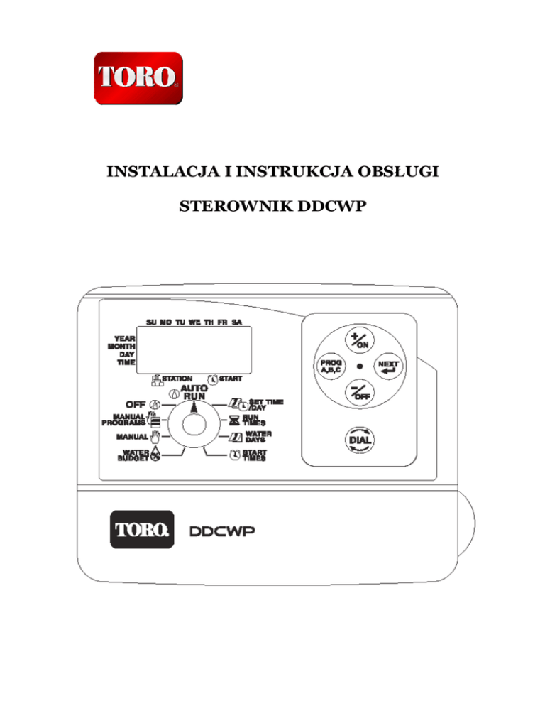 INSTALACJA I INSTRUKCJA OBSŁUGI STEROWNIK DDCWP Spis Treści 1. Specyfikacja Sterownika 2. Instalacja 3. Podłączenie i Funkcjonowanie Czujnika Deszczu 4. Programowanie - Data i Godzina - Czas Działania - Dni Nawadniania - Regulacja Sezonowa - Sterowanie Manualne - Ustawienie Manualne Programu - Wyłączenie - Auto-run 5. Automatycznie wykrywanie napięcia prądu elektrycznego 6. Pamięć sterownika 7. Zalecane długości kabla ziemnego 8. Plan Nawadniania Dziękujemy za zakup wodoodpornego Sterownika Toro DDCWP, który wyposażony jest w najnowszą technologię programowania dostępną na łatwym do użytkowania cyfrowym wyświetlaczu. Poniższe instrukcje pomogą rozpocząć pracę ze sterownikiem DDCWP. Post ępowanie zgodnie z prostymi krokami, zważając szczególnie na UWAGI, które dadzą ci pomocne wskazówki i porady dotyczące programowania, zwiększy maksymalnie wydajność sterownika DDCWP. SPECYFIKACJA STEROWNIKA: Sterownik DDCWP mo że pracować przy jednym zaworze głównym i jednym zaworze sekcyjnym jednocze śnie. Sterownik DDCWP pracuje pod pr ądem stałym, oznacza to, że używa tylko cewek na prąd stały DC (tzw zespół blokujący cewkę). Nie pracuje pod prądem zmiennym. Sterownik zosta ł w pełni przetestowany przy użyciu Toro DC Latching Solenoids. Je śli zamierzacie Państwo użyć innej marki, należ y ją przetestować przed dokonaniem instalacji. Jako, że zespół blokuj ący cewkę jest bardziej wraż liwy na zanieczyszczenia niż zwyk ła cewka prą du zmiennego (AC) Toro zaleca stosowanie filtru i zaworu gł ównego w systemie. Sterownik DDCWP został przetestowany, by dzia łać także 2 metry pod wodą. Stopień ochrony IP68. Należy przed otworzeniem schowka na bateri ę sterownik cał kowicie wysuszyć. Wszystkie podłączenia elektryczne muszę być wodoodporne, aby zachować trwałość komponentów systemu. Sterownik jest w tym celu wyposażony w wodoodporne złączki typu 3M. Jeśli wymagane jest zastosowanie więcej połączeń, Toro poleca złączki 3M DBY. Należy wykonać całą instalację elektryczną przed pod łączeniem zasilania (9V) do sterownika. INSTALACJA STEROWNIKA DDCWP Wypoziomuj i przymocuj obudowę sterownika do solidnej powierzchni. Jeśli mocujecie Państwo w skrzynce zaworowej, rekomenduje się umieszczenie sterownika pod pokrywą zostawiaj ąc wystarczająco kabla tak, aby można by ło łatwo zdjąć pokrywę i mie ć dostęp do sterownika. Nast ępnie należy podłą czyć przewody cewki (DC) do sterownika. Istotne jest to, aby dopasować przewody kolorami (czarny do czarnego, czerwony do czerwonego) Po podłączeniu przewodów sekcji, usuń pokrywę komory na baterię i wyjmij dwa łącza baterii 9VDC. Podłącz dwie 9VDC baterie alkaiczne, wsuń do komory na baterie, zamknij pokrywę zgodnie z ruchem wskazówek zegara. Zmieniać bądź umieszczać baterie należy w suchych warunkach. Jeśli wilgoć dostanie się do komory na baterie, może to doprowadzi ć do pogorszenia się jakości pracy baterii. UWAGA: Kiedy do sterownika zostanie podłą czone zasilanie zaczyna kalibrować wszystkie cewki wysył ając sygnał pulsujący „OFF” mający na celu późniejsze właściwe ich dział anie. Dlatego istotne jest podłączenie wszystkich przewodów od zaworów przed załączeniem zasilania do sterownika. Jeśli jest konieczność programowania sterownika przed instalacj ą należy po zakończonym programowaniu wyciągnąć baterie i dopiero wtedy podłączyć przewody. POD ŁĄ CZENIE I FUNKCJONOWANIE CZUJNIKA DESZCZU Sterownik DDCWP współpracuje z Czujnikiem Deszczu Toro TRS. Rozetnij żół te przewody ze sterownika i używając wodoodpornych połącz dwa przewody od czujnika deszczu do żó łtych przewodów sterownika. Sterownik będzie współgra ł z każdym czujnikiem deszczu N.C.(normalnie zamknięty). Nale ży postępować zgodnie z instrukcją obsługi producenta. Aktywacja czujnika deszczu spowoduje wstrzymanie programu nawadniania aż do momentu przywrócenia mu statusu zamknię tego N.C. . Uwaga: Gdy nawadnianie wstrzymane jest z powodu czujnika deszczu, wyświetlacz pokaże OFF oraz ikonę parasola. PROGRAMOWANIEProgramowanie Zalecane jest wciśnięcie przycisku RESET w celu wyczyszczenia pamię ci. Wciśnij DIAL, aby przejść do ustawie ń daty i godziny. Pozycja: SET TIME/DAY Ustaw aktualny rok, miesiąc, dzień i godzinę Ustaw rok posługuj ąc się przyciskami +/ON lub -/OFF Wciśnij NEXT, aby zatwierdzić ustawienia. Ustaw miesi ąc posł ugując się przyciskami +/ON lub -/OFF Wciśnij NEXT, aby zatwierdzić ustawienia. Ustaw dzień posługując się przyciskami +/ON lub -/OFF Wciśnij NEXT, aby zatwierdzić ustawienia. Ustaw 24godzinny zegar(domyś lny) lub AM/PM posługując się przyciskami +/ON lub -/OFF Wciśnij NEXT, aby zatwierdzić ustawienia. Ustaw godzinę posługując się przyciskami +/ON lub -/OFF Wciśnij NEXT, jeśli chcesz wrócić do ustawienia roku. UWAGA: Naciskając +/ON lub -/OFF bez przerwy, liczby zaczną zmieniać si ę szybciej. Wciśnij DIAL, aby przejść do ustawień czasu działania Pozycja: RUN TIME Sterownik DDCWP ma 3 niezależne programy: A, B i C. Program A ma początkowy program z ustawieniami: 5minutowy czas nawadniania każdej sekcji, z czasem rozpoczę cia 04:00 (AM). Ustawienia te można usunąć (patrz: „Usuwanie Ustawień Programu”) lub zmodyfikować postępując wg nastę pujących kroków: Wciśnij PROG, aby wybrać pożądany program. Ustaw pożądany czas dzia łania pierwszej sekcji pos ługują c się przyciskami +/ON lub -/OFF (od 1min do 4h) Wciśnij NEXT, aby zatwierdzić ustawienia i przejść do następnej sekcji. Kontynuuj przypisywanie sekcji danemu programowi ustawiają c ich czas dzia łania. Nie wybrane sekcje w programie pozostan ą wy łączone. W łączanie/Wy łączanie Głównego Zaworu: Po ustawieniu ostatniej sekcji pokaż e się pozycja MASTER VALVE. Wyświetlacz będzie pokazywał „ON”(włą czony). Aby wy łączyć g