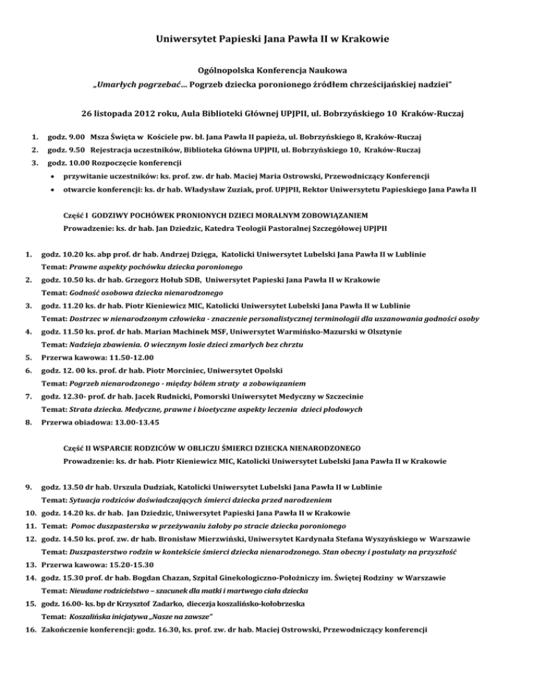 Uniwersytet Papieski Jana Pawła II w Krakowie Ogólnopolska Konferencja Naukowa „Umarłych pogrzebać… Pogrzeb dziecka poronionego źródłem chrześcijańskiej nadziei” 26 listopada 2012 roku, Aula Biblioteki Głównej UPJPII, ul. Bobrzyńskiego 10 KrakówRuczaj 1. godz. 9.00 Msza Święta w Kościele pw. bł. Jana Pawła II papieża, ul. Bobrzyńskiego 8, KrakówRuczaj 2. godz. 9.50 Rejestracja uczestników, Biblioteka Główna UPJPII, ul. Bobrzyńskiego 10, KrakówRuczaj 3. godz. 10.00 Rozpoczęcie konferencji • przywitanie uczestników: ks. prof. zw. dr hab. Maciej Maria Ostrowski, Przewodniczący Konferencji • otwarcie konferencji: ks. dr hab. Władysław Zuziak, prof. UPJPII, Rektor Uniwersytetu Papieskiego Jana Pawła II Część I GODZIWY POCHÓWEK PRONIONYCH DZIECI MORALNYM ZOBOWIĄZANIEM Prowadzenie: ks. dr hab. Jan Dziedzic, Katedra Teologii Pastoralnej Szczegółowej UPJPII 1. godz. 10.20 ks. abp prof. dr hab. Andrzej Dzięga, Katolicki Uniwersytet Lubelski Jana Pawła II w Lublinie Temat: Prawne aspekty pochówku dziecka poronionego 2. godz. 10.50 ks. dr hab. Grzegorz Hołub SDB, Uniwersytet Papieski Jana Pawła II w Krakowie Temat: Godność osobowa dziecka nienarodzonego 3. godz. 11.20 ks. dr hab. Piotr Kieniewicz MIC, Katolicki Uniwersytet Lubelski Jana Pawła II w Lublinie Temat: Dostrzec w nienarodzonym człowieka znaczenie personalistycznej terminologii dla uszanowania godności osoby 4. godz. 11.50 ks. prof. dr hab. Marian Machinek MSF, Uniwersytet WarmińskoMazurski w Olsztynie Temat: Nadzieja zbawienia. O wiecznym losie dzieci zmarłych bez chrztu 5. Przerwa kawowa: 11.5012.00 6. godz. 12. 00 ks. prof. dr hab. Piotr Morciniec, Uniwersytet Opolski Temat: Pogrzeb nienarodzonego między bólem straty a zobowiązaniem 7. godz. 12.30 prof. dr hab. Jacek Rudnicki, Pomorski Uniwersytet Medyczny w Szczecinie Temat: Strata dziecka. Medyczne, prawne i bioetyczne aspekty leczenia dzieci płodowych 8. Przerwa obiadowa: 13.0013.45 Część II WSPARCIE RODZICÓW W OBLICZU ŚMIERCI DZIECKA NIENARODZONEGO Prowadzenie: ks. dr hab. Piotr Kieniewicz MIC, Katolicki Uniwersytet Lubelski Jana Pawła II w Krakowie 9. godz. 13.50 dr hab. Urszula Dudziak, Katolicki Uniwersytet Lubelski Jana Pawła II w Lublinie Temat: Sytuacja rodziców doświadczających śmierci dziecka przed narodzeniem 10. godz. 14.20 ks. dr hab. Jan Dziedzic, Uniwersytet Papieski Jana Pawła II w Krakowie 11. Temat: Pomoc duszpasterska w przeżywaniu żałoby po stracie dziecka poronionego 12. godz. 14.50 ks. prof. zw. dr hab. Bronisław Mierzwiński, Uniwersytet Kardynała Stefana Wyszyńskiego w Warszawie Temat: Duszpasterstwo rodzin w kontekście śmierci dziecka nienarodzonego. Stan obecny i postulaty na przyszłość 13. Przerwa kawowa: 15.2015.30 14. godz. 15.30 prof. dr hab. Bogdan Chazan, Szpital GinekologicznoPołożniczy im. Świętej Rodziny w Warszawie Temat: Nieudane rodzicielstwo – szacunek dla matki i martwego ciała dziecka 15. godz. 16.00 ks. bp dr Krzysztof Zadarko, diecezja koszalińskokołobrzeska Temat: Koszalińska inicjatywa „Nasze na zawsze” 16. Zakończenie konferencji: godz. 16.30, ks. prof. zw. dr hab. Maciej Ostrowski, Przewodniczący konferencji