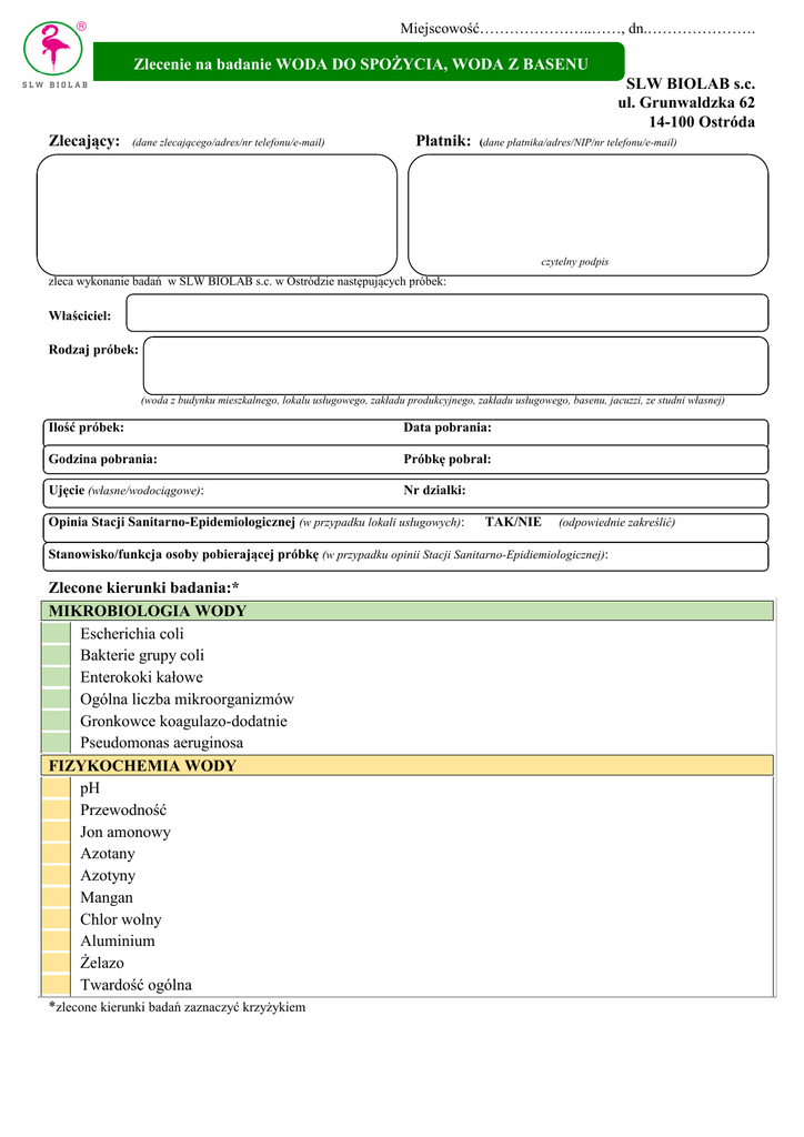 Miejscowość…………………..……, dn.…………………. Zlecenie na badanie WODA DO SPOŻYCIA, WODA Z BASENU SLW BIOLAB s.c. ul. Grunwaldzka 62 14-100 Ostróda Zlecający: (dane zlecającego/adres/nr telefonu/e-mail) Płatnik: (dane płatnika/adres/NIP/nr telefonu/e-mail) czytelny podpis zleca wykonanie badań w SLW BIOLAB s.c. w Ostródzie następujących próbek: Właściciel: Rodzaj próbek: (woda z budynku mieszkalnego, lokalu usługowego, zakładu produkcyjnego, zakładu usługowego, basenu, jacuzzi, ze studni własnej) Ilość próbek: Data pobrania: Godzina pobrania: Próbkę pobrał: Ujęcie (własne/wodociągowe): Nr działki: Opinia Stacji Sanitarno-Epidemiologicznej (w przypadku lokali usługowych): TAK/NIE (odpowiednie zakreślić) Stanowisko/funkcja osoby pobierającej próbkę (w przypadku opinii Stacji Sanitarno-Epidiemiologicznej): Zlecone kierunki badania:* MIKROBIOLOGIA WODY Escherichia coli Bakterie grupy coli Enterokoki kałowe Ogólna liczba mikroorganizmów Gronkowce koagulazo-dodatnie Pseudomonas aeruginosa FIZYKOCHEMIA WODY pH Przewodność Jon amonowy Azotany Azotyny Mangan Chlor wolny Aluminium Żelazo Twardość ogólna *zlecone kierunki badań zaznaczyć krzyżykiem Inne kierunki badań: (po uzgodnieniu z laboratorium)………………………………………………….... Dodatkowe informacje: …………………………………………………………………………. Sposób przekazania sprawozdania: telefonicznie, poczta, fax, e-mail, osobiście Osoby upoważnione do uzyskania bieżących informacji z badania: Osoby upoważnione do otrzymania sprawozdania z badania: Laboratorium zobowiązuje się do przeprowadzenia badań według obowiązujących w laboratorium procedur i instrukcji badawczych. Laboratorium zobowiązuje się do zachowania poufności wyników badań i praw własności klienta, o ile przepisy nie stanowią inaczej i archiwizowanie ich przez okres 3 lat. Klientowi lub osobie przez niego upoważnionej przysługuje prawo do wglądu do dokumentacji dotyczącej jego badań, uzyskiwania bieżących informacji i uczestnictwa w badaniu na każdym jego etapie oraz złożenia skargi do Kierownika Laboratorium, wg obowiązującej w Laboratorium procedury. Płatnik zobowiązuje się do zapłaty należności za badania w ciągu 14 dni od dnia otrzymania Faktury na konto Wykonawcy PKO BP 34 1020 3613 0000 6102 0033 6297 wg cennika obowiązującego w laboratorium. W sprawach nieuregulowanych niniejszą umową mają zastosowanie przepisy Kodeksu Cywilnego. ..…………………………………….. Podpis zlecającego UWAGA! Za prawidłowe pobranie i dostarczenie do badania próbek odpowiada zleceniodawca. Przy kontaktowaniu się z zapytaniem o wyniki badania prosimy powoływać się na numer zlecenia nadany przez Laboratorium lub nazwisko klienta. Uwagi …………… ………………………………………………………………………………………………………………. …………………………………………………………………………………………………………………………………….