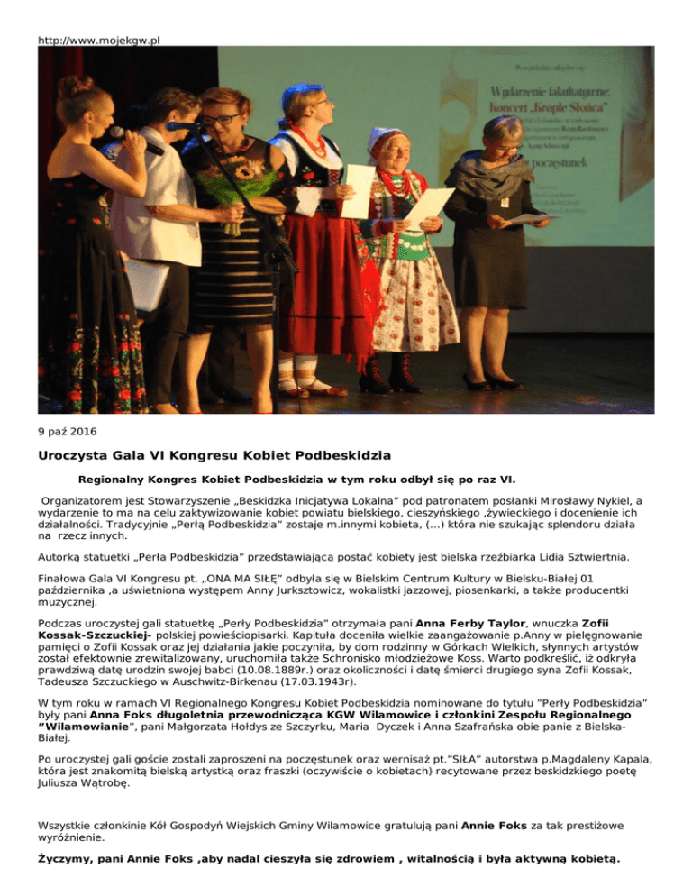 http://www.mojekgw.pl 9 paź 2016 Uroczysta Gala VI Kongresu Kobiet Podbeskidzia Regionalny Kongres Kobiet Podbeskidzia w tym roku odbył się po raz VI. Organizatorem jest Stowarzyszenie „Beskidzka Inicjatywa Lokalna” pod patronatem posłanki Mirosławy Nykiel, a wydarzenie to ma na celu zaktywizowanie kobiet powiatu bielskiego, cieszyńskiego ,żywieckiego i docenienie ich działalności. Tradycyjnie „Perłą Podbeskidzia” zostaje m.innymi kobieta, (…) która nie szukając splendoru działa na rzecz innych. Autorką statuetki „Perła Podbeskidzia” przedstawiającą postać kobiety jest bielska rzeźbiarka Lidia Sztwiertnia. Finałowa Gala VI Kongresu pt. „ONA MA SIŁĘ” odbyła się w Bielskim Centrum Kultury w Bielsku-Białej 01 października ,a uświetniona występem Anny Jurksztowicz, wokalistki jazzowej, piosenkarki, a także producentki muzycznej. Podczas uroczystej gali statuetkę „Perły Podbeskidzia” otrzymała pani Anna Ferby Taylor, wnuczka Zofii Kossak-Szczuckiej- polskiej powieściopisarki. Kapituła doceniła wielkie zaangażowanie p.Anny w pielęgnowanie pamięci o Zofii Kossak oraz jej działania jakie poczyniła, by dom rodzinny w Górkach Wielkich, słynnych artystów został efektownie zrewitalizowany, uruchomiła także Schronisko młodzieżowe Koss. Warto podkreślić, iż odkryła prawdziwą datę urodzin swojej babci (10.08.1889r.) oraz okoliczności i datę śmierci drugiego syna Zofii Kossak, Tadeusza Szczuckiego w Auschwitz-Birkenau (17.03.1943r). W tym roku w ramach VI Regionalnego Kongresu Kobiet Podbeskidzia nominowane do tytułu ”Perły Podbeskidzia” były pani Anna Foks długoletnia przewodnicząca KGW Wilamowice i członkini Zespołu Regionalnego ”Wilamowianie”, pani Małgorzata Hołdys ze Szczyrku, Maria Dyczek i Anna Szafrańska obie panie z BielskaBiałej. Po uroczystej gali goście zostali zaproszeni na poczęstunek oraz wernisaż pt.”SIŁA” autorstwa p.Magdaleny Kapala, która jest znakomitą bielską artystką oraz fraszki (oczywiście o kobietach) recytowane przez beskidzkiego poetę Juliusza Wątrobę. Wszystkie członkinie Kół Gospodyń Wiejskich Gminy Wilamowice gratulują pani Annie Foks za tak prestiżowe wyróżnienie. Życzymy, pani Annie Foks ,aby nadal cieszyła się zdrowiem , witalnością i była aktywną kobietą. Fotografie zostały umieszczone na profilu Reg.Kongresu Kobiet Podbeskidzia Art. i pozostałe fotografie C.Puzoń Cecylia P. z Koło Gospodyń Wiejskich Pisarzowice