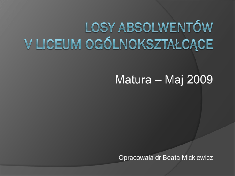 Matura – Maj 2009 Opracowała dr Beata Mickiewicz Informacje ogólne Liczba absolwentów: 172 Liczba studiujących absolwentów: 170 Studiuje w kraju: 164 7% 4% ○ Trójmiasto: 152 ○ Inne miasta: 12 Studiuje za granicą: 6 Studia stacjonarne: 167 Studiuje zaocznie: 3 89% Trójmiasto Inne miasta Studia zagraniczne Klasa 3A – dwujęzyczna Liczba uczniów w klasie: 29 Zebrano informacje o 29 osobach Studiuje: 28 Pierwszy wybór: 28 Inny kierunek niż wybrany: 0 Studiuje w kraju: 24 Studiuje za granicą: 4 Przygotowanie do studiów: Tak: 28 Nie: 0 100% Pierwszy wybór 100% Tak Klasa 3A UG 15 PG Akademia Sztuk Pięknych, Gdańsk Uniwersytet Mikołaja Kopernika, Toruń Szkoła Policealna University of Aberdeen, Aberdeen, UK University of Oslo, Norwegia Lee Strasberg Theatre and Film Institute, USA 4 2 2 2 1 1 1 Klasa 3A – Uniwersytet Gdański (15 osób) Wydział Filologiczny Wydział Prawa i Administracji Wydział Ekonomiczny Wydział Zarządzania 6 4 2 Wydział Nauk Społecznych Wydział Oceanografii i Geografii 1 1 1 Klasa 3B – MFI Liczba uczniów w klasie: 29 Zebrano informacje o 29 osobach Studiuje: 29 14% Pierwszy wybór: 25 Inny kierunek niż wybrany: 4 Studiuje w kraju: 28 Studiuje za granicą: 1 Przygotowanie do studiów: 86% Tak: 29 Nie: 0 Pierwszy wybór 100% Tak Inny kierunek Klasa 3B 25 PG UG Akademia Marynarki Wojennej w Gdyni Akademia Morska w Gdyni University of Aberdeen, Aberdeen, UK 1 1 1 1 Klasa 3B – Politechnika Gdańska (25 osób) Wydział Elektroniki, Telekomunikacji i Informatyki Wydział Elektrotechniki i Automatyki 14 Wydział Inżynierii Lądowej i Środowiska Wydział Fizyki Technicznej i Matematyki Stosowanej Wydział Architektury Wydział Zarządzania i Ekonomii 5 3 1 1 1 Klasa 3C – MFI Liczba uczniów w klasie: 30 Zebrano informacje o 30 osobach Studiuje: 30 Pierwszy wybór: 30 Inny kierunek niż wybrany: 0 Studiuje w kraju: 30 Studiuje za granicą: 0 Przygotowanie do studiów: 100% Pierwszy wybór 7% Tak: 28 Nie: 2 93% Tak Nie Klasa 3C PG 25 UG Uniwersytet Mikołaja Kopernika, Toruń 3 2 Klasa 3C – Politechnika Gdańska (25 osób) 5 Wydział Mechaniczny Wydział Elektroniki, Telekomunikacji i Informatyki Wydział Elektrotechniki i Automatyki 4 4 4 4 3 Wydział Inżynierii Lądowej i Środowiska Wydział Architektury Wydział Fizyki Technicznej i Matematyki Stosowanej Wydział Oceanotechniki i Okrętownictwa 1 Klasa 3D (Matematyka, języki obce) Liczba uczniów w klasie: 22 Zebrano informacje o 22 osobach Studiuje: 22 Pierwszy wybór: 22 Inny kierunek niż wybrany: 0 Studiuje w kraju: 22 Studiuje za granicą: 0 Przygotowanie do studiów: Tak: 22 Nie: 0 100% Pierwszy wybór 100% Tak Klasa 3D PG 16 Akademia Morska w Gdyni UG Uniwersytet Adama Mickiewicza w Poznaniu Politechnika Poznańska 2 Wyższa Szkoła Zarządzania w Gdańsku 1 1 1 1 Klasa 3D – Politechnika Gdańska (16 osób) 7 Wydział Inżynierii Lądowej i Środowiska Wydział Mechaniczny 5 Wydział Architektury Wydział Elektrotechniki i Automatyki Wydział Zarządzania 2 1 1 Klasa 3E (Biologia, chemia, fizyka) Liczba uczniów w klasie: 32 Zebrano informacje o 32 osobach 31% Studiuje: 32 Pierwszy wybór: 22 Inny kierunek niż wybrany: 10 Studiuje w kraju: 32 Studiuje za granicą: 0 Przygotowanie do studiów: 69% Pierwszy wybór Inny kierunek 13% Tak: 28 Nie: 4 87% Tak Nie Klasa 3E Gdański Uniwersytet Medyczny 14 PG UG 8 7 Uniwersytet Warszawski Wojewódzki Zespół Szkół Policealnych Uniwersytet WarmińskoMazurski w Olsztynie 1 1 1 Klasa 3E – Gdański Uniwersytet Medyczny (14 osób) 10 Wydział Lekarski Wydział Farmaceutyczny Wydział Nauk o zdrowiu 2 2 Klasa 3F - humanistyczna Liczba uczniów w klasie: 30 Zebrano informacje o 30 osobach Studiuje: 29 10% Pierwszy wybór: 26 Inny kierunek niż wybrany: 3 Studiuje w kraju: 28 Studiuje za granicą: 1 Przygotowanie do studiów: 90% Pierwszy wybór Inny kierunek 3% Tak: 28 Nie: 1 97% Tak Nie Klasa 3F UG 22 PG Akademia Sztuk Pięknych, Gdańsk Regent College, Elbląg Akademia Muzyczna, Bydgoszcz Uniwersytet Warszawski Uniwersytet Łódzki Szkocja 1 1 1 1 1 1 1 Klasa 3F – Uniwersytet Gdański (22 osoby) Wydział Prawa i Administracji 13 Wydział Nauk Społecznych Wydział Filologiczny Wydział Ekonomiczny 6 2 1