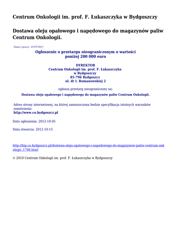Centrum Onkologii im. prof. F. Łukaszczyka w Bydgoszczy Dostawa oleju opałowego i napędowego do magazynów paliw Centrum Onkologii. Numer sprawy: 435/P/2012 Ogłoszenie o przetargu nieograniczonym o wartości poniżej 200 000 euro DYREKTOR Centrum Onkologii im. prof. F. Łukaszczyka w Bydgoszczy 85-796 Bydgoszcz ul. dr I. Romanowskiej 2 ogłasza przetarg nieograniczony na: Dostawa oleju opałowego i napędowego do magazynów paliw Centrum Onkologii. Adres strony internetowej, na której zamieszczona bedzie specyfikacja istotnych warunków zamówienia: http://www.co.bydgoszcz.pl Data ogłoszenia: 2012-10-05 Data otwarcia: 2012-10-15 http://bip.co.bydgoszcz.pl/dostawa-oleju-opalowego-i-napedowego-do-magazynow-paliw-centrum-onk ologii-,1706.html 2010 Centrum Onkologii im. prof. F. Łukaszczyka w Bydgoszczy