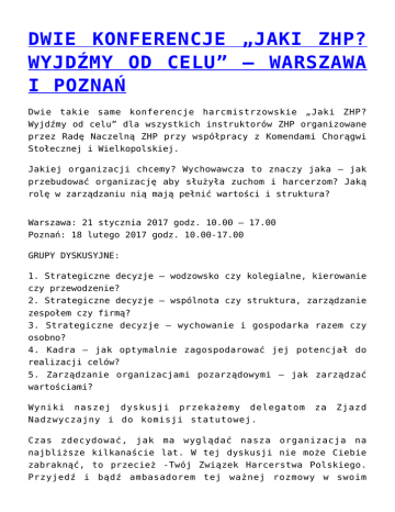 DWIE KONFERENCJE „JAKI ZHP? WYJDŹMY OD CELU” – WARSZAWA I POZNAŃ Dwie takie same konferencje harcmistrzowskie „Jaki ZHP? Wyjdźmy od celu” dla wszystkich instruktorów ZHP organizowane przez Radę Naczelną ZHP przy współpracy z Komendami Chorągwi Stołecznej i Wielkopolskiej. Jakiej organizacji chcemy? Wychowawcza to znaczy jaka – jak przebudować organizację aby służyła zuchom i harcerzom? Jaką rolę w zarządzaniu nią mają pełnić wartości i struktura? Warszawa: 21 stycznia 2017 godz. 10.00 – 17.00 Poznań: 18 lutego 2017 godz. 10.00-17.00 GRUPY DYSKUSYJNE: 1. Strategiczne decyzje – wodzowsko czy kolegialne, kierowanie czy przewodzenie? 2. Strategiczne decyzje – wspólnota czy struktura, zarządzanie zespołem czy firmą? 3. Strategiczne decyzje – wychowanie i gospodarka razem czy osobno? 4. Kadra – jak optymalnie zagospodarować jej potencjał do realizacji celów? 5. Zarządzanie organizacjami pozarządowymi – jak zarządzać wartościami? Wyniki naszej dyskusji przekażemy delegatom Nadzwyczajny i do komisji statutowej. za Zjazd Czas zdecydować, jak ma wyglądać nasza organizacja na najbliższe kilkanaście lat. W tej dyskusji nie może Ciebie zabraknąć, to przecież -Twój Związek Harcerstwa Polskiego. Przyjedź i bądź ambasadorem tej ważnej rozmowy w swoim środowisku instruktorskim – razem z nami zachęcaj do udziału w tej dyskusji w naszym instruktorskim kręgu i w grupie instruktorów z Twojego hufca przyjedźcie do Warszawy lub Poznania. ZGŁOŚ SIĘ DZIŚ! ~> KLIK SZCZEGÓŁY ~> KLIK Czuwaj! hm. Jolanta Kreczmańska wiceprzewodnicząca ZHP komendantka konferencji