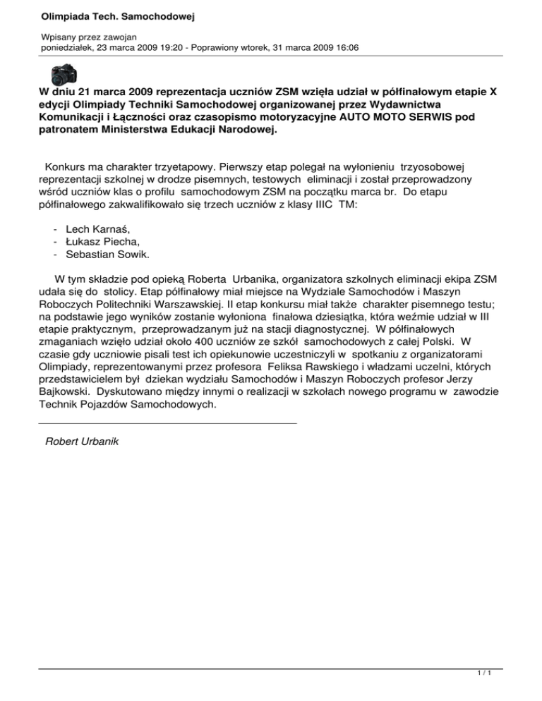 Olimpiada Tech. Samochodowej Wpisany przez zawojan poniedziałek, 23 marca 2009 19:20 - Poprawiony wtorek, 31 marca 2009 16:06 W dniu 21 marca 2009 reprezentacja uczniów ZSM wzięła udział w półfinałowym etapie X edycji Olimpiady Techniki Samochodowej organizowanej przez Wydawnictwa Komunikacji i Łączności oraz czasopismo motoryzacyjne AUTO MOTO SERWIS pod patronatem Ministerstwa Edukacji Narodowej. Konkurs ma charakter trzyetapowy. Pierwszy etap polegał na wyłonieniu trzyosobowej reprezentacji szkolnej w drodze pisemnych, testowych eliminacji i został przeprowadzony wśród uczniów klas o profilu samochodowym ZSM na początku marca br. Do etapu półfinałowego zakwalifikowało się trzech uczniów z klasy IIIC TM: - Lech Karnaś, - Łukasz Piecha, - Sebastian Sowik. W tym składzie pod opieką Roberta Urbanika, organizatora szkolnych eliminacji ekipa ZSM udała się do stolicy. Etap półfinałowy miał miejsce na Wydziale Samochodów i Maszyn Roboczych Politechniki Warszawskiej. II etap konkursu miał także charakter pisemnego testu; na podstawie jego wyników zostanie wyłoniona finałowa dziesiątka, która weźmie udział w III etapie praktycznym, przeprowadzanym już na stacji diagnostycznej. W półfinałowych zmaganiach wzięło udział około 400 uczniów ze szkół samochodowych z całej Polski. W czasie gdy uczniowie pisali test ich opiekunowie uczestniczyli w spotkaniu z organizatorami Olimpiady, reprezentowanymi przez profesora Feliksa Rawskiego i władzami uczelni, których przedstawicielem był dziekan wydziału Samochodów i Maszyn Roboczych profesor Jerzy Bajkowski. Dyskutowano między innymi o realizacji w szkołach nowego programu w zawodzie Technik Pojazdów Samochodowych. Robert Urbanik 1/1