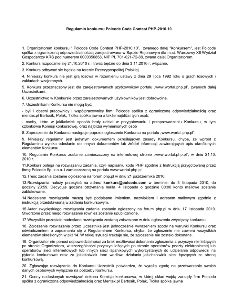 Regulamin konkursu Polcode Code Contest PHP-2010.10 1. Organizatorem konkursu " Polcode Code Contest PHP-2010.10”, zwanego dalej "Konkursem", jest Polcode spółka z ograniczoną odpowiedzialnością zarejestrowana w Sądzie Rejonowym dla m.st. Warszawy XII Wydział Gospodarczy KRS pod numerem 0000350868, NIP PL 701-021-72-88, zwana dalej Organizatorem. 2. Konkurs rozpocznie się 21.10.2010 r. i trwać będzie do dnia 3.11.2010 r. włącznie. 3. Konkurs odbywać się będzie na terenie Rzeczypospolitej Polskiej. 4. Niniejszy konkurs nie jest grą losową w rozumieniu ustawy z dnia 29 lipca 1992 roku o grach losowych i zakładach wzajemnych. 5. Konkurs przeznaczony jest dla zarejestrowanych użytkowników portalu „www.wortal.php.pl”, zwanych dalej Uczestnikami. 6. Uczestnictwo w Konkursie przez zarejestrowanych użytkowników jest dobrowolne. 7. Uczestnikami Konkursu nie mogą być: - byli i obecni pracownicy i współpracownicy firm: Polcode spółka z ograniczoną odpowiedzialnością oraz mentax.pl Bartosik, Polak, Tlołka spółka jawna a także najbliżsi tych osób; - osoby, które w jakikolwiek sposób brały udział w przygotowaniu i przeprowadzeniu Konkursu, w tym członkowie Komisji konkursowej, oraz najbliżsi wymienionych osób 8. Zaproszenie do Konkursu następuje poprzez ogłoszenie Konkursu na portalu „www.wortal.php.pl”. 9. Niniejszy regulamin jest jedynym dokumentem określającym zasady Konkursu, chyba, że wprost z Regulaminu wynika odesłanie do innych dokumentów lub źródeł informacji zawierających opis określonych elementów Konkursu. 10. Regulamin Konkursu zostanie zamieszczony na internetowej stronie „www.wortal.php.pl”, w dniu 21.10. 2010 r. 11.Konkurs polega na rozwiązaniu zadania, czyli napisaniu kodu PHP zgodnie z Instrukcją przygotowaną przez firmę Polcode Sp. z o.o. i zamieszczoną na portalu www.wortal.php.pl 12.Treść zadania zostanie ogłoszona na forum php.pl w dniu 21 października 2010. 13.Rozwiązania należy przesyłać na adres: [email protected] w terminie: do 3 listopada 2010, do godziny 23:59. Decyduje godzina otrzymania maila. 4 listopada o godzinie 00:00 konto mailowe zostanie zablokowane. 14.Nadesłane rozwiązania muszą być podpisane imieniem, nazwiskiem i adresem mailowym zgodnie z instrukcją przedstawioną w zadaniu konkursowym. 15.Autor zwycięskiego rozwiązania zadania zostanie ogłoszony na forum php.pl w dniu 17 listopada 2010. Stworzone przez niego rozwiązanie również zostanie upublicznione. 17.Wszystkie pozostałe nadesłane rozwiązania zostaną zniszczone w dniu ogłoszenia zwycięzcy konkursu. 18. Zgłoszenie rozwiązania przez Uczestnika jest jednocześnie wyrażeniem zgody na warunki Konkursu oraz oświadczeniem o zapoznaniu się z Regulaminem Konkursu, chyba, że zgłoszenie nie zawiera wszystkich elementów określonych w pkt 14. W takiej sytuacji traktuje się, że zgłoszenie nie zostało dokonane. 19. Organizator nie ponosi odpowiedzialności za brak możliwości dokonania zgłoszenia z przyczyn nie leżących po stronie Organizatora, w szczególności przyczyn leżących po stronie operatorów poczty elektronicznej lub operatorów sieci internetowych lub innych sieci łącznikowych wykorzystanych do udzielania odpowiedzi na pytania konkursowe oraz za jakiekolwiek inne wadliwe działania jakichkolwiek sieci łączących ze stroną konkursową. 20. Zgłaszając rozwiązanie do Konkursu Uczestnik potwierdza, że wyraża zgodę na przetwarzanie swoich danych osobowych wyłącznie na potrzeby Konkursu. 21. Oceny nadesłanych rozwiązań dokona Komisja konkursowa, w której skład wejdą zarządy firm Polcode spółka z ograniczoną odpowiedzialnością oraz Mentax.pl Bartosik, Polak, Tlołka spółka jawna PROCEDURA OCENY ROZWIĄZAŃ 22. Ocena nadesłanych rozwiązań będzie przebiegała według następującej procedury: 22.1 W pierwszym etapie weryfikowana będzie poprawność programu. Program zostanie uruchomiony trzykrotnie, za każdym razem z innymi parametrami wejściowymi, a wynik wykonania programu zostanie porównany ze wzorcem. Niezgodność wyniku wykonania programu dla któregokolwiek z zestawu parametrów powoduje odrzucenie programu. 22.2 W drugim etapie oceniana będzie wydajność rozumiana jako szybkość działania programu. Dla każdego z trzech zestawów parametrów wejściowych program zostanie wykonany 1000 razy, a jako wyznacznik szybkości działania przyjęta zostanie suma wszystkich czasów wykonania programu. Każdy kod zostanie sprawdzony w takich samych warunkach, na przeznaczonym do tego serwerze www, nie podłączonym do internetu i nie obsługującym żadnych innych skryptów. 22.3 Po sporządzeniu listy najszybciej wykonujących się skryptów, każdy zostanie przejrzany pod kątem ewentualnych nieścisłości z regulaminem konkursu. Jeśli skrypt będzie naruszał regulamin, zostanie wycofany z konkursu, a zwycięzcą zostanie pierwszy z kolei skrypt, który spełnia regulamin. NAGRODY 23. Nagrodami w konkursie są: nagroda pieniężna w wysokości 2048 zł za zajęcie I miejsca ufundowana przez firmę Polcode Sp. z o.o. nagroda pieniężna w wysokości 1024 zł za zajęcie II miejsca ufundowana przez firmę mentax.pl nagroda pieniężna w wysokości 512 zł za zajęcie III miejsca ufundowana przez firmę mentax.pl 24. Zwycięzcy Konkursu zostaną poinformowani o wygranej, poprzez wysłanie wiadomości e-mail na adres wskazany w zgłoszeniu. 25. Nagrody będą doręczane przez przelew na konto wskazane przez nagrodzonego Uczestnika 26. Organizator nie ponosi odpowiedzialności za nieprawidłowości związane z opóźnieniem bądź nie dostarczeniem nagrody wynikające z błędnego podania danych przez zwycięzcę 27. Organizator oświadcza, iż nagrody zostaną przekazane zgodnie z przepisami ustawy o z dnia 26 lipca 1991 r. o podatku dochodowym od osób fizycznych. 28. Organizator nie ponosi odpowiedzialności za: a) problemy w funkcjonowaniu Konkursu, jeżeli nas