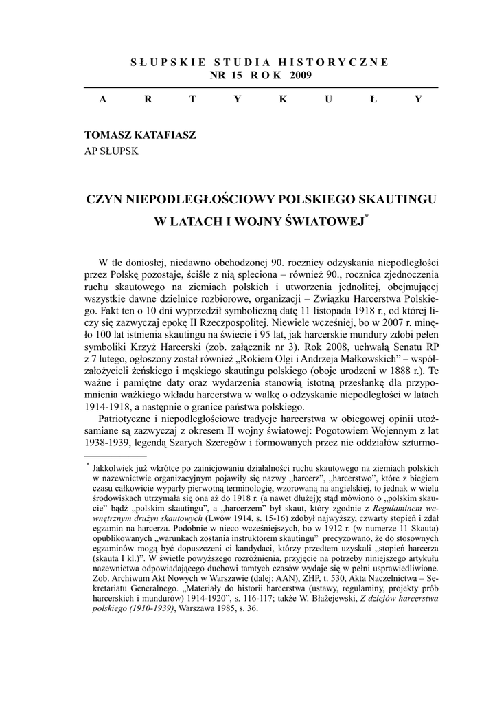 niepodległościowy SCzyn ŁU P S K I E Spolskiego T U D Iskautingu A H IwSlatach T O IRwojny Y Cświatowej ZNE NR 15 R O K 2009 A R T Y K U Ł 113 Y TOMASZ KATAFIASZ AP SŁUPSK CZYN NIEPODLEGŁOŚCIOWY POLSKIEGO SKAUTINGU W LATACH I WOJNY ŚWIATOWEJ* W tle doniosłej, niedawno obchodzonej 90. rocznicy odzyskania niepodległości przez Polskę pozostaje, ściśle z nią spleciona – równieŜ 90., rocznica zjednoczenia ruchu skautowego na ziemiach polskich i utworzenia jednolitej, obejmującej wszystkie dawne dzielnice rozbiorowe, organizacji – Związku Harcerstwa Polskiego. Fakt ten o 10 dni wyprzedził symboliczną datę 11 listopada 1918 r., od której liczy się zazwyczaj epokę II Rzeczpospolitej. Niewiele wcześniej, bo w 2007 r. minęło 100 lat istnienia skautingu na świecie i 95 lat, jak harcerskie mundury zdobi pełen symboliki KrzyŜ Harcerski (zob. załącznik nr 3). Rok 2008, uchwałą Senatu RP z 7 lutego, ogłoszony został równieŜ „Rokiem Olgi i Andrzeja Małkowskich” – współzałoŜycieli Ŝeńskiego i męskiego skautingu polskiego (oboje urodzeni w 1888 r.). Te waŜne i pamiętne daty oraz wydarzenia stanowią istotną przesłankę dla przypomnienia waŜkiego wkładu harcerstwa w walkę o odzyskanie niepodległości w latach 1914-1918, a następnie o granice państwa polskiego. Patriotyczne i niepodległościowe tradycje harcerstwa w obiegowej opinii utoŜsamiane są zazwyczaj z okresem II wojny światowej: Pogotowiem Wojennym z lat 1938-1939, legendą Szarych Szeregów i formowanych przez nie oddziałów szturmo——————— * Jakkolwiek juŜ wkrótce po zainicjowaniu działalności ruchu skautowego na ziemiach polskich w nazewnictwie organizacyjnym pojawiły się nazwy „harcerz”, „harcerstwo”, które z biegiem czasu całkowicie wyparły pierwotną terminologię, wzorowaną na angielskiej, to jednak w wielu środowiskach utrzymała się ona aŜ do 1918 r. (a nawet dłuŜej); stąd mówiono o „polskim skaucie” bądź „polskim skautingu”, a „harcerzem” był skaut, który zgodnie z Regulaminem wewnętrznym druŜyn skautowych (Lwów 1914, s. 15-16) zdobył najwyŜszy, czwarty stopień i zdał egzamin na harcerza. Podobnie w nieco wcześniejszych, bo w 1912 r. (w numerze 11 Skauta) opublikowanych „warunkach zostania instruktorem skautingu” precyzowano, Ŝe do stosownych egzaminów mogą być dopuszczeni ci kandydaci, którzy przedtem uzyskali „stopień harcerza (skauta I kl.)”. W świetle powyŜszego rozróŜnienia, przyjęcie na potrzeby niniejszego artykułu nazewnictwa odpowiadającego duchowi tamtych czasów wydaje się w pełni usprawiedliwione. Zob. Archiwum Akt Nowych w Warszawie (dalej: AAN), ZHP, t. 530, Akta Naczelnictwa – Sekretariatu Generalnego. „Materiały do historii harcerstwa (ustawy, regulaminy, projekty prób harcerskich i mundurów) 1914-1920”, s. 116-117; takŜe W. BłaŜejewski, Z dziejów harcerstwa polskiego (1910-1939), Warszawa 1985, s. 36. Czyn niepodległościowy polskiego skautingu w latach I wojny światowej 149 Zusammenfassung Die Freiheitshandlung des polnischen Pfadfindertums in den Jahren des ersten Weltkriegs Das Pfadfindertum auf den polnischen Gebieten und in den Auslandpolenskreisen wurde fast hundert Jahre her (1909-1911) angefangen. Kurz vor dem ersten Weltkrieg belebten in der polnischen Gesellschaft die Unabhängigkeitsbestrebungen an. Man erwartete, daβ die polnische Frage auf der internationalen Bühne wiederauftauchte und darum vorbereiteten die Führer der in drei Teilungen tätigen patriotischen und halbmilitärischen Organisationen die Waffenentscheidung, die eigenes Heer und eigenen Staat wiederbelebt. Die Idee des Pfadfindertums entsprach im groβen Teil dem Bedarf der Erziehungsarbeit mit der jungen Generation der Polen, um sie im patriotischen Geiste, im Sinn der militärischen Disziplin und Bereitschaft zur Aufopferung zu bilden. Das britische Erziehungsvorbild sir Robert S. S. Baden-Powell (1857-1941), gestützt auf der Bürgererziehungsidee und dem Dienst für Gott, Nächsten und Staat, wurde in den polnischen Umständen modifiziert und ergänzt um den Imperativ des tätigen Kampfes. Die jungen Polen konnten nicht dem Staat treu bleiben, weil das fremder Staat war. Ein der führender polnischen Aktivisten und Pfadfinderlehrer Andrzej Małkowski (1888-1919) führte zu Pfadfindertumterminologie und Methodik sehr viele aus altpolnischer Tradition geschöpften Elementen ein, womit er allmählich das Pfadfindertum zu harcerstwo umbildete – „Harcerstwo heiβt Pfadfindertum plus Unabhängigkeit“ – so formulierte er Wesen dieser Umbildung. Als im Mai 1911 auf offiziellen Befehl des Hauptbundespfadfindertums in Lwów die Entstehung der ersten polnischen Pfadfindertumsmannschaften proklamiert wurde, existierten schon neben den Männermannschaften auch die Frauenmannschaften. Diese letzten wurden hauptsächlich von Olga Drahonowska-Małkowska (1888-1979, seit 1913 Ehefrau Andrzej) gegründet. Die polnischen Pfadfinder und Pfadfinderinnen (harcerze und harcerki) eroberten schon vor dem Krieg, sowohl in Erziehungssphäre, ideologischer Schulung als auch der praktischen Übungen, solche Fertigkeiten, die in dem künftigen Kampf um die Befreiung Polens unentbehrlich waren. Schon seit dem Anfang des Weltkrieges traten zahlreich die polnischen Pfadfinder ein in die durch die Groβmächte gebildeten polnischen Heeresformationen: I. Kaderkompanie, Polnische Legionen, Polnische Korps im Osten (in Ruβland) und auch Polnische Armee in Frankreich („Blauarmee“ von General Józef Haller) und Polnische Militärorganisation (POW). Die letzte Organisation hatte konspirativer Charakter und nahm hauptsächlich Erkundungstätigkeit unter. Die Pfadfinder organisierten die Feldpost und die Pfadfinderinnen betätigen sich vor allem in der Arbeit der sanitär-medischen und Fürsorgedienste. Der nächste Abschnitt des Kampfes um die Freiheit und die Grenzen des polnischen Staates wurde i