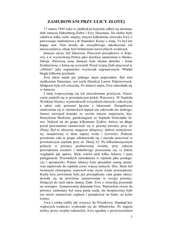 ZAMUROWANI PRZY ULICY ZŁOTE] 17 marca 1945 roku w siedleckim kościele odbył się skromny ślub Janusza Hakenberg-Żubra i Ewy Hausman. Na ślubie było zaledwie kilka osób, między innymi kilkuletnia córeczka Ewy z pierwszego małżeństwa i dr Stanisław Kussy z żoną. To był ten happy end. Nim doszło do szczęśliwego zakończenia ich narzeczeństwa, oboje byli bohaterami niezwykłych wydarzeń. Janusza ojciec był lekarzem. Pracował początkowo w Kijowie, a w wyzwolonej Polsce jako dyrektor sanatorium w BuskoZdroju. Pierwszą żoną Janusza była słynna aktorka - Irena Eichlerówna, z którą się rozwiódł. Przed wojną Żubr pracował w „Orbisie" jako organizator wycieczek zagranicznych. Władał biegle kilkoma językami. Ewa także miała już jednego męża poprzednio. Był nim siedlczanin Hausman, syn szefa Dyrekcji Lasów Państwowych. Małgosia była ich córeczką. Po śmierci męża, Ewa zakochała się w Januszu. I tutaj rozpoczynają się ich niecodzienne przeżycia. Narzeczeni znaleźli się w powstańczym piekle Warszawy. W Szpitalu Wolskim Niemcy wymordowali wszystkich chorych i zdrowych, a także cały personel łącznie z lekarzami. Perspektywa znalezienia się w niemieckich łapach nie rokowała nic dobrego. Janusz nawiązał kontakt ze swoim starym znajomym, doc. Henrykiem Beckiem, ginekologiem ze Szpitala Dzieciątka Jezus. Należał on do grupy kilkunastu Żydów, którzy na długo przed powstaniem zamurowali się w pewnej piwnicy przy ul. Złotej. Był to obszerny magazyn sklepowy, dobrze wentylowany, zaopatrzony w duże zapasy wody i żywności. Podczas powstania cała ta grupa odmurowała się i zaczęła pracować w powstańczym szpitalu przy ul. Złotej 22. Po kilkumiesięcznym pobycie w piwnicy pozbawionej światła, przy zakazie prowadzenia rozmów i hałaśliwego poruszania się, ci ludzie wyglądali jak upiory. Było wśród nich kilku lekarzy i parę pielęgniarek. Pozostałych zatrudniono w szpitalu jako posługaczy i sprzątaczki. Pomoc lekarzy była specjalnie cenną, ponieważ napływało do szpitala coraz więcej rannych. Doc. Beck był świetnym chirurgiem, uratował więc życie wielu powstańcom. Kiedy losy powstania były już przesądzone, cała grupa zdecydowała się na powtórne zamurowanie w swojej piwnicy. Dołączył do nich także Janusz Żubr. Ewa z córeczką pozostały na zewnątrz. Zamurowania dokonała Ewa. Wprawdzie otwór do piwnicy zasłonięty był starą pustą szafą, ale bezpieczniej było ten otwór zamurować cegłami i pomalować na biało, na kolor ściany. Ewa z córką trafiły jak wszyscy do Pruszkowa. Stamtąd bez większych trudności wydostała się do Milanówka. Po zajęciu stolicy przez wojska radzieckie, Ewa zgodnie z przyrzeczeniem 1 pośpieszyła na ulicę Złotą. Dom nie został zburzony, ale niestety miał już nowych lokatorów, żołnierzy z NKWD. Nie było innego wyjścia, komendant grupy musiał się o wszystkim dowiedzieć. Kiedy otworzyli mur piwniczny, zobaczyli ludzi w stanie ostatecznego wyczerpania. Chudzi i głodni, słaniający się na nogach, z obłędem w oczach. Tych wszystkich ludzi umieszczono w domu przy ul. Fortecznej. Powoli zaczęli przychodzić do siebie. Janusz uciekł stamtąd po kilku dniach. Po zawarciu ślubu z Ewą w Siedlcach, oboje z córką wyjechali do Gdyni, gdzie pracowali przez jakiś czas w kawiarni „Pluton". Do kawiarni przychodzili marynarze szwedzcy, między innymi i tacy, którzy zajmowali się zawodowo przemycaniem ludzi do swojego kraju. Takim statkiem przemytniczym był „Iwan". Przemycał ludzi, dzieła sztuki i towary. Kucharz tego statku zaopiekował się Żubrami i za niewielką opłatą zawiózł ich do Szwecji. Żubrów poznałem w Szwecji. Pracowaliśmy razem w fabryce „Papyrus" koło Geteborga. Wyrobiłem im wizy imigracyjne do Wenezueli. Popłynęliśmy tam w różnym czasie i na innych statkach. Spotkaliśmy się ponownie w Caracas. Ale to już całkiem inna historia. 2