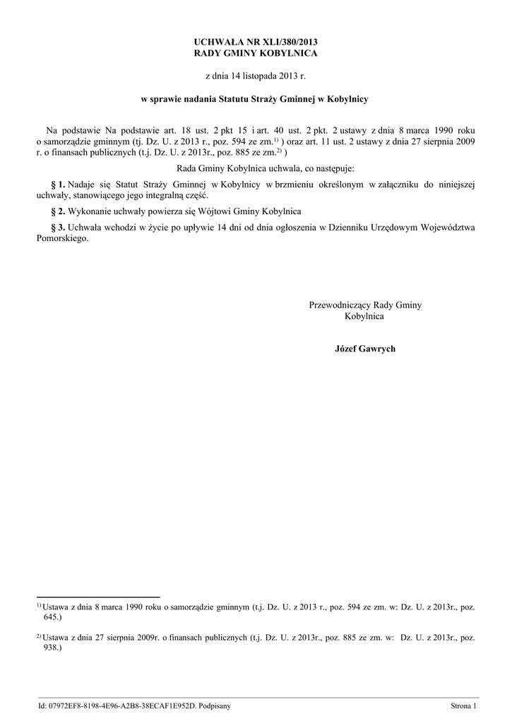 UCHWAŁA NR XLI/380/2013 RADY GMINY KOBYLNICA z dnia 14 listopada 2013 r. w sprawie nadania Statutu Straży Gminnej w Kobylnicy Na podstawie Na podstawie art. 18 ust. 2 pkt 15 i art. 40 ust. 2 pkt. 2 ustawy z dnia 8 marca 1990 roku o samorządzie gminnym (tj. Dz. U. z 2013 r., poz. 594 ze zm.1) ) oraz art. 11 ust. 2 ustawy z dnia 27 sierpnia 2009 r. o finansach publicznych (t.j. Dz. U. z 2013r., poz. 885 ze zm.2) ) Rada Gminy Kobylnica uchwala, co następuje: § 1. Nadaje się Statut Straży Gminnej w Kobylnicy w brzmieniu określonym w załączniku do niniejszej uchwały, stanowiącego jego integralną część. § 2. Wykonanie uchwały powierza się Wójtowi Gminy Kobylnica § 3. Uchwała wchodzi w życie po upływie 14 dni od dnia ogłoszenia w Dzienniku Urzędowym Województwa Pomorskiego. Przewodniczący Rady Gminy Kobylnica Józef Gawrych 1) Ustawa z dnia 8 marca 1990 roku o samorządzie gminnym (t.j. Dz. U. z 2013 r., poz. 594 ze zm. w: Dz. U. z 2013r., poz. 645.) 2) Ustawa z dnia 27 sierpnia 2009r. o finansach publicznych (t.j. Dz. U. z 2013r., poz. 885 ze zm. w: Dz. U. z 2013r., poz. 938.) ————————————————————————————————————————————————————————— Id: 07972EF8-8198-4E96-A2B8-38ECAF1E952D. Podpisany Strona 1 Załącznik Nr 1 do Uchwały Nr XLI/380/2013 Rady Gminy Kobylnica z dnia 14 listopada 2013 r. STATUT STRAŻY GMINNEJ W KOBYLNICY Rozdział 1. Postanowienie ogólne § 1. 1. Straż Gminna w Kobylnicy, zwana dalej Strażą Gminną, jest umundurowaną formacją ochrony porządku publicznego Gminy Kobylnica. utworzoną do 2. Straż jest jednostką organizacyjną Gminy Kobylnica. § 2. 1. Terenem działania straży jest obszar administracyjny Gminy Kobylnica. 2. Straż używa pieczęci: 1) okrągłej o treści „Straż Gminna w Kobylnicy” z wizerunkiem godła państwowego, 2) prostokątnej o treści „Straż Gminna w Kobylnicy”. Rozdział 2. Mienie i gospodarka finansowa § 3. Składniki majątkowe przekazane do użytkowania przy realizacji ustawowych i regulowanych zadań Straży Gminnej stanowią mienie komunalne Gminy Kobylnica. § 4. 1. Straż Gminna prowadzi gospodarkę finansową według zasad określonych dla jednostek budżetowych. 2. Podstawą gospodarki finansowej jednostki jest roczny plan finansowy obejmujący dochody i wydatki. 3. Jednostka prowadzi rachunkowość oraz sprawozdawczość zgodnie z obowiązującymi przepisami dotyczącymi jednostek budżetowych. Rozdział 3. Przedmiot działalności § 5. Straż Gminna spełnia służebną rolę wobec społeczności lokalnej, wykonuje swoje zadania z poszanowaniem godności i praw obywateli. § 6. Straż Gminna wykonuje zadania w zakresie ochrony porządku publicznego przewidziane w ustawie z dnia 29 sierpnia 1997r. o strażach gminnych ( Dz. U. Nr 123, poz. 779 z poźń. zm.), w innych przepisach oraz aktach prawa miejscowego, § 7. 1. Zadania, o których mowa w paragrafie 6 wykonują pracownicy Straży Gminnej, zwani dalej „strażnikami”. 2. Zadania związane z obsługą administracyjni, nie będący strażnikami. administracyjno-gospodarczą i finansową wykonują pracownicy 3. Organizację i zasady funkcjonowania Straży Gminnej określa regulamin. § 8. Straż Gminna, realizując zadania ustawowe i statutowe: 1. Działa samodzielnie bądź wspólnie z przedstawicielami innych organów w zakresie określonym przez Wójta Gminy Kobylnica i Komendanta Straży Gminnej, 2. Współpracuje z Policją oraz innymi służbami, instytucjami prowadzącymi działalność na rzecz poprawy bezpieczeństwa i porządku publicznego. Rozdział 4. Organizacja Straży § 9. 1. Strażą kieruje Komendant i reprezentuje ją na zewnątrz. ————————————————————————————————————————————————————————— Id: 07972EF8-8198-4E96-A2B8-38ECAF1E952D. Podpisany Strona 1 2. Komendant organizuje i kieruje pracą strażników oraz odpowiada za prawidłowe wykonywanie przez nich zadań. 3. Komendant jest przełożonym strażników i pracowników administracyjnych. § 10. Szczegółowe zakresy czynności na poszczególnych stanowiskach oraz sposób ich wykonywania określa Komendant straży. Rozdział 5. Uprawnienia i obowiązki funkcjonariuszy Straży § 11. Prawa i obowiązki funkcjonariuszy straży regulują przepisy ustawy o strażach gminnych i ustawy o pracownikach samorządowych. § 12. Podczas wykonywania czynności służbowych funkcjonariusze straży korzystają z ochrony prawnej przewidzianej dla funkcjonariuszy publicznych. § 13. 1. Funkcjonariusze straży podczas wykonywania czynności służbowych obowiązani są do noszenia przepisowego umundurowania i legitymacji służbowej oraz znaku identyfikacyjnego. 2. Funkcjonariusz straży, przystępując do czynności służbowych, jest obowiązany podać imię i nazwisko, a ponadto na żądanie osoby, której te dotyczą, okazać legitymację służbową w sposób umożliwiający odczytanie (zapisanie) nazwiska funkcjonariusza oraz organu wydającego legitymację. Rozdział 6. Postanowienia końcowe § 14. 1. Nadzór nad działalnością straży sprawuje: Wójt Gminy Kobylnica. 2. W zakresie określonym w ustawie o strażach gminnych nadzór na działalnością straży sprawuje Wojewoda przy pomocy Komendanta Wojewódzkiego Policji w Gdańsku, działającego w jego imieniu. § 15. Dokonywanie zmian w statucie Straży Gminnej następuje w trybie jego nadania przez Radę Gminy Kobylnica. ————————————————————————————————————————————————————————— Id: 07972EF8-8198-4E96-A2B8-38ECAF1E952D. Podpisany Strona 2