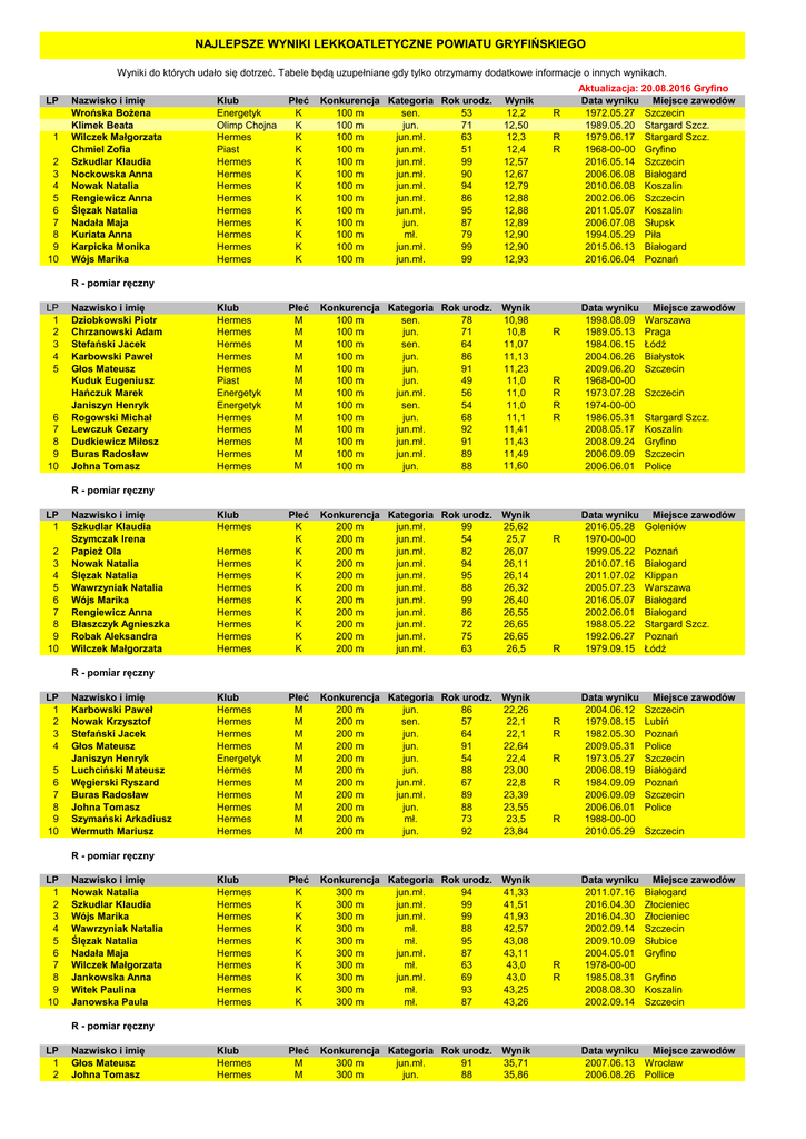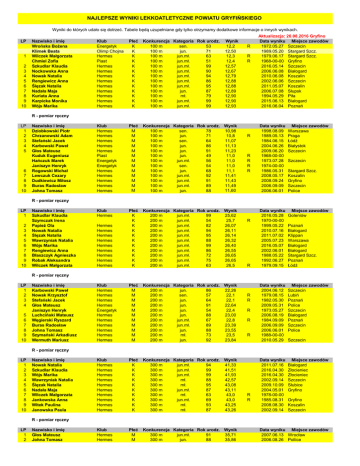 NAJLEPSZE WYNIKI LEKKOATLETYCZNE POWIATU GRYFIŃSKIEGO Wyniki do których udało się dotrzeć. Tabele będą uzupełniane gdy tylko otrzymamy dodatkowe informacje o innych wynikach. LP 1 2 3 4 5 6 7 8 9 10 Nazwisko i imię Wrońska Bożena Klimek Beata Wilczek Małgorzata Chmiel Zofia Szkudlar Klaudia Nockowska Anna Nowak Natalia Rengiewicz Anna Ślęzak Natalia Nadała Maja Kuriata Anna Karpicka Monika Wójs Marika Klub Energetyk Olimp Chojna Hermes Piast Hermes Hermes Hermes Hermes Hermes Hermes Hermes Hermes Hermes Płeć K K K K K K K K K K K K K Konkurencja Kategoria Rok urodz. 100 m sen. 53 100 m jun. 71 100 m jun.mł. 63 100 m jun.mł. 51 100 m jun.mł. 99 100 m jun.mł. 90 100 m jun.mł. 94 100 m jun.mł. 86 100 m jun.mł. 95 100 m jun. 87 100 m mł. 79 100 m jun.mł. 99 100 m jun.mł. 99 Klub Hermes Hermes Hermes Hermes Hermes Piast Energetyk Energetyk Hermes Hermes Hermes Hermes Hermes Płeć M M M M M M M M M M M M M Konkurencja Kategoria Rok urodz. Wynik 100 m sen. 78 10,98 100 m jun. 71 10,8 100 m sen. 64 11,07 100 m jun. 86 11,13 100 m jun. 91 11,23 100 m jun. 49 11,0 100 m jun.mł. 56 11,0 100 m sen. 54 11,0 100 m jun. 68 11,1 100 m jun.mł. 92 11,41 100 m jun.mł. 91 11,43 100 m jun.mł. 89 11,49 11,60 100 m jun. 88 Klub Hermes Hermes Hermes Hermes Hermes Hermes Hermes Hermes Hermes Hermes Płeć K K K K K K K K K K K Konkurencja Kategoria Rok urodz. Wynik 200 m jun.mł. 99 25,62 200 m jun.mł. 54 25,7 200 m jun.mł. 82 26,07 200 m jun.mł. 94 26,11 200 m jun.mł. 95 26,14 200 m jun.mł. 88 26,32 200 m jun.mł. 99 26,40 200 m jun.mł. 86 26,55 200 m jun.mł. 72 26,65 200 m jun.mł. 75 26,65 200 m jun.mł. 63 26,5 Klub Hermes Hermes Hermes Hermes Energetyk Hermes Hermes Hermes Hermes Hermes Hermes Płeć M M M M M M M M M M M Konkurencja Kategoria Rok urodz. Wynik 200 m jun. 86 22,26 200 m sen. 57 22,1 200 m jun. 64 22,1 200 m jun. 91 22,64 200 m jun. 54 22,4 200 m jun. 88 23,00 200 m jun.mł. 67 22,8 200 m jun.mł. 89 23,39 200 m jun. 88 23,55 200 m mł. 73 23,5 200 m jun. 92 23,84 Klub Hermes Hermes Hermes Hermes Hermes Hermes Hermes Hermes Hermes Hermes Płeć K K K K K K K K K K Konkurencja Kategoria Rok urodz. Wynik 300 m jun.mł. 94 41,33 300 m jun.mł. 99 41,51 300 m jun.mł. 99 41,93 300 m mł. 88 42,57 300 m mł. 95 43,08 300 m jun.mł. 87 43,11 300 m mł. 63 43,0 300 m jun.mł. 69 43,0 300 m mł. 93 43,25 300 m mł. 87 43,26 Klub Hermes Hermes Płeć M M Konkurencja Kategoria Rok urodz. Wynik 300 m jun.mł. 91 35,71 300 m jun. 88 35,86 Wynik 12,2 12,50 12,3 12,4 12,57 12,67 12,79 12,88 12,88 12,89 12,90 12,90 12,93 R R R Aktualizacja: 20.08.2016 Gryfino Data wyniku Miejsce zawodów 1972.05.27 Szczecin 1989.05.20 Stargard Szcz. 1979.06.17 Stargard Szcz. 1968-00-00 Gryfino 2016.05.14 Szczecin 2006.06.08 Białogard 2010.06.08 Koszalin 2002.06.06 Szczecin 2011.05.07 Koszalin 2006.07.08 Słupsk 1994.05.29 Piła 2015.06.13 Białogard 2016.06.04 Poznań R - pomiar ręczny LP 1 2 3 4 5 6 7 8 9 10 Nazwisko i imię Dziobkowski Piotr Chrzanowski Adam Stefański Jacek Karbowski Paweł Głos Mateusz Kuduk Eugeniusz Hańczuk Marek Janiszyn Henryk Rogowski Michał Lewczuk Cezary Dudkiewicz Miłosz Buras Radosław Johna Tomasz R R R R R Data wyniku 1998.08.09 1989.05.13 1984.06.15 2004.06.26 2009.06.20 1968-00-00 1973.07.28 1974-00-00 1986.05.31 2008.05.17 2008.09.24 2006.09.09 2006.06.01 Miejsce zawodów Warszawa Praga Łódź Białystok Szczecin Data wyniku 2016.05.28 1970-00-00 1999.05.22 2010.07.16 2011.07.02 2005.07.23 2016.05.07 2002.06.01 1988.05.22 1992.06.27 1979.09.15 Miejsce zawodów Goleniów Data wyniku 2004.06.12 1979.08.15 1982.05.30 2009.05.31 1973.05.27 2006.08.19 1984.09.09 2006.09.09 2006.06.01 1988-00-00 2010.05.29 Miejsce zawodów Szczecin Lubiń Poznań Police Szczecin Białogard Poznań Szczecin Police Data wyniku 2011.07.16 2016.04.30 2016.04.30 2002.09.14 2009.10.09 2004.05.01 1978-00-00 1985.08.31 2008.08.30 2002.09.14 Miejsce zawodów Białogard Złocieniec Złocieniec Szczecin Słubice Gryfino Szczecin Stargard Szcz. Koszalin Gryfino Szczecin Police R - pomiar ręczny LP 1 2 3 4 5 6 7 8 9 10 Nazwisko i imię Szkudlar Klaudia Szymczak Irena Papież Ola Nowak Natalia Ślęzak Natalia Wawrzyniak Natalia Wójs Marika Rengiewicz Anna Błaszczyk Agnieszka Robak Aleksandra Wilczek Małgorzata R R Poznań Białogard Klippan Warszawa Białogard Białogard Stargard Szcz. Poznań Łódź R - pomiar ręczny LP 1 2 3 4 5 6 7 8 9 10 Nazwisko i imię Karbowski Paweł Nowak Krzysztof Stefański Jacek Głos Mateusz Janiszyn Henryk Luchciński Mateusz Węgierski Ryszard Buras Radosław Johna Tomasz Szymański Arkadiusz Wermuth Mariusz R R R R R Szczecin R - pomiar ręczny LP 1 2 3 4 5 6 7 8 9 10 Nazwisko i imię Nowak Natalia Szkudlar Klaudia Wójs Marika Wawrzyniak Natalia Ślęzak Natalia Nadała Maja Wilczek Małgorzata Jankowska Anna Witek Paulina Janowska Paula R R Gryfino Koszalin Szczecin R - pomiar ręczny LP 1 2 Nazwisko i imię Głos Mateusz Johna Tomasz Data wyniku Miejsce zawodów 2007.06.13 Wrocław 2006.08.26 Pollice 3 4 5 6 7 8 9 10 Kluczyński Hubert Luchciński Mateusz Karbowski Paweł Chrzanowski Adam Łakomiec Rafał Glajc Tomasz Wolder Mirosław Cielecki Łukasz Hermes Hermes Hermes Hermes Hermes Hermes Hermes Hermes M M M M M M M M 300 m 300 m 300 m 300 m 300 m 300 m 300 m 300 m jun. jun. jun. mł. jun.mł. jun.mł. jun.mł. jun.mł. 97 88 86 71 98 75 71 87 36,61 36,66 36,75 37,11 37,16 37,6 37,7 37,95 Klub Hermes Hermes Hermes Hermes Hermes Hermes Hermes Hermes Hermes Hermes Płeć K K K K K K K K K K Konkurencja Kategoria Rok urodz. Wynik 400 m jun.mł. 94 57,95 400 m jun.mł. 90 59,54 400 m jun.mł. 69 59,77 400 m jun.mł. 95 59,95 400 m jun.mł. 82 60,02 400 m jun. 63 59,9 400 m jun.mł. 86 60,34 400 m jun. 86 60,61 400 m jun. 65 60,77 400 m jun.mł. 99 60,88 Klub Hermes Hermes Hermes Hermes Hermes Hermes Hermes Hermes Energetyk Energetyk Hermes Hermes Płeć M M M M M M M M M M M M M Konkurencja Kategoria Rok urodz. Wynik 400 m jun.mł. 71 49