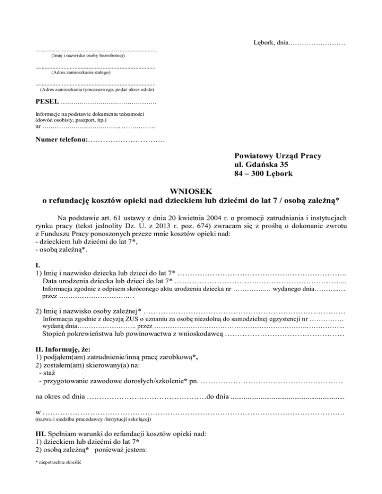 Lębork, dnia.…………………… .............................................................................. (Imię i nazwisko osoby bezrobotnej) ............................................................................. (Adres zamieszkania stałego) ............................................................................. (Adres zamieszkania tymczasowego, podać okres od-do) PESEL ………………………………………. Informacje na podstawie dokumentu tożsamości (dowód osobisty, paszport, itp.) nr ……………………………….. ……………. Numer telefonu:…………………………. Powiatowy Urząd Pracy ul. Gdańska 35 84 – 300 Lębork WNIOSEK o refundację kosztów opieki nad dzieckiem lub dziećmi do lat 7 / osobą zależną* Na podstawie art. 61 ustawy z dnia 20 kwietnia 2004 r. o promocji zatrudniania i instytucjach rynku pracy (tekst jednolity Dz. U. z 2013 r. poz. 674) zwracam się z prośbą o dokonanie zwrotu z Funduszu Pracy ponoszonych przeze mnie kosztów opieki nad: - dzieckiem lub dziećmi do lat 7*, - osobą zależną*. I. 1) Imię i nazwisko dziecka lub dzieci do lat 7* ………………………………………………………….. Data urodzenia dziecka lub dzieci do lat 7* …………………………….……………………………... Informacja zgodnie z odpisem skróconego aktu urodzenia dziecka nr …………..… wydanego dnia………..… przez ………………………….. . 2) Imię i nazwisko osoby zależnej* ……………………………………………………………………… Informacja zgodnie z decyzją ZUS o uznaniu za osobę niezdolną do samodzielnej egzystencji nr …………… wydaną dnia…………………….. przez ………………………………………………………….…………….. Stopień pokrewieństwa lub powinowactwa z wnioskodawcą ………………………………………… II. Informuję, że: 1) podjąłem(am) zatrudnienie/inną pracę zarobkową*, 2) zostałem(am) skierowany(a) na: - staż - przygotowanie zawodowe dorosłych/szkolenie* pn. ………………………………………………… na okres od dnia …………………………………………do dnia ............................................................. w …………………………………………………………………………………………………………. (nazwa i siedziba pracodawcy /instytucji szkolącej) III. Spełniam warunki do refundacji kosztów opieki nad: 1) dzieckiem lub dziećmi do lat 7* 2) osobą zależną* ponieważ jestem: * niepotrzebne skreślić - osobą stanu wolnego: panną /kawalerem, wdową/ wdowcem (informacja na podstawie aktu zgonu nr ………………………wydanego dnia………………….przez ………………..………………………..), rozwiedzioną/rozwiedzionym (informacja na podstawie sentencji wyroku nr …………………wydanego dnia………………….przez ……………………………..……………..); - osobą w stosunku, do której orzeczono prawomocnie separację (informacja na podstawie sentencji wyroku nr …………………wydanego dnia………………….przez …………………..…………………..); - osobą, której współmałżonek został pozbawiony prawomocnym wyrokiem praw rodzicielskich; (informacja na podstawie sentencji wyroku nr ………….……………wydanego dnia……………………. przez …………………………….……..); - osobą, której współmałżonek odbywa karę pozbawienia wolności (informacja na podstawie zaświadczenia z zakładu penitencjarnego o odbywaniu kary nr …………………wydanego dnia …………….. przez …………………………………..). IV. Miesięczny koszt opieki nad dzieckiem lub dziećmi do lat 7 / osobą zależną* wynosi ……..……zł., /słownie/ ……………......……………………………………………………………...… . V. Informuję, że miesięczne moje wynagrodzenie za pracę wynosi………………..….………..zł brutto /słownie/…………………………………lub inny przychód wynosi………………………….zł brutto, /słownie/…………………………………i nie przekraczają minimalnego wynagrodzenia za pracę. VI. Oświadczam, że znane są mi zasady refundacji kosztów opieki nad dzieckiem lub dziećmi do lat 7 /osobą zależną* w rozumieniu przepisów ustawy o promocji zatrudnienia i instytucjach rynku pracy. VII. Przyznaną kwotę refundacji kosztów opieki nad dzieckiem lub dziećmi do lat 7 / osobą zależną*, proszę przekazywać*: • na moje konto nr…….……………………………………………………………………………….… • pocztą na adres ………………………………………………………..……………………….……… • odbiorę osobiście w kasie Powiatowego Urzędu Pracy. Świadomy odpowiedzialności karnej za fałszywe zeznania z art. 233§1 kodeksu karnego, który brzmi: „Kto składając zeznania mające służyć za dowód w postępowaniu sądowym lub innym postępowaniu prowadzonym na podstawie ustawy, zeznaje nieprawdę lub zataja prawdę, podlega karze pozbawienia wolności do 3 lat ” oświadczam, że w/w dane są zgodne z prawdą . Załączniki: I. zwrot kosztów opieki nad dzieckiem lub dziećmi do lat 7: ♦ dowód osobisty osoby ubiegającej się o zwrot kosztów opieki nad dzieckiem lub dziećmi do lat 7 -do wglądu; ♦ odpis skróconego aktu urodzenia dziecka lub dzieci do lat 7 -do wglądu; ♦ w przypadku zatrudnienia: uwierzytelniona kserokopia umowy o pracę lub dokumentu potwierdzającego zawarcie umowy cywilno-prawnej /umowy zlecenia, umowy o dzieło/, umowy agencyjnej i itp.; ♦ uwierzytelniona kserokopia umowy cywilno-prawnej zawartej z osobą fizyczną sprawującą opiekę na dzieckiem lub dziećmi do lat 7 (spełniająca