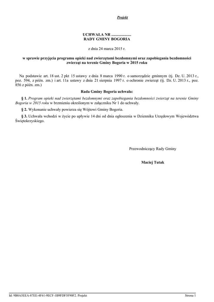 Projekt UCHWAŁA NR .................... RADY GMINY BOGORIA z dnia 24 marca 2015 r. w sprawie przyjęcia programu opieki nad zwierzętami bezdomnymi oraz zapobiegania bezdomności zwierząt na terenie Gminy Bogoria w 2015 roku Na podstawie art. 18 ust. 2 pkt 15 ustawy z dnia 8 marca 1990 r. o samorządzie gminnym (tj. Dz. U. 2013 r., poz. 594, z późn. zm.) i art. 11a ustawy z dnia 21 sierpnia 1997 r. o ochronie zwierząt (tj. Dz. U. 2013 r., poz. 856 z późn. zm.) Rada Gminy Bogoria uchwala: § 1. Program opieki nad zwierzętami bezdomnymi oraz zapobiegania bezdomności zwierząt na terenie Gminy Bogoria w 2015 roku w brzmieniu określonym w załączniku Nr 1 do uchwały. § 2. Wykonanie uchwały powierza się Wójtowi Gminy Bogoria. § 3. Uchwała wchodzi w życie po upływie 14 dni od dnia ogłoszenia w Dzienniku Urzędowym Województwa Świętokrzyskiego. Przewodniczący Rady Gminy Maciej Tutak Id: 9B0A5EEA-87EE-4F61-9ECF-1B9FDF5F90F2. Projekt Strona 1 Załącznik Nr 1do Uchwały Nr .................... Rady Gminy Bogoria z dnia 24 marca 2015 r. Program opieki nad zwierzętami bezdomnymi oraz zapobiegania bezdomności zwierząt na terenie Gminy Bogoria w 2015 roku Rozdział 1. POSTANOWIENIA OGÓLNE § 1. Ilekroć w uchwale jest mowa o: 1) Wójcie, należy przez to rozumieć Wójt Gminy Bogoria; 2) Gminie, należy przez to rozumieć Gminę Bogoria; 3) Urzędzie Gminy, należy przez to rozumieć Urząd Gminy w Bogorii, przy pomocy którego Wójt Gminy Bogoria wykonuje zadania określone w Programie; 4) Straży Gminnej, należy przez to rozumieć Straż Gminną w Bogorii; 5) wydzielonym miejscu przetrzymywania zwierząt, należy przez to rozumieć miejsce czasowego pobytu zwierząt nie będące schroniskiem; 6) zwierzętach bezdomnych, należy przez to rozumieć zwierzęta domowe lub gospodarskie, które uciekły, zabłąkały się lub zostały porzucone przez człowieka, a nie ma możliwości ustalenia ich właściciela lub innej osoby, pod której opieką trwale dotąd pozostawały; 7) zwierzętach domowych, należy przez to rozumieć zwierzęta tradycyjnie przebywające wraz z człowiekiem w jego domu lub odpowiednim pomieszczeniu, utrzymywane przez człowieka w charakterze jego towarzysza; 8) kotach wolno żyjących, należy przez to rozumieć koty urodzone lub żyjące na wolności (żyjące w otoczeniu człowieka w stanie dzikim); 9) Programie, należy przez to rozumieć Program opieki nad zwierzętami bezdomnymi oraz zapobiegania bezdomności zwierząt na terenie Gminy Bogoria w 2015 roku. Rozdział 2. CEL I ZADANIA PROGRAMU § 2. 1. Celem Programu jest zapobieganie bezdomności zwierząt na terenie Gminy Bogoria oraz opieka nad zwierzętami bezdomnymi. 2. Zadania priorytetowe Programu to: 1) zapewnienie bezdomnym zwierzętom miejsca w schronisku dla zwierząt; 2) sprawowanie opieki nad kotami wolno żyjącymi, w tym ich dokarmianie; 3) odławianie bezdomnych zwierząt; 4) ograniczanie populacji bezdomnych zwierząt poprzez obligatoryjną sterylizację i kastrację zwierząt domowych, w szczególności psów i kotów 5) poszukiwanie nowych właścicieli dla bezdomnych zwierząt; 6) usypianie ślepych miotów; 7) wskazanie gospodarstwa rolnego w celu zapewnienia miejsca dla zwierząt gospodarskich w przypadku złego traktowania zwierząt; 8) zapewnienie całodobowej opieki weterynaryjnej w przypadkach zdarzeń drogowych z udziałem zwierząt; 9) wskazanie wysokości środków finansowych przeznaczonych na jego realizację oraz sposób wydatkowania tych środków. Id: 9B0A5EEA-87EE-4F61-9ECF-1B9FDF5F90F2. Projekt Strona 1 Rozdział 3. REALIZACJA CELU I ZADAŃ PROGRAMU I. ZAPEWNIENIE BEZDOMNYM ZWIERZĘTOM MIEJSCA W SCHRONISKU DLA ZWIERZĄT § 3. 1. Wszystkim zwierzętom zagubionym, wałęsającym się, pozostającym bez właściciela lub odebranym na skutek zaniedbań i innych działań określonych w ustawie o ochronie zwierząt zostanie zapewnione miejsce w schronisku dla zwierząt. 2. Do czasu znalezienia miejsca w schronisku zwierzęta bezdomne będą umieszczane w wydzielonym miejscu czasowego przetrzymywania zwierząt bezdomnych w miejscowości Bogoria. 3. W celu zapewnienia zwierzętom bezdomnym właściwej opieki weterynaryjnej zostanie zawarta umowa z uprawnionym lekarzem weterynarii. 4. Z chwilą oddania do użytku schroniska dla zwierząt zlokalizowanego na terenie Gminy Iwaniska wybudowanego przez Ekologiczny Związek Gmin Dorzecza Koprzywianki, którego członkiem jest Gmina Bogoria zwierzęta bezdomne zostaną przekazane do w/w schroniska. II. OPIEKA NAD KOTAMI WOLNO ŻYJĄCYMI, W TYM ICH DOKARMIANIE § 4. Sprawowanie opieki nad kotami wolno żyjącymi, w tym ich dokarmianie realizowanie będzie poprzez: 1) podejmowanie przez uprawnionych pracowników Urzędu Gminy interwencji w sprawach kotów wolno żyjących (wyłapywanie i zapewnienie miejsca przetrzymywania) 2) współpracę z Gabinetami Weterynaryjnymi w przypadku zaistnienia potrzeby podjęcia leczenia kotów wolno żyjących (wydawania zleceń na ich leczenie i pokrycie kosztów ich leczenia z budżetu Gminy) 3) współpracę z opiekunami kotów wolno żyjących 4) zakup i wydawanie karmy społecznym opiekunom (karmicielom kotów) na koszt Gminy do wyczerpania środków finansowych przeznaczonych na ten cel w danym roku 5) prowadzenie przez Urząd rejestru społecznych opiekunów (karmicieli kotów) III. ODŁAWIANIE BEZDOMNYCH ZWIERZĄT § 5. 1. Odławianie bezdomnych psów i kotów prowadzone będzie przez wyznaczonych pracowników Urzędu, uprawnione podmioty wykonujące usługi odłowu i transportu oraz pomocniczo przez Straż Gminną oraz organizacja społeczne współpracujące z Urzędem. 2. Odławianie bezdomnych zwierząt będzie prowadzone za pomocą specjalistycznego sprzętu, który nie będzie stwarzał zagrożenia dla życia i zdrowia zwierząt, oraz nie będzie zadawał im cierpienia. IV. OGRANICZANIE POPULACJI BEZDOMNYCH ZWIERZĄT POPRZEZ OBLIGATORYJNĄ STERYLIZACJĘ I KASTRACJĘ ZWIERZĄT § 6
