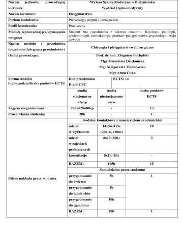 Nazwa jednostki Wyższa Szkoła Medyczna w Białymstoku prowadzącej kierunek: Wydział Ogólnomedyczny Nazwa kierunku: Pielęgniarstwo Poziom kształcenia: Pierwszego stopnia (licencjackie) Profil kształcenia: Praktyczny Moduły wprowadzające/wymagania Student zna zagadnienia z zakresu anatomii, fizjologii, patologii, epidemiologii, farmakologii, podstaw pielęgniarstwa, psychologii, etyki wstępne: zawodu Nazwa modułu / przedmiotu Chirurgia i pielęgniarstwo chirurgiczne (przedmiot lub grupa przedmiotów) Osoby prowadzące: Prof. dr hab. Zbigniew Puchalski Mgr Mirosława Dziekońska Mgr Małgorzata Malinowska Mgr Anna Citko Forma studiów liczba godzin/liczba punktów ECTS Kod przedmiotu ECTS: 14 P-1-P-CPC studia studia liczba punktów stacjonarne niestacjonarne ECTS w/s/zp w/ćw Zajęcia zorganizowane: 70hw/20s/80zp - 13 Praca własna studenta: 20h - 1 Godziny kontaktowe z nauczycielem akademickim udział w wykładach udział 14x5w/4x5s 10 (70h)w, (20h)s 8x10 (80h) 3 5x1h (5h) - 195h 13 w zajęciach praktycznych konsultacje RAZEM: Samodzielna praca studenta: Bilans nakładu pracy studenta przygotowanie 5h 1 do ćwiczeń przygotowanie 5h do kolokwiów przygotowanie 10h do egzaminu RAZEM: 20h 1 Cele modułu: • Zdobycie przez studenta zasobu wiadomości i umiejętności z zakresu chirurgii i pielęgniarstwa chirurgicznego • Wyposażenie studenta w wiedzę z zakresu pielęgnowania pacjentów leczonych chirurgicznie • Przygotowanie do pełnienia roli edukacyjnej wobec pacjenta i jego środowiska z uwzględnieniem istoty schorzenia i metod leczenia chirurgicznego Efekty kształcenia: Przedmiotowy efekt kształcenia Efekty kształcenia Odniesienie do kierunkowych efektów kształcenia Wiedza EKP_W01. EKP_W02. EKP_W03. EKP_W04. EKP_W05. EKP_W06. EKP_W07. EKP_W08. EKP_W09. EKP_W10. EKP_W11. EKP_W12. charakteryzuje czynniki ryzyka i zagrożeń zdrowotnych pacjentów w różnym wieku i stanie zdrowia; wyjaśnia etiopatogenezę, objawy kliniczne, przebieg, leczenie, rokowanie i opiekę pielęgniarską w schorzeniach: układu krążenia (serca, naczyń krwionośnych), układu oddechowego, układu nerwowego, układu pokarmowego (żołądka, jelit, wielkich gruczołów), wątroby, trzustki, układu moczowego (nerek i pęcherza moczowego), układu kostnostawowego, mięśni, układu dokrewnego oraz krwi; zna zasady oceny stanu chorego w zależności od wieku; zna zasady przygotowania, opieki w trakcie oraz po badaniach i zabiegach diagnostycznych wykonywanych u pacjentów w różnym wieku i stanie zdrowia; charakteryzuje grupy leków i ich działanie na układy i narządy chorego w różnych schorzeniach, w zależności od wieku i stanu zdrowia, z uwzględnieniem działań niepożądanych, interakcji z innymi lekami i dróg podania; zna zasady oceny stanu chorego w zależności od wieku; wyjaśnia etiopatogenezę, objawy kliniczne, przebieg, leczenie, rokowanie i opiekę pielęgniarską w schorzeniach: układu krążenia (serca, naczyń krwionośnych), układu oddechowego, układu nerwowego, układu pokarmowego (żołądka, jelit, wielkich gruczołów), wątroby, trzustki, układu moczowego (nerek i pęcherza moczowego), układu kostnostawowego, mięśni, układu dokrewnego oraz krwi; zna zasady żywienia chorych, z uwzględnieniem leczenia dietetycznego, wskazań przed- i pooperacyjnych; charakteryzuje czynniki zwiększające ryzyko okołooperacyjne; zna zasady przygotowania pacjenta do zabiegu operacyjnego w trybie pilnym i planowym oraz w chirurgii jednego dnia; zna kierunki obserwacji pacjenta po zabiegu operacyjnym, w celu zapobiegania wczesnym i późnym powikłaniom; wymienia objawy, charakteryzuje przebieg i D.W2. D.W3. D.W4. D.W7. D.W8. D.W10. D.W18. D.W30. D.W31. D.W32. D.W33. D.W34. EKP_W13. sposoby postępowania w określonych jednostkach chorobowych leczonych chirurgicznie; Wyjaśnia działania zintegrowanego systemu opieki stomijnej i innych stowarzyszeń na rzecz zdrowia D.W35 Umiejętności EKP_U01. EKP_U02. EKP_U03. EKP_U04. EKP_U05. EKP_U06. EKP_U07. EKP_U08. EKP_U09. EKP_U10. EKP_U11. EKP_U12. EKP_U13. gromadzi informacje, formułuje diagnozę pielęgniarską, ustala cele i plan opieki, wdraża interwencje pielęgniarskie oraz dokonuje ewaluacji opieki; prowadzi profilaktykę powikłań w przebiegu chorób; organizuje izolację chorych zakaźnie w miejscach publicznych i warunkach domowych diagnozuje stopień ryzyka rozwoju odleżyn i dokonuje ich klasyfikacji; pobiera materiał do badań diagnostycznych; D.U1. ocenia stan ogólny pacjenta w kierunku powikłań po specjalistycznych badaniach diagnostycznych i powikłań pooperacyjnych; doraźnie podaje tlen, modyfikuje dawkę stałą insuliny szybko i krótko działającej; przygotowuje chorego do badań diagnostycznych pod względem fizycznym i psychicznym; doraźnie unieruchamia złamania kości, zwichnięcia i skręcenia oraz przygotowuje pacjenta do transportu; przekazuje informacje o stanie zdrowia chorego członkom zespołu terapeutycznego; prowadzi, dokumentuje i ocenia bilans płynów pacjenta prowadzi dokumentację opieki nad chorym: kartę obserwacji, zabiegów pielęgniarskich i raportów, kartę rejestru zakażeń szpitalnych, profilaktyki i leczenia odleżyn oraz kartę informacyjną z zaleceniami w zakresie samoopieki; ocenia poziom bólu, reakcję chorego na ból i nasilenie bólu oraz stosuje postępowanie przeciwbólowe; D.U10. D.U5. D.U6. D.U8. D.U9. D.U11. D.U12. D.U14. D.U26. D.U25 D.U28. D.U29. Kompetencje społeczne EKP_ K01. EKP_ K02. EKP_ K03. EKP_ K04. EKP_ K05. EKP_ K06. EKP_ K07. szanuje godność i autonomię osób powierzonych opiece; systematycznie wzbogaca wiedzę zawodową i kształtuje umiejętności, dążąc do profesjonalizmu; wykazuje odpowiedzialność moralną za człowieka i wykonywanie zadań zawodowych; przestrzega praw pacjenta; rzetelnie i dokładnie wykonuje powierzone obowiązki zawodowe; przestrzega tajemnicy zawodowej; współdziała w ramach zespołu interdyscyplinarnego w ro