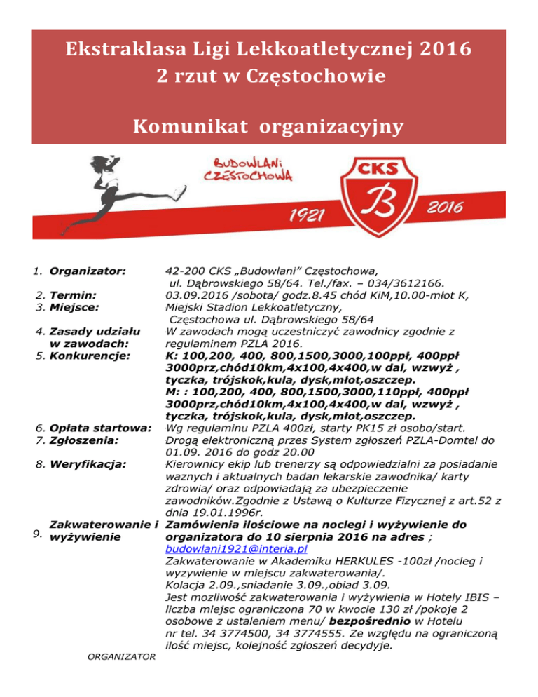 Ekstraklasa Ligi Lekkoatletycznej 2016 2 rzut w Częstochowie Komunikat organizacyjny 1. Organizator: -42-200 CKS „Budowlani” Częstochowa, ul. Dąbrowskiego 58/64. Tel./fax. – 034/3612166. 2. Termin: -03.09.2016 /sobota/ godz.8.45 chód KiM,10.00-młot K, 3. Miejsce: -Miejski Stadion Lekkoatletyczny, Częstochowa ul. Dąbrowskiego 58/64 4. Zasady udziału -W zawodach mogą uczestniczyć zawodnicy zgodnie z w zawodach: regulaminem PZLA 2016. 5. Konkurencje: -K: 100,200, 400, 800,1500,3000,100ppł, 400ppł 3000prz,chód10km,4x100,4x400,w dal, wzwyż , tyczka, trójskok,kula, dysk,młot,oszczep. M: : 100,200, 400, 800,1500,3000,110ppł, 400ppł 3000prz,chód10km,4x100,4x400,w dal, wzwyż , tyczka, trójskok,kula, dysk,młot,oszczep. 6. Opłata startowa: -Wg regulaminu PZLA 400zł, starty PK15 zł osobo/start. 7. Zgłoszenia: -Drogą elektroniczną przes System zgłoszeń PZLA-Domtel do 01.09. 2016 do godz 20.00 8. Weryfikacja: -Kierownicy ekip lub trenerzy są odpowiedzialni za posiadanie waznych i aktualnych badan lekarskie zawodnika/ karty zdrowia/ oraz odpowiadają za ubezpieczenie zawodników.Zgodnie z Ustawą o Kulturze Fizycznej z art.52 z dnia 19.01.1996r. Zakwaterowanie i Zamówienia ilościowe na noclegi i wyżywienie do 9. wyżywienie organizatora do 10 sierpnia 2016 na adres ; [email protected] Zakwaterowanie w Akademiku HERKULES -100zł /nocleg i wyzywienie w miejscu zakwaterowania/. Kolacja 2.09.,sniadanie 3.09.,obiad 3.09. Jest mozliwość zakwaterowania i wyżywienia w Hotely IBIS – liczba miejsc ograniczona 70 w kwocie 130 zł /pokoje 2 osobowe z ustaleniem menu/ bezpośrednio w Hotelu nr tel. 34 3774500, 34 3774555. Ze względu na ograniczoną ilość miejsc, kolejność zgłoszeń decydyje. ORGANIZATOR