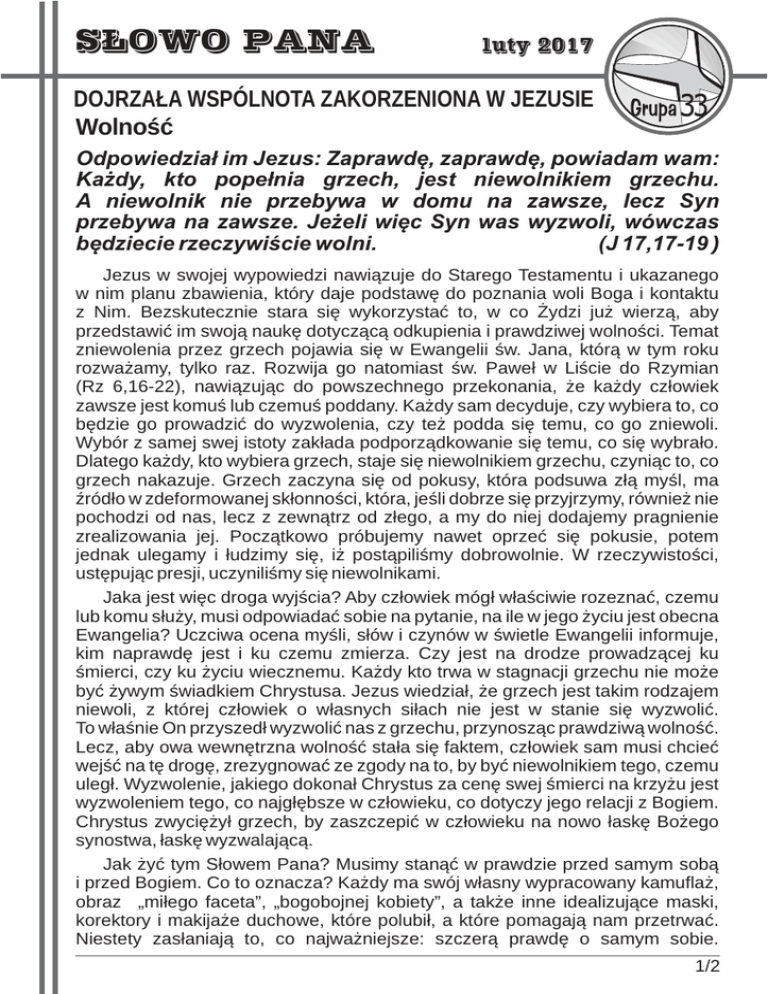 SŁOWO PANA luty 2017 DOJRZAŁA WSPÓLNOTA ZAKORZENIONA W JEZUSIE Wolność Odpowiedział im Jezus: Zaprawdę, zaprawdę, powiadam wam: Każdy, kto popełnia grzech, jest niewolnikiem grzechu. A niewolnik nie przebywa w domu na zawsze, lecz Syn przebywa na zawsze. Jeżeli więc Syn was wyzwoli, wówczas będziecie rzeczywiście wolni. (J 17,17-19 ) Jezus w swojej wypowiedzi nawiązuje do Starego Testamentu i ukazanego w nim planu zbawienia, który daje podstawę do poznania woli Boga i kontaktu z Nim. Bezskutecznie stara się wykorzystać to, w co Żydzi już wierzą, aby przedstawić im swoją naukę dotyczącą odkupienia i prawdziwej wolności. Temat zniewolenia przez grzech pojawia się w Ewangelii św. Jana, którą w tym roku rozważamy, tylko raz. Rozwija go natomiast św. Paweł w Liście do Rzymian (Rz 6,16-22), nawiązując do powszechnego przekonania, że każdy człowiek zawsze jest komuś lub czemuś poddany. Każdy sam decyduje, czy wybiera to, co będzie go prowadzić do wyzwolenia, czy też podda się temu, co go zniewoli. Wybór z samej swej istoty zakłada podporządkowanie się temu, co się wybrało. Dlatego każdy, kto wybiera grzech, staje się niewolnikiem grzechu, czyniąc to, co grzech nakazuje. Grzech zaczyna się od pokusy, która podsuwa złą myśl, ma źródło w zdeformowanej skłonności, która, jeśli dobrze się przyjrzymy, również nie pochodzi od nas, lecz z zewnątrz od złego, a my do niej dodajemy pragnienie zrealizowania jej. Początkowo próbujemy nawet oprzeć się pokusie, potem jednak ulegamy i łudzimy się, iż postąpiliśmy dobrowolnie. W rzeczywistości, ustępując presji, uczyniliśmy się niewolnikami. Jaka jest więc droga wyjścia? Aby człowiek mógł właściwie rozeznać, czemu lub komu służy, musi odpowiadać sobie na pytanie, na ile w jego życiu jest obecna Ewangelia? Uczciwa ocena myśli, słów i czynów w świetle Ewangelii informuje, kim naprawdę jest i ku czemu zmierza. Czy jest na drodze prowadzącej ku śmierci, czy ku życiu wiecznemu. Każdy kto trwa w stagnacji grzechu nie może być żywym świadkiem Chrystusa. Jezus wiedział, że grzech jest takim rodzajem niewoli, z której człowiek o własnych siłach nie jest w stanie się wyzwolić. To właśnie On przyszedł wyzwolić nas z grzechu, przynosząc prawdziwą wolność. Lecz, aby owa wewnętrzna wolność stała się faktem, człowiek sam musi chcieć wejść na tę drogę, zrezygnować ze zgody na to, by być niewolnikiem tego, czemu uległ. Wyzwolenie, jakiego dokonał Chrystus za cenę swej śmierci na krzyżu jest wyzwoleniem tego, co najgłębsze w człowieku, co dotyczy jego relacji z Bogiem. Chrystus zwyciężył grzech, by zaszczepić w człowieku na nowo łaskę Bożego synostwa, łaskę wyzwalającą. Jak żyć tym Słowem Pana? Musimy stanąć w prawdzie przed samym sobą i przed Bogiem. Co to oznacza? Każdy ma swój własny wypracowany kamuflaż, obraz „miłego faceta”, „bogobojnej kobiety”, a także inne idealizujące maski, korektory i makijaże duchowe, które polubił, a które pomagają nam przetrwać. Niestety zasłaniają to, co najważniejsze: szczerą prawdę o samym sobie. 1/2 SŁOWO PANA Odpowiedział im Jezus: Zaprawdę, zaprawdę, powiadam wam: Każdy, kto popełnia grzech, jest niewolnikiem grzechu. A niewolnik nie przebywa w domu na zawsze, lecz Syn przebywa na zawsze. Jeżeli więc Syn was wyzwoli, wówczas będziecie rzeczywiście wolni. (J 17,17-19 ) Musimy je zrzucić, odłożyć na bok maski. Bóg nas zna lepiej od nas samych i nie musimy przed Nim niczego udawać. I w tym pomaga nam Jezus i wspólnota Jego uczniów żyjących w prawdzie. Jezus wyzwala szczególnie w sakramencie pokuty i pojednania tych, którzy mają na tyle odwagi, by przyznać się do tego, że coś w swoim życiu popsuli, że nie umieją wybaczyć krzywd doznanych od innych, czy nawet uważają się ze pokrzywdzonych przez Boga. Pan – jedyna Prawda wyzwala. Wypala stare blizny, opatruje krwawiące rany i pozwala im się zagoić. Stanąć w prawdzie to najprostsza droga do wolności. Mała grupa uczniów Jezusa jest szansą, by nie żyć w zakłamaniu. W naszych wzajemnych relacjach, w zaangażowaniu we wspólne dobro, w regularnym uczestnictwie w naszych wspólnych spotkaniach realizuje się życie w wolności dzieci Bożych. W Liście do Galatów słyszymy: „Miłością ożywieni służcie sobie wzajemnie!” (Ga 5,13). Oto droga do prawdziwej wolności: postawa służby i miłość wzajemna. Człowiek w pełni odnajduje siebie, jako istota wolna, tylko poprzez bezinteresowny dar z siebie samego dla Boga i dla swego brata. Świadectwo Wchodziliśmy do Grupy 33 uważając siebie za osoby wierzące, co do praktykujących było już gorzej: okazjonalne uczestniczenie we Mszy św. (święta, śluby, komunie), bycie w grupach dalekich od Kościoła, rzadka spowiedź, brak modlitwy. Praca w grupie - spotkania dużej grupy, w rejonie, małej grupie, rekolekcje, dni skupienia, wspólne pielgrzymki zmieniały nas. Jezus nas zmieniał. Coraz bardziej świadomie zaczęliśmy korzystać z sakramentów świętych, pojawiło się więcej modlitwy osobistej. Po kilku latach bycia w grupie inaczej patrzymy na grzech, rzeczywiście odczuwamy dyskomfort, uświadamiamy sobie, że jesteśmy niewolnikami grzechu. Bycie w grupie przyczyniło się do zmiany. Dostrzegamy wiele owoców naszej formacji: większa świadomość grzechu, szybciej korzystamy z sakramentu pojednania by w pełni uczestniczyć we Mszy św. „Przed przyjściem do grupy ze spowiedzią czekałam tradycyjnie miesiąc, nie przyjmując komunii.” – teraz mamy pragnienie przyjmowania Jezusa na każdej Mszy św., nie czekamy ze spowiedzią, ale szukamy jej od razu, zerwanie z towarzystwem dalekim od Boga czy muzyką heavy metalową, służba drugiemu człowiekowi (modlitwa, bank żywności, dzielenie się świadectwem życia). Świadectwa sióstr i braci z małej grupy mobilizują, do stałej pra