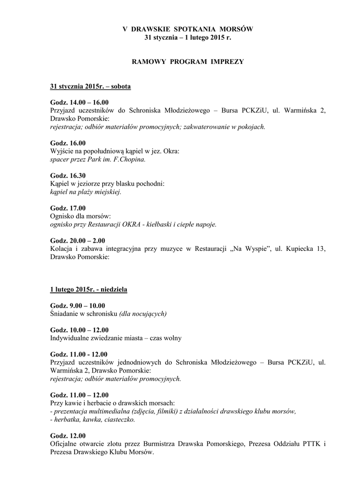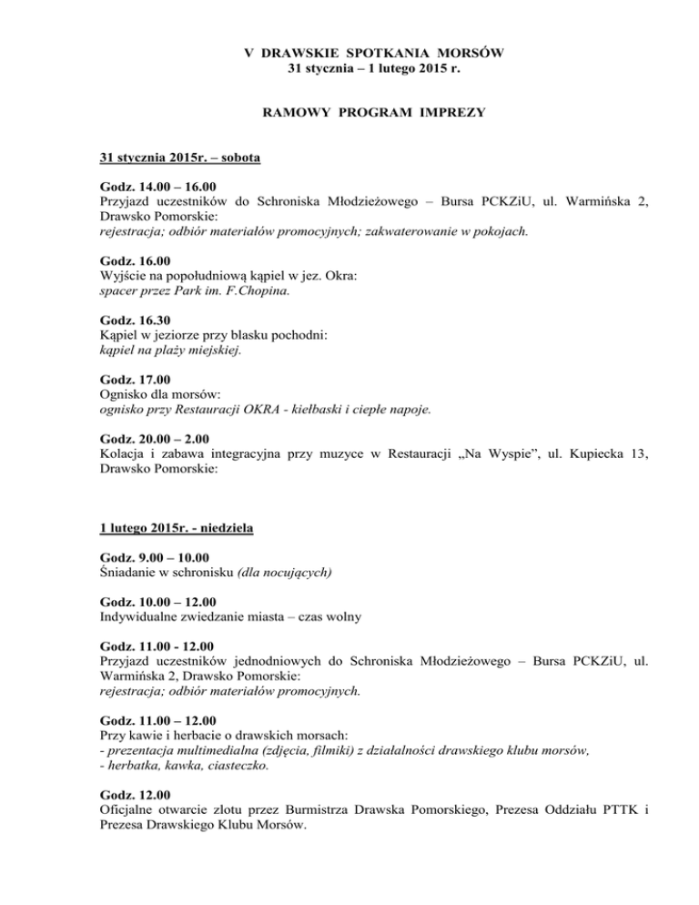 V DRAWSKIE SPOTKANIA MORSÓW 31 stycznia – 1 lutego 2015 r. RAMOWY PROGRAM IMPREZY 31 stycznia 2015r. – sobota Godz. 14.00 – 16.00 Przyjazd uczestników do Schroniska Młodzieżowego – Bursa PCKZiU, ul. Warmińska 2, Drawsko Pomorskie: rejestracja; odbiór materiałów promocyjnych; zakwaterowanie w pokojach. Godz. 16.00 Wyjście na popołudniową kąpiel w jez. Okra: spacer przez Park im. F.Chopina. Godz. 16.30 Kąpiel w jeziorze przy blasku pochodni: kąpiel na plaży miejskiej. Godz. 17.00 Ognisko dla morsów: ognisko przy Restauracji OKRA - kiełbaski i ciepłe napoje. Godz. 20.00 – 2.00 Kolacja i zabawa integracyjna przy muzyce w Restauracji „Na Wyspie”, ul. Kupiecka 13, Drawsko Pomorskie: 1 lutego 2015r. - niedziela Godz. 9.00 – 10.00 Śniadanie w schronisku (dla nocujących) Godz. 10.00 – 12.00 Indywidualne zwiedzanie miasta – czas wolny Godz. 11.00 - 12.00 Przyjazd uczestników jednodniowych do Schroniska Młodzieżowego – Bursa PCKZiU, ul. Warmińska 2, Drawsko Pomorskie: rejestracja; odbiór materiałów promocyjnych. Godz. 11.00 – 12.00 Przy kawie i herbacie o drawskich morsach: - prezentacja multimedialna (zdjęcia, filmiki) z działalności drawskiego klubu morsów, - herbatka, kawka, ciasteczko. Godz. 12.00 Oficjalne otwarcie zlotu przez Burmistrza Drawska Pomorskiego, Prezesa Oddziału PTTK i Prezesa Drawskiego Klubu Morsów. Godz. 12.15 „Parada morsów” - przemarsz uczestników przez miasto na plażę miejską nad jez. Okra trasa: Internat – Park Chopina – pomnik „czołgi” – ul. Obr. Westerplatte – ul. Sobieskiego – ul. Jeziorna – plaża miejska - ok. 4 km. Mile widziane flagi klubowe i przebrania. Godz. 13.00 Przygotowanie do kąpieli i wspólna rozgrzewka przy muzyce. Godz. 13.15 Kąpiel morsów w czystych i zimnych wodach jeziora Okra: kąpiemy się w przerębli (chyba, że pogoda spłata figla i jezioro nie będzie zamarznięte). Godz. 13.45 Zlotowe ognisko i poczęstunek dla wszystkich: - wręczenie dyplomów, pucharów i upominków, - „coś na ząb” – poczęstunek złożony z drawskich przysmaków, - grzane napoje, - miłe towarzystwo. Godz. 13.00 – 14.30 Imprezy towarzyszące kąpieli: - pokaz sprzętu Straży Pożarnej, - pokaz ratownictwa wodnego w wykonaniu Wodnego Ochotniczego Pogotowia Ratunkowego, - wystawa sprzętu i pokaz nurkowania podlodowego w wykonaniu Firmy ECN – systemy nurkowe (będzie możliwość zakupu butów i rękawic do morsowania). Godz. 15.00 albo i później Zakończenie zlotu. Organizatorzy: 1. Gmina Drawsko Pomorskie 2. PTTK Oddział w Drawsku Pomorskim 3. Drawski Klub Morsów Biuro Zlotu: Schronisko Młodzieżowe (Bursa PCKZiU) ul. Warmińska 2 , 78-500 Drawsko Pomorskie Kontakt: Mariusz Ziemecki – tel. 604 579 125 Paweł Górzyński – tel. 501 266 347