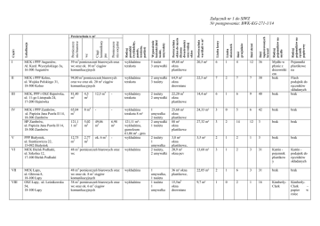 Załącznik nr 1 do SIWZ Nr postępowania: BWK-KG-271-1/14 Rodzaj posadzki (wykładziny, panele, terakota, parkiet) Wyposażenie łazienki (ilość toalet, umywalek) Powierzchnia okien do mycia (liczona dwustronnie) oraz rodzaj okien Powierzchnia wertikali w m² Liczba koszy Liczba niszczarek Ilość grzejników Ilość drzwi Ilość tapicerowanych krzeseł Rodzaj pojemników na mydło Rodzaj pojemników na ręcznik papierowy wykładzina terakota 5 toalet 3 umywalki 49,68 m² okna plastikowe 20,5 m² 6 1 4 12 36 Pojemniki plastikowe na II MCK i PPP Kolno, ul. Wojska Polskiego 31, 18-500 Kolno 94,80 m2 pomieszczeń biurowych oraz wc oraz ok. 20 m2 ciągów komunikacyjnych wykładzina terakota 2 umywalki 3 toalety 64,9 m² okna drewniane 22,5 m² 7 2 7 7 30 Mydło w płynie z dozowniki em brak III MCK, PPP i OSZ Hajnówka, ul. 11-go Listopada 24, 17-200 Hajnówka 81,40 m2 4,5 m2 12,5 m2 - wykładziny terakota 2 toalety 2 umywalki 22,20 m2 okna plastikowe 14,4 m² 6 1 6 9 40 brak Flash podajnik do ręczników składanych brak IV MCK i PPP Zambrów, ul. Papieża Jana Pawła II 14, 18-300 Zambrów HP Zambrów, ul. Papieża Jana Pawła II 14, 18-300 Zambrów 65,84 m2 8 m2 - - wykładzina terakota 8 m² 3 0 5 6 42 brak brak 5,02 m2 49,06 m2 6,98 m² 27,32 m² 3 2 14 12 3 brak brak PPP Białystok, ul. Sienkiewicza 22, 15-092 Białystok MCK Bielsk Podlaski, ul. Szkolna 12, 17-100 Bielsk Podlaski 12,75 m2 2,77 m2 ok. 6 m2 - 121,11 m²– wykładzina, gumoleum 61,06 m² - gres wykładzina 25,68 m² okna plastikowe 88 m² okna plastikowe 24,33 m² 121,1 1 m2 1 umywalka 2 toalety 2 umywalki 1 toaleta 2 1 2 1 3 brak brak wykładzina 3,8 m² okna plastikowe, 20,9 m² okna pcv 3,5 m² 48 m2 pomieszczeń biurowych oraz wc 2 toalety 1 umywalka 2 toalety, 2 umywalki 13,68 m² 3 1 2 3 31 Katrin pojemnik plastikow y Katrin podajnik do ręczników składanych MCK Łapy, ul. Główna 8, 18-100 Łapy OSZ Łapy, ul. Leśnikowska 54, 18-100 Łapy 48 m2 pomieszczeń biurowych oraz wc oraz ok. 8 m2 ciągów komunikacyjnych 38 m2 pomieszczeń biurowych oraz wc oraz ok. 6 m2 ciągów komunikacyjnych wykładzina 1 umywalka, 1 toaleta 1 toaleta 1 umywalka 36 m² okna plastikowe, 22,05 m² 2 1 6 3 31 brak brak 15,5m2 okna drewniane 9,7 m² 1 0 2 1 16 KimberlyClark KimberlyClark – papier w rolce V VI VII VIII Pomieszcze nia socjalne 59 m2 pomieszczeń biurowych oraz wc oraz ok. 10 m2 ciągów komunikacyjnych Ciągi komunikacy jne MCK i PPP Augustów, Al. Kard. Wyszyńskiego 3a, 16-300 Augustów wc Pomieszcze nia biurowe I Część: Lokalizacja Powierzchnia w m² wykładzina IX wykładzina terakota MCK i PPP Wysokie Mazowieckie, ul. Rynek Piłsudskiego 23, 18-200 Wysokie Mazowieckie CEiPM Suwałki, ul. Sejneńska 13, 16-400 Suwałki 72,74 m2 16,5 m2 ok 12 m2 - 191,3 7 m2 - 19,96 m2 11,50 m2 wykładziny terakota gumoleum 2 toalety, 2 umywalki XI ŚHP Suwałki, ul. T. Kościuszki 76, 16-400 Suwałki 104,4 5 m2 6,92 m2 18,78 m2 2,69 m2 3 toalety 2 umywalki XII CEiPM i ŚHP Łomża, ul. Szosa Zambrowska 1/27, 18-400 Łomża 404,8 4 m2 17,2 4 m2 - - wykładzina47,37 winigam-40,98 panele-16,10 terakota/ gres28,39 panele, terakota, wykładzina X 3 toalety, 1 umywalka 6 umywalek, 6 toalet 34 m² okna plastikowe 84m2 okna drewniane 84m2 okna plastikowe 38,25 m² 15 m2 okna plastikowe 30 m2 okna drewniane 110,99 m2 okna plastikowe 15 m2 6 1 11 6 54 Mydło w p-łynie – op. Z pompką suszarka do rąk 48,16 m2 werticale 15,60 m2 rolety 17 5 18 24 94 Dozownik plastikow y na ścianie INDA papiernica podajnik do ręczników składanych oraz na papier w rolce 65,10 m² 6 0 14 4 4 4 11 16 33 64 brak brak brak brak