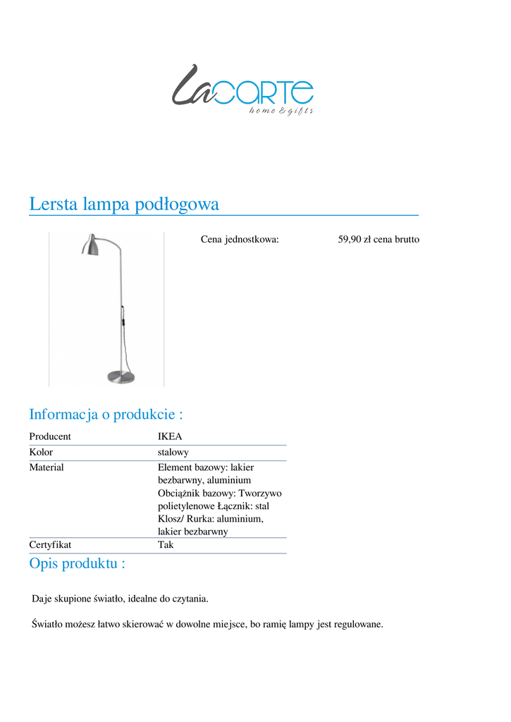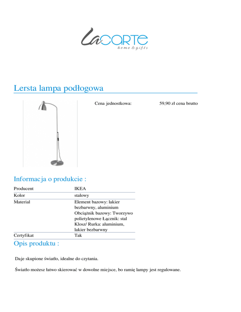 Lersta lampa podłogowa Cena jednostkowa: 59,90 zł cena brutto Informacja o produkcie : Producent Kolor Material Certyfikat IKEA stalowy Element bazowy: lakier bezbarwny, aluminium Obciążnik bazowy: Tworzywo polietylenowe Łącznik: stal Klosz/ Rurka: aluminium, lakier bezbarwny Tak Opis produktu : Daje skupione światło, idealne do czytania. Światło możesz łatwo skierować w dowolne miejsce, bo ramię lampy jest regulowane. Wymiary: Wysokość: 131 cm Śrd podstawy: 25.5 cm Średnica klosza: 15.5 cm Długość kabla: 200 cm Powered by TCPDF (www.tcpdf.org)