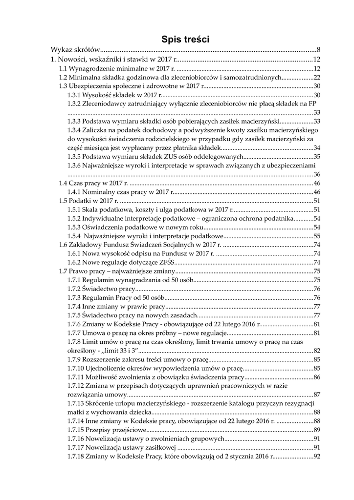 Spis treści Wykaz skrótów.........................................................................................................................8 1. Nowości, wskaźniki i stawki w 2017 r............................................................................12 1.1 Wynagrodzenie minimalne w 2017 r. ..................................................................................12 1.2 Minimalna składka godzinowa dla zleceniobiorców i samozatrudnionych...................22 1.3 Ubezpieczenia społeczne i zdrowotne w 2017 r..................................................................30 1.3.1 Wysokość składek w 2017 r...........................................................................................30 1.3.2 Zleceniodawcy zatrudniający wyłącznie zleceniobiorców nie płacą składek na FP ...................................................................................................................................................33 1.3.3 Podstawa wymiaru składki osób pobierających zasiłek macierzyński....................33 1.3.4 Zaliczka na podatek dochodowy a podwyższenie kwoty zasiłku macierzyńskiego do wysokości świadczenia rodzicielskiego w przypadku gdy zasiłek macierzyński za część miesiąca jest wypłacany przez płatnika składek.......................................................34 1.3.5 Podstawa wymiaru składek ZUS osób oddelegowanych..........................................35 1.3.6 Najważniejsze wyroki i interpretacje w sprawach związanych z ubezpieczeniami ...................................................................................................................................................36 1.4 Czas pracy w 2017 r. ..............................................................................................................46 1.4.1 Nominalny czas pracy w 2017 r....................................................................................46 1.5 Podatki w 2017 r. ....................................................................................................................51 1.5.1 Skala podatkowa, koszty i ulga podatkowa w 2017 r.................................................51 1.5.2 Indywidualne interpretacje podatkowe – ograniczona ochrona podatnika............54 1.5.3 Oświadczenia podatkowe w nowym roku..................................................................54 1.5.4 Najważniejsze wyroki i interpretacje podatkowe......................................................55 1.6 Zakładowy Fundusz Świadczeń Socjalnych w 2017 r. ......................................................74 1.6.1 Nowa wysokość odpisu na Fundusz w 2017 r. ..........................................................74 1.6.2 Nowe regulacje dotyczące ZFŚS...................................................................................74 1.7 Prawo pracy – najważniejsze zmiany...................................................................................75 1.7.1 Regulamin wynagradzania od 50 osób........................................................................75 1.7.2 Świadectwo pracy...........................................................................................................76 1.7.3 Regulamin Pracy od 50 osób.........................................................................................76 1.7.4 Inne zmiany w prawie pracy.........................................................................................77 1.7.5 Świadectwo pracy na nowych zasadach......................................................................77 1.7.6 Zmiany w Kodeksie Pracy - obowiązujące od 22 lutego 2016 r................................81 1.7.7 Umowa o pracę na okres próbny – nowe regulacje....................................................81 1.7.8 Limit umów o pracę na czas określony, limit trwania umowy o pracę na czas określony - ,,limit 33 i 3”.........................................................................................................82 1.7.9 Rozszerzenie zakresu treści umowy o pracę...............................................................85 1.7.10 Ujednolicenie okresów wypowiedzenia umów o pracę..........................................85 1.7.11 Możliwość zwolnienia z obowiązku świadczenia pracy.........................................86 1.7.12 Zmiana w przepisach dotyczących uprawnień pracowniczych w razie rozwiązania umowy................................................................................................................87 1.7.13 Skrócenie urlopu macierzyńskiego - rozszerzenie katalogu przyczyn rezygnacji matki z wychowania dziecka.................................................................................................88 1.7.14 Inne zmiany w Kodeksie pracy, obowiązujące od 22 lutego 2016 r. ......................88 1.7.15 Przepisy przejściowe....................................................................................................89 1.7.16 Nowelizacja ustawy o zwolnieniach grupowych.....................................................91 1.7.17 Nowelizacja ustawy zasiłkowej .................................................................................91 1.7.18 Zmiany w Kodeksie Pracy, które obowiązują od 2 stycznia 2016 r........................92 1.7.19 Zestawienie porównawcze zmian w Kodeksie Pracy, które weszły w życie 2 stycznia 2016 r..........................................................................................................................92 1.7.20 Nowe definicje pojęć na potrzeby działu ósmego KP..............................................96 1.7.21 Nowy: tryb, wymiar i nowe terminy składania wniosku o urlop..........................97 1.7.22 Urlop macierzyński......................................................................................................98 1.7.23 Dodatkowy urlop macierzyński – uchylone przepisy...........................................101 1.
