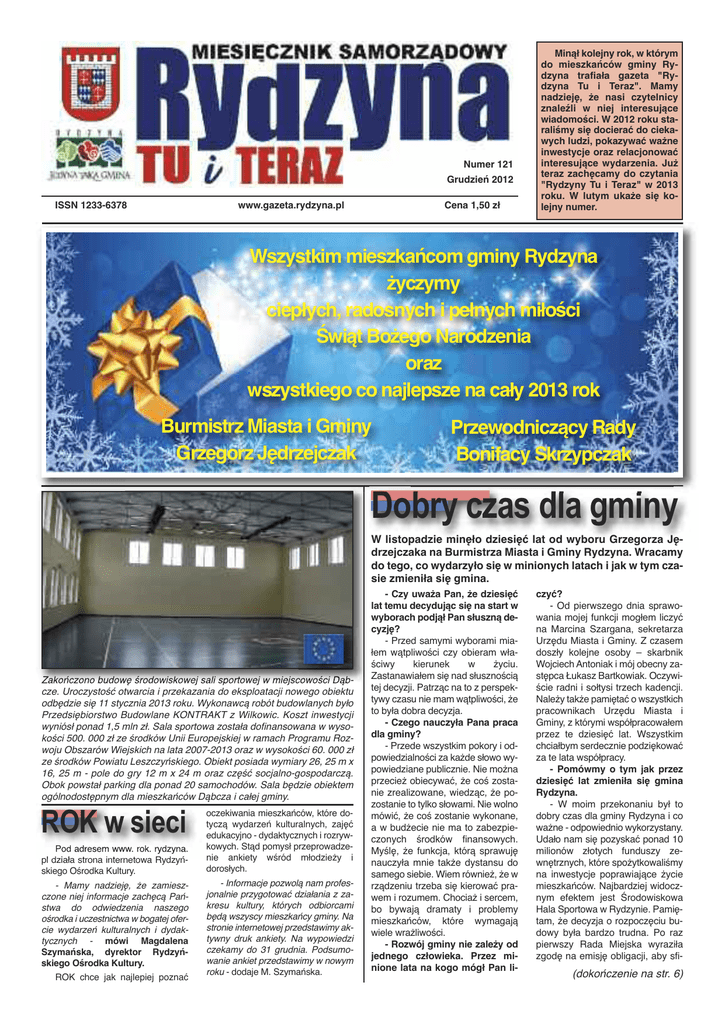 Numer 121 ISSN 1233-6378 Grudzień 2012 www.gazeta.rydzyna.pl Cena 1,50 zł Minął kolejny rok, w którym do mieszkańców gminy Rydzyna trafiała gazeta "Rydzyna Tu i Teraz". Mamy nadzieję, że nasi czytelnicy znaleźli w niej interesujące wiadomości. W 2012 roku staraliśmy się docierać do ciekawych ludzi, pokazywać ważne inwestycje oraz relacjonować interesujące wydarzenia. Już teraz zachęcamy do czytania "Rydzyny Tu i Teraz" w 2013 roku. W lutym ukaże się kolejny numer. Wszystkim mieszkańcom gminy Rydzyna życzymy ciepłych, radosnych i pełnych miłości Świąt Bożego Narodzenia oraz wszystkiego co najlepsze na cały 2013 rok Burmistrz Miasta i Gminy Grzegorz Jędrzejczak Przewodniczący Rady Bonifacy Skrzypczak Dobry czas dla gminy W listopadzie minęło dziesięć lat od wyboru Grzegorza Jędrzejczaka na Burmistrza Miasta i Gminy Rydzyna. Wracamy do tego, co wydarzyło się w minionych latach i jak w tym czasie zmieniła się gmina. Zakończono budowę środowiskowej sali sportowej w miejscowości Dąbcze. Uroczystość otwarcia i przekazania do eksploatacji nowego obiektu odbędzie się 11 stycznia 2013 roku. Wykonawcą robót budowlanych było Przedsiębiorstwo Budowlane KONTRAKT z Wilkowic. Koszt inwestycji wyniósł ponad 1,5 mln zł. Sala sportowa została dofinansowana w wysokości 500. 000 zł ze środków Unii Europejskiej w ramach Programu Rozwoju Obszarów Wiejskich na lata 2007-2013 oraz w wysokości 60. 000 zł ze środków Powiatu Leszczyńskiego. Obiekt posiada wymiary 26, 25 m x 16, 25 m - pole do gry 12 m x 24 m oraz część socjalno-gospodarczą. Obok powstał parking dla ponad 20 samochodów. Sala będzie obiektem ogólnodostępnym dla mieszkańców Dąbcza i całej gminy. ROK w sieci Pod adresem www. rok. rydzyna. pl działa strona internetowa Rydzyńskiego Ośrodka Kultury. - Mamy nadzieję, że zamieszczone niej informacje zachęcą Państwa do odwiedzenia naszego ośrodka i uczestnictwa w bogatej ofercie wydarzeń kulturalnych i dydaktycznych - mówi Magdalena Szymańska, dyrektor Rydzyńskiego Ośrodka Kultury. ROK chce jak najlepiej poznać oczekiwania mieszkańców, które dotyczą wydarzeń kulturalnych, zajęć edukacyjno - dydaktycznych i rozrywkowych. Stąd pomysł przeprowadzenie ankiety wśród młodzieży i dorosłych. - Informacje pozwolą nam profesjonalnie przygotować działania z zakresu kultury, których odbiorcami będą wszyscy mieszkańcy gminy. Na stronie internetowej przedstawimy aktywny druk ankiety. Na wypowiedzi czekamy do 31 grudnia. Podsumowanie ankiet przedstawimy w nowym roku - dodaje M. Szymańska. - Czy uważa Pan, że dziesięć lat temu decydując się na start w wyborach podjął Pan słuszną decyzję? - Przed samymi wyborami miałem wątpliwości czy obieram właściwy kierunek w życiu. Zastanawiałem się nad słusznością tej decyzji. Patrząc na to z perspektywy czasu nie mam wątpliwości, że to była dobra decyzja. - Czego nauczyła Pana praca dla gminy? - Przede wszystkim pokory i odpowiedzialności za każde słowo wypowiedziane publicznie. Nie można przecież obiecywać, że coś zostanie zrealizowane, wiedząc, że pozostanie to tylko słowami. Nie wolno mówić, że coś zostanie wykonane, a w budżecie nie ma to zabezpieczonych środków finansowych. Myślę, że funkcja, którą sprawuję nauczyła mnie także dystansu do samego siebie. Wiem również, że w rządzeniu trzeba się kierować prawem i rozumem. Chociaż i sercem, bo bywają dramaty i problemy mieszkańców, które wymagają wiele wrażliwości. - Rozwój gminy nie zależy od jednego człowieka. Przez minione lata na kogo mógł Pan li- czyć? - Od pierwszego dnia sprawowania mojej funkcji mogłem liczyć na Marcina Szargana, sekretarza Urzędu Miasta i Gminy. Z czasem doszły kolejne osoby – skarbnik Wojciech Antoniak i mój obecny zastępca Łukasz Bartkowiak. Oczywiście radni i sołtysi trzech kadencji. Należy także pamiętać o wszystkich pracownikach Urzędu Miasta i Gminy, z którymi współpracowałem przez te dziesięć lat. Wszystkim chciałbym serdecznie podziękować za te lata współpracy. - Pomówmy o tym jak przez dziesięć lat zmieniła się gmina Rydzyna. - W moim przekonaniu był to dobry czas dla gminy Rydzyna i co ważne - odpowiednio wykorzystany. Udało nam się pozyskać ponad 10 milionów złotych funduszy zewnętrznych, które spożytkowaliśmy na inwestycje poprawiające życie mieszkańców. Najbardziej widocznym efektem jest Środowiskowa Hala Sportowa w Rydzynie. Pamiętam, że decyzja o rozpoczęciu budowy była bardzo trudna. Po raz pierwszy Rada Miejska wyraziła zgodę na emisję obligacji, aby sfi- (dokończenie na str. 6) [2] Zmian ciąg dalszy RYDZYNA TU I TERAZ Rocznie przez Zamek SIMP w Rydzynie przewija się kilka tysięcy turystów i gości oraz uczestników konferencji polskich i zagranicznych. Zamek słynie w kraju z koncertów i imprez motoryzacyjnych. Jest miejscem istotnych wydarzeń dla regionu i kraju. To zobowiązuje do utrzymywania rangi miejsca i standardu usług. Dlatego od co najmniej dziesięciu lat Zamek SIMP jest modernizowany, przede wszystkim jego część pobytowa, ale za pilne uważane są prace konserwatorskie na elewacji. Nie tylko uczniowie dostają oceny. Nauczyciele także. W Gimnazjum w Rydzynie noty przyznała młodzież. Swoje opinie o nauczycielach wyraziła w plebiscycie. Wyniki ogłoszono podczas apelu zorganizowanego przez Samorząd Uczniowski. Tytuł "Belfer na piątkę" przyznano Ewie Kaszubie, nauczycielce matematyki (na zdjęciu). "Nauczycielem z uśmiechem" został Edward Pisarczyk, nauczyciel historii. Tytuł "Przyjaciel uczniów" odebrała Ilona Twardowska, ucząca muzyki. Jedną z ważniejszych inwestycji minionych lat była termomodernizacja. Dwie trzecie planowanych prac wykonano. - Obok termomodernizacji równie istotne jest podwyższanie standardu, dlatego trzy lata temu w Urzędzie Marszałkowskim w Poznaniu złożyliśmy wniosek o przyznan