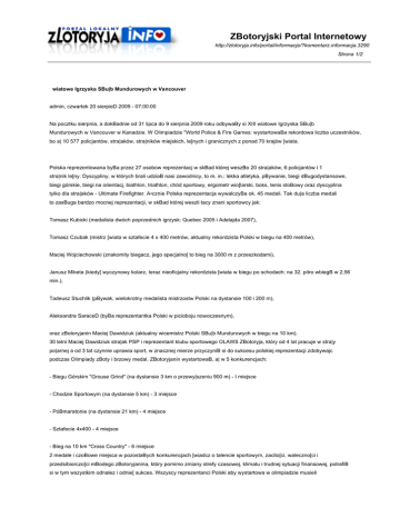 ZBotoryjski Portal Internetowy http://zlotoryja.info/portal/informacje/?komentarz.informacja.3290 Strona 1/2 wiatowe Igrzyska SBu|b Mundurowych w Vancouver admin, czwartek 20 sierpieD 2009 - 07:00:00 Na pocztku sierpnia, a dokBadnie od 31 lipca do 9 sierpnia 2009 roku odbywaBy si XIII wiatowe Igrzyska SBu|b Mundurowych w Vancouver w Kanadzie. W Olimpiadzie "World Police & Fire Games: wystartowaBa rekordowa liczba uczestników, bo a| 10 577 policjantów, stra|aków, stra|ników miejskich, le[nych i granicznych z ponad 70 krajów [wiata. Polska reprezentowana byBa przez 27 osobow reprezentacj w skBad której weszBo 20 stra|aków, 6 policjantów i 1 stra|nik le[ny. Dyscypliny, w których brali udziaB nasi zawodnicy, to m. in.: lekka atletyka, pBywanie, biegi dBugodystansowe, biegi górskie, biegi na orientacj, biathlon, triathlon, chód sportowy, ergometr wio[larski, boks, tenis stoBowy oraz dyscyplina tylko dla stra|aków - Ultimate Firefighter. A•cznie Polska reprezentacja wywalczyBa ok. 45 medali. Tak du|a liczba medali to zasBuga bardzo mocnej reprezentacji, w skBad której weszli tacy znani sportowcy jak: Tomasz Kubicki (medalista dwóch poprzednich igrzysk: Quebec 2005 i Adelajda 2007), Tomasz Czubak (mistrz [wiata w sztafecie 4 x 400 metrów, aktualny rekordzista Polski w biegu na 400 metrów), Maciej Wojciechowski (znakomity biegacz, jego specjalno[ to bieg na 3000 m z przeszkodami), Janusz Miketa (kiedy[ wyczynowy kolarz, teraz nieoficjalny rekordzista [wiata w biegu po schodach: na 32. pitro wbiegB w 2,56 min.), Tadeusz Stuchlik (pBywak, wielokrotny medalista mistrzostw Polski na dystansie 100 i 200 m), Aleksandra SaraceD (byBa reprezentantka Polski w picioboju nowoczesnym), oraz zBotoryjanin Maciej Dawidziuk (aktualny wicemistrz Polski SBu|b Mundurowych w biegu na 10 km). 30 letni Maciej Dawidziuk stra|ak PSP i reprezentant klubu sportowego OLAWS ZBotoryja, który od 4 lat pracuje w stra|y po|arnej a od 3 lat czynnie uprawia sport, w znacznej mierze przyczyniB si do sukcesu polskiej reprezentacji zdobywajc podczas Olimpiady zBoty i brzowy medal. ZBotoryjanin wystartowaB, a| w 5 konkurencjach: - Biegu Górskim "Grouse Grind" (na dystansie 3 km o przewy|szeniu 900 m) - I miejsce - Chodzie Sportowym (na dystansie 5 km) - 3 miejsce - PóBmaratonie (na dystansie 21 km) - 4 miejsce - Sztafecie 4x400 - 4 miejsce - Bieg na 10 km "Cross Country" - 6 miejsce 2 medale i czoBowe miejsca w pozostaBych konkurencjach [wiadcz o talencie sportowym, zacito[ci, waleczno[ci i przedsibiorczo[ci mBodego zBotoryjanina, który pomimo zmiany strefy czasowej, klimatu i trudnej sytuacji finansowej, potrafiB si w tym wszystkim odnalez i odnie[ sukces. Wszyscy reprezentanci Polski aby wystartowa w olimpiadzie musieli ZBotoryjski Portal Internetowy http://zlotoryja.info/portal/informacje/?komentarz.informacja.3290 Strona 2/2 ponie[ wszystkie koszty (przelot, zakwaterowanie, wy|ywienie, ubezpieczenie a nawet i opBaty startowe). Z pomoc naszemu zawodnikowi przyszli: Komendant Powiatowej Stra|y Po|arnej w ZBotoryi Roman Mokrzycki, MirosBaw KopiDski prezes firmy Kobud ze ZBotoryi oraz Konsul Rzeczypospolitej Polski w Vancuver i tamtejsza Polonia. Autor: Piotr KocyBa