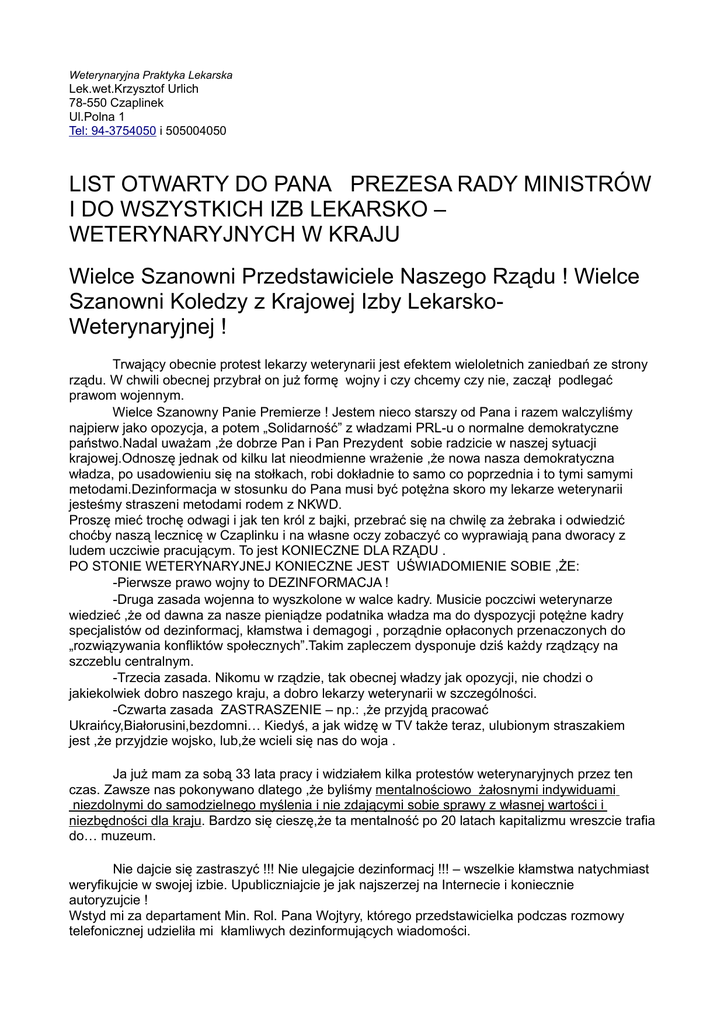 Weterynaryjna Praktyka Lekarska Lek.wet.Krzysztof Urlich 78-550 Czaplinek Ul.Polna 1 Tel: 94-3754050 i 505004050 LIST OTWARTY DO PANA PREZESA RADY MINISTRÓW I DO WSZYSTKICH IZB LEKARSKO – WETERYNARYJNYCH W KRAJU Wielce Szanowni Przedstawiciele Naszego Rządu ! Wielce Szanowni Koledzy z Krajowej Izby LekarskoWeterynaryjnej ! Trwający obecnie protest lekarzy weterynarii jest efektem wieloletnich zaniedbań ze strony rządu. W chwili obecnej przybrał on już formę wojny i czy chcemy czy nie, zaczął podlegać prawom wojennym. Wielce Szanowny Panie Premierze ! Jestem nieco starszy od Pana i razem walczyliśmy najpierw jako opozycja, a potem „Solidarność” z władzami PRL-u o normalne demokratyczne państwo.Nadal uważam ,że dobrze Pan i Pan Prezydent sobie radzicie w naszej sytuacji krajowej.Odnoszę jednak od kilku lat nieodmienne wrażenie ,że nowa nasza demokratyczna władza, po usadowieniu się na stołkach, robi dokładnie to samo co poprzednia i to tymi samymi metodami.Dezinformacja w stosunku do Pana musi być potężna skoro my lekarze weterynarii jesteśmy straszeni metodami rodem z NKWD. Proszę mieć trochę odwagi i jak ten król z bajki, przebrać się na chwilę za żebraka i odwiedzić choćby naszą lecznicę w Czaplinku i na własne oczy zobaczyć co wyprawiają pana dworacy z ludem uczciwie pracującym. To jest KONIECZNE DLA RZĄDU . PO STONIE WETERYNARYJNEJ KONIECZNE JEST UŚWIADOMIENIE SOBIE ,ŻE: -Pierwsze prawo wojny to DEZINFORMACJA ! -Druga zasada wojenna to wyszkolone w walce kadry. Musicie poczciwi weterynarze wiedzieć ,że od dawna za nasze pieniądze podatnika władza ma do dyspozycji potężne kadry specjalistów od dezinformacj, kłamstwa i demagogi , porządnie opłaconych przenaczonych do „rozwiązywania konfliktów społecznych”.Takim zapleczem dysponuje dziś każdy rządzący na szczeblu centralnym. -Trzecia zasada. Nikomu w rządzie, tak obecnej władzy jak opozycji, nie chodzi o jakiekolwiek dobro naszego kraju, a dobro lekarzy weterynarii w szczególności. -Czwarta zasada ZASTRASZENIE – np.: ,że przyjdą pracować Ukraińcy,Białorusini,bezdomni… Kiedyś, a jak widzę w TV także teraz, ulubionym straszakiem jest ,że przyjdzie wojsko, lub,że wcieli się nas do woja . Ja już mam za sobą 33 lata pracy i widziałem kilka protestów weterynaryjnych przez ten czas. Zawsze nas pokonywano dlatego ,że byliśmy mentalnościowo żałosnymi indywiduami niezdolnymi do samodzielnego myślenia i nie zdającymi sobie sprawy z własnej wartości i niezbędności dla kraju. Bardzo się cieszę,że ta mentalność po 20 latach kapitalizmu wreszcie trafia do… muzeum. Nie dajcie się zastraszyć !!! Nie ulegajcie dezinformacj !!! – wszelkie kłamstwa natychmiast weryfikujcie w swojej izbie. Upubliczniajcie je jak najszerzej na Internecie i koniecznie autoryzujcie ! Wstyd mi za departament Min. Rol. Pana Wojtyry, którego przedstawicielka podczas rozmowy telefonicznej udzieliła mi kłamliwych dezinformujących wiadomości. Wraz z przemianami ustrojowymi udało się sprywatyzować weterynarię. Współczesni lekarze nie są PRL-owskimi przodownikami pracy nadludzkim wysiłkiem i poczuciu nadrzędnego obowiązku w nieludzkich warunkach uwalniającymi nasz kraj od powojennych nieszczęść.To dobrze ,że Pan Premier i nasi współcześni rządzący już nie wiedzą jak się umiera na gruźlicę,brucelozę lub wściekliznę. Współczesna weterynaria to nieprawdopodobnie wysoko wykwalifikowana kadra najlepszych specjalistów .W niczym nieustępująca naszym kolegom w Unii, a nawet znacznie ich przewyższająca organizacją i umiejętnościami.Dynamika rozprzestrzeniania się pryszczycy w Wielkiej Brytanii podczas ostatniej epizoocji, do dziś budzi na twarzach naszych kolegów, pamiętających takie zdarzenia w naszym karaju,uśmiech politowania.Kompromitacja to najdelikatniejsze słowo. Długo by, w naszym kraju, szukać drugiej tak dobrze zorganizowanej struktury zapewniającej bezpieczeństwo zdrowotne ludzi w Polsce jak polska weterynaria. Radosne niszczenie naszych Powiatowych Inspektoratów przez rząd, już doprowadziło do tego,że brak w nich lekarzy weterynarii. NOWOTWOREM o nazwie „Państwowa Inspekcja Bezpieczeństwa Żywności i weterynarii” zarządzać ma przysłowiowy „ogrodnik” nie ujmując niczego ogrodnikom.Bardzo jestem ciekaw czy Pan Premier i panowie ministrowie poddali by się operacji wyrostka robaczkowego lub wycięciu złośliwego nowotworu w wykonaniu ogrodnika… po intensywnych chirurgicznych kursach… Panowie Ministrowie, Panie Premierze ! Jeszcze,na razie, macie w kraju doskonałą kadrę weterynaryjną. Ta kadra z powodu głupoty rządzących, zaniedbań Głównego Inspektoratu Weterynarii, który dawno już utracił kontakt z rzeczywistością ,z powodu arogancji władzy i jej oczywistej niekompetencji, na naszych oczach właśnie przestaje istnieć. Wiadomo co się stanie dalej. Tacy sprywatyzowani lekarze jak ja, w końcu przestaną dokładać ze swej praktyki do nieopłacalnych czynności. Najmądrzejsi i najlepsi wyjadą z kraju. Czy o to chodzi ? Czynię tu niniejszym wiadomym wszem i wobec ,że jak dotąd, to my lekarze wolno praktykujący dokładamy corocznie niemałe pieniądze, aby czynności opłacane poniżej wszelkiej unijnej przyzwoitości wykonać. Informuję Pana Premiera że żyjemy od 1990 roku w państwie kapitalistycznym, gdzie warunkiem istnienia każdego zakładu jest ZYSK. Protest nasz bierze się stąd ,że nie możemy zrozumieć dlaczego mamy pracować poniżej opłacalności.Nie możemy zrozumieć dlaczego tylko w Polsce rolnictwo jest dotowane kosztem naszej ciężkiej pracy. W Holandii rząd przy zwalczaniu choroby Aujeszky zapłacił tylko za badania laboratoryjne… za resztę rolnicy ! Nie możemy tego tym bardziej zrozumieć,że wcale nie trzeba (przy odrobinie zdrowego rozsądku) sięgać do kasy państwowej, abyśmy mogli godnie zarabiać ! Rolnik ma dotacje unijne a leka