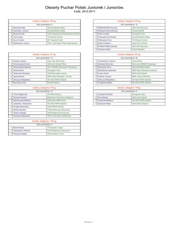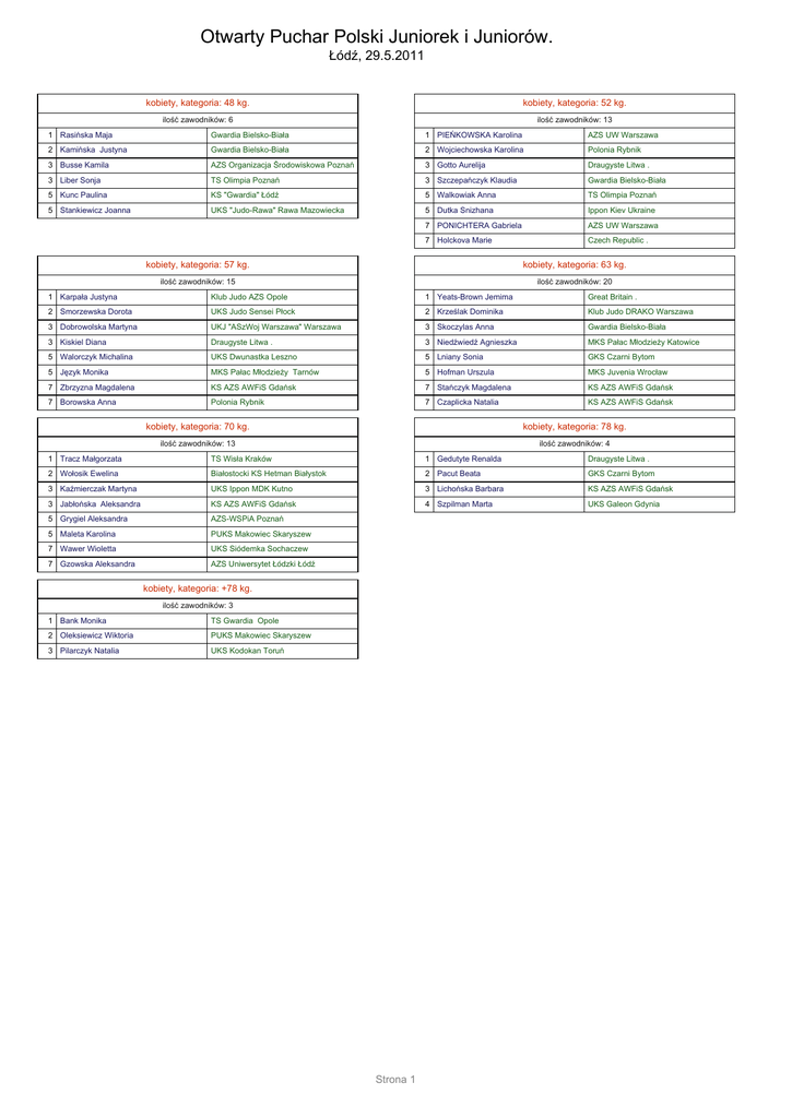 Otwarty Puchar Polski Juniorek i Juniorów. Łódź, 29.5.2011 kobiety, kategoria: 48 kg. kobiety, kategoria: 52 kg. ilość zawodników: 6 ilość zawodników: 13 1 Rasińska Maja Gwardia Bielsko-Biała 1 PIEŃKOWSKA Karolina AZS UW Warszawa 2 Kamińska Justyna Gwardia Bielsko-Biała 2 Wojciechowska Karolina Polonia Rybnik 3 Busse Kamila AZS Organizacja Środowiskowa Poznań 3 Gotto Aurelija Draugyste Litwa . 3 Liber Sonja TS Olimpia Poznań 3 Szczepańczyk Klaudia Gwardia Bielsko-Biała 5 Kunc Paulina KS "Gwardia" Łódź 5 Walkowiak Anna TS Olimpia Poznań 5 Stankiewicz Joanna UKS "Judo-Rawa" Rawa Mazowiecka 5 Dutka Snizhana Ippon Kiev Ukraine 7 PONICHTERA Gabriela AZS UW Warszawa 7 Holckova Marie Czech Republic . kobiety, kategoria: 57 kg. kobiety, kategoria: 63 kg. ilość zawodników: 15 ilość zawodników: 20 1 Karpała Justyna Klub Judo AZS Opole 1 Yeats-Brown Jemima Great Britain . 2 Smorzewska Dorota UKS Judo Sensei Płock 2 Krześlak Dominika Klub Judo DRAKO Warszawa 3 Dobrowolska Martyna UKJ "ASzWoj Warszawa" Warszawa 3 Skoczylas Anna Gwardia Bielsko-Biała 3 Kiskiel Diana Draugyste Litwa . 3 Niedźwiedź Agnieszka MKS Pałac Młodzieży Katowice 5 Walorczyk Michalina UKS Dwunastka Leszno 5 Lniany Sonia GKS Czarni Bytom 5 Język Monika MKS Pałac Młodzieży Tarnów 5 Hofman Urszula MKS Juvenia Wrocław 7 Zbrzyzna Magdalena KS AZS AWFiS Gdańsk 7 Stańczyk Magdalena KS AZS AWFiS Gdańsk 7 Borowska Anna Polonia Rybnik 7 Czaplicka Natalia KS AZS AWFiS Gdańsk kobiety, kategoria: 70 kg. kobiety, kategoria: 78 kg. ilość zawodników: 13 ilość zawodników: 4 1 Tracz Małgorzata TS Wisła Kraków 1 Gedutyte Renalda Draugyste Litwa . 2 Wołosik Ewelina Białostocki KS Hetman Białystok 2 Pacut Beata GKS Czarni Bytom 3 Kaźmierczak Martyna UKS Ippon MDK Kutno 3 Lichońska Barbara KS AZS AWFiS Gdańsk 3 Jabłońska Aleksandra KS AZS AWFiS Gdańsk 4 Szpilman Marta UKS Galeon Gdynia 5 Grygiel Aleksandra AZS-WSPiA Poznań 5 Maleta Karolina PUKS Makowiec Skaryszew 7 Wawer Wioletta UKS Siódemka Sochaczew 7 Gzowska Aleksandra AZS Uniwersytet Łódzki Łódź kobiety, kategoria: +78 kg. ilość zawodników: 3 1 Bank Monika TS Gwardia Opole 2 Oleksiewicz Wiktoria PUKS Makowiec Skaryszew 3 Pilarczyk Natalia UKS Kodokan Toruń Strona 1 Otwarty Puchar Polski Juniorek i Juniorów. Łódź, 29.5.2011 mężczyźni, kategoria: 55 kg. mężczyźni, kategoria: 60 kg. ilość zawodników: 24 ilość zawodników: 40 1 Kovalovs Vadims Daugavpils Judo Center Singitaj Łotwa 1 Wydrzyński Marcin GKS Czarni Bytom 2 Ponichtera Bartosz UKS Siódemka Sochaczew 2 Garbacik Bartłomiej TS Wisła Kraków 3 Goldsmith George Great Britain . 3 Wala Adrian Polonia Rybnik 3 Szypowicz Wiktor KS AZS AWFiS Gdańsk 3 Stępak Filip UKS Grot Kraków 5 Gavrylyuk Olek Ippon Kiev Ukraine 5 Dobranowski Bartosz T.S.MOSiR Bochnia 5 Godek Patryk GKS Czarni Bytom 5 KIEŁBUS Krzysztof Gwardia Wrocław 7 Frysztacki Przemysław Polonia Rybnik 7 Chrzanowski Dominik UKJ Ryś Warszawa 7 Lewicki Jędrzej Klub Środowiskowy AZS Gliwice 7 Kleszcz Szymon KS "Gwardia" Łódź mężczyźni, kategoria: 66 kg. mężczyźni, kategoria: 73 kg. ilość zawodników: 40 ilość zawodników: 53 1 DĄBROWSKI Stanisław AZS UW Warszawa 1 Kowalczyk Rafał Polonia Rybnik 2 Szerszeniewski Przemysław AZS AWF Warszawa 2 Szafran Łukasz TS Olimpia Poznań 3 Chodyna Dawid GKS ,,Olimpia" Grudziądz 3 Banaszek Dominik UKJ 225 Warszawa 3 Staruh Vladislav Daugavpils Judo Center Singitaj Łotwa 3 Pękala Szymon UKS "Sokół" Pisarzowice 5 Popiel Damian KS "Gwardia" Łódź 5 Rydwański Michał AKS Strzegom 5 Brot Paweł KS "Gwardia" Łódź 5 Woźniak Szymon UKS Grot Kraków 7 Zacheja Maciej WKS Gwardia Warszawa 7 Cchovbrebovas Erikas Draugyste Litwa . 7 Woch Mateusz KS "Gwardia" Łódź 7 Holcak Lubomir Czech Republic . mężczyźni, kategoria: 81 kg. mężczyźni, kategoria: 90 kg. ilość zawodników: 40 ilość zawodników: 16 1 Szczepaniak Tomasz Klub Judo AZS Opole 1 Ciechomski Patryk MMKS Jutrzenka Płock Płock 2 Kurkiewicz Bartosz UKJ Ryś Warszawa 2 Krusna Rosvaldas Draugyste Litwa . 3 Sokolovskis Arturs Daugavpils Judo Center Singitaj Łotwa 3 Gmurek Marcin AZS AWF Warszawa 3 Kwiatkowski Tomasz GKS Czarni Bytom 3 Smołka Przemysław Polonia Rybnik 5 Prus Kamil WKS Gwardia Warszawa 5 Marcinkevicius Saimonas Draugyste Litwa . 5 Klammert David Czech Republic . 5 PAŃKO MICHAŁ Gwardia Wrocław 7 Jabłoński Michał KS AZS AWFiS Gdańsk 7 Łukasik Rafał UKJ Millenium Rzeszów 7 Majdan Rafał KS AZS AWFiS Gdańsk 7 Krueger Mariusz TKS "Judo" Toruń mężczyźni, kategoria: 100 kg. mężczyźni, kategoria: +100 kg. ilość zawodników: 10 ilość zawodników: 10 1 Romaniuk Oliwier TS Wisła Kraków 1 Zabarskas Zilvinas Draugyste Litwa . 2 Żeleński-Olczak Piotr KS "Gwardia" Łódź 2 Broniec Patryk AZS AWF Warszawa 3 Zakrzewski Jakub KS AZS AWFiS Gdańsk 3 Seniauskas Augustinas Draugyste Litwa . 3 Słabiak Grzegorz K.S. Judo Czechowice-Dziedzice 3 Grabowski Kamil GKS Czarni Bytom 5 Zakrzewski Piotr KS AZS AWFiS Gdańsk 5 Jackiewicz Jan UKJ "ASzWoj Warszawa" Warszawa 5 Kissk Kevin UKS-47 Judo Bushido-Morus Szczecin 5 KAZIMIEROWICZ KACPER Gwardia Wrocław 7 Ziólkowski Krzysztof TKS "Judo" Toruń 7 Paszko Dawid UKS De La Salle Gdańsk 7 Fajferek Mikołaj Gwardia Bielsko-Biała 7 Gołębiowski Mateusz MMKS Wojownik Skierniewice Strona 2