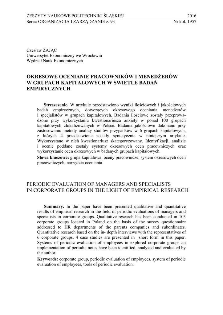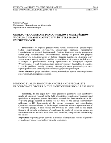 ZESZYTY NAUKOWE POLITECHNIKI ŚLĄSKIEJ Seria: ORGANIZACJA I ZARZĄDZANIE z. 93 2016 Nr kol. 1957 Czesław ZAJĄC Uniwersytet Ekonomiczny we Wrocławiu Wydział Nauk Ekonomicznych OKRESOWE OCENIANIE PRACOWNIKÓW I MENEDŻERÓW W GRUPACH KAPITAŁOWYCH W ŚWIETLE BADAŃ EMPIRYCZNYCH Streszczenie. W artykule przedstawiono wyniki ilościowych i jakościowych badań empirycznych, dotyczących okresowego oceniania menedżerów i specjalistów w grupach kapitałowych. Badania ilościowe zostały przeprowadzone przy wykorzystaniu kwestionariusza ankiety w ponad 100 grupach kapitałowych zlokalizowanych w Polsce. Badania jakościowe dokonano przy zastosowaniu metody analizy studiów przypadków w 6 grupach kapitałowych, z których 4 przedstawione zostały syntetycznie w niniejszym artykule. Wykorzystano w nich kwestionariusz skategoryzowany. Identyfikacji, analizie i ocenie poddane zostały systemy okresowych ocen pracowniczych oraz wykorzystanie ocen okresowych w badanych grupach kapitałowych. Słowa kluczowe: grupa kapitałowa, oceny pracownicze, system okresowych ocen pracowniczych, narzędzia oceniania. PERIODIC EVALUATION OF MANAGERS AND SPECIALISTS IN CORPORATE GROUPS IN THE LIGHT OF EMPIRICAL RESEARCH Summary. In the paper have been presented qualitative and quantitative results of empirical research in the field of periodic evaluations of managers and specialists in corporate groups. Qualitative research has been conducted in 103 corporate groups located in Poland on the basis of the survey questionnaire addressed to HR departments of the parents companies and subordinates. Quantitative research based on the in- depth interviews with the representatives of 6 corporate groups. 4 case studies are presented in short form in this paper. Systems of periodic evaluation of employees in explored corporate groups an implementation of periodic notes have been identified, analyzed and evaluated by the author. Keywords: corporate group, periodic evaluation of employees, system of periodic evaluation of employees, tools of periodic evaluation. 536 Cz. Zając 1. Wstęp Grupy kapitałowe coraz silniej zaznaczają swoją obecność wśród organizacji gospodarczych wielu krajów, a ich architektury tworzą bogate przestrzenie dla występowania wielu różnorodnych, złożonych społecznych (personalnych, kulturowych) i organizacyjnych problemów. Wielokulturowy kontekst zarządzania w międzynarodowych grupach kapitałowych dodatkowo „komplikuje” zarządzanie ich zasobami ludzkimi, stanowiąc duże wyzwanie dla decydentów, podejmujących kluczowe decyzje zarządcze w sferze personalnej kierowanych przez nich organizacji tego rodzaju. Skuteczność tych decyzji oraz efektywność wykorzystywanych narzędzi, rozwiązań i systemów operacyjnych wymaga od menedżerów personalnych profesjonalizmu, doświadczenia, bardzo dobrej znajomości metod, technik i narzędzi kadrowych oraz wysokich umiejętności ich stosowania w konkretnych sytuacjach, wyznaczonych przez warunki funkcjonowania danej grupy kapitałowej. Dotyczy to także wielowymiarowych środowisk organizacyjnych, jakie występują w zlokalizowanych w Polsce podmiotach zależnych międzynarodowych grup kapitałowych, które wcześniej funkcjonowały jako polskie przedsiębiorstwa i przez przejęcia lub fuzje zostały włączone w struktury organizacyjne tych grup. Systemy oceniania pracowników stanowią integralną część procesu zarządzania zasobami ludzkimi w grupach kapitałowych. Niektóre z aspektów procesu oceniania nie wykazują specyfiki, inne wydają się mieć wyjątkowy charakter, wynikający z realizowania procesu oceny w strukturach grupy kapitałowej, szczególnie w odniesieniu do kadry menedżerskiej spółek. Niniejszy artykuł jest owocem szerszych eksploracji empirycznych oraz studiów nad literaturą przedmiotu, podjętych przez międzywydziałowy zespół badaczy, utworzony z pracowników naukowych Uniwersytetu Ekonomicznego we Wrocławiu, którym kierował sam autor i realizowanych w ramach projektu badawczego pt. Zarządzanie zasobami ludzkimi w grupach kapitałowych ze środków finansowych przyznanych przez Narodowe Centrum Nauki na podstawie decyzji numer DEC-2012/05/B/HS4/02348. Zarządzanie zasobami ludzkimi w grupach kapitałowych obejmuje wiele zagadnień. Do najważniejszych spośród wyżej wymieniony zespół badaczy zaliczył strategiczny oraz operacyjny wymiar tego zarządzania. Okresowe ocenianie menedżerów i specjalistów, jako jeden z elementów drugiego z wyżej wymienionych wymiarów tego zarządzania, stanowi przedmiot rozważań w ramach niniejszego artykułu. Przekonanie o podjęciu wskazanego obszaru badawczego wynikało zarówno z doświadczenia zawodowego i zainteresowań członków zespołu badawczego problematyką zarządzania ludźmi oraz funkcjonowaniem grup kapitałowych, jak i z rozpoznanej luki w analizowanym obszarze, w wyniku studiów nad rodzimą i zagraniczną literaturą przedmiotu. Celem opracowania, który określił jego autor, jest identyfikacja i ocena architektury systemów okresowych ocen pracowniczych oraz procedury oceniania menedżerów Okresowe ocenianie pracowników i menedżerów… 537 i specjalistów grup kapitałowych objętych badaniami empirycznymi, dokonane na tle specyfiki tych grup. 2. Okresowe ocenianie pracowników i menedżerów – wprowadzenie Na proces oceniania składa się wartościowanie wielu czynników, takich jak: postawy, cechy osobowe, zachowania, a także poziom wykonywania zadań istotnych z punktu widzenia ustalonych celów i misji danej organizacji [4]. Wyniki oceny powinny dostarczać informacji do innych działań w obrębie funkcji personalnej i mieć ścisły związek z pozostałymi obszarami zarządzania zasobami ludzkimi, takimi jak [1]: system szkolenia i rozwoju, system wynagrodzenia, plany sukcesji, projektowanie stanowisk pracy, system rekrutacji i selekcji. Efektem oceniania mogą być również decyzje o zwolnieniach pracowniczyc