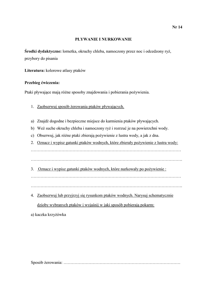 Nr 14 PŁYWANIE I NURKOWANIE Środki dydaktyczne: lornetka, okruchy chleba, namoczony przez noc i odcedzony ryż, przybory do pisania Literatura: kolorowe atlasy ptaków Przebieg ćwiczenia: Ptaki pływające mają różne sposoby znajdowania i pobierania pożywienia. 1. Zaobserwuj sposób żerowania ptaków pływających. a) Znajdź dogodne i bezpieczne miejsce do karmienia ptaków pływających. b) Weź suche okruchy chleba i namoczony ryż i rozrzuć je na powierzchni wody. c) Obserwuj, jak różne ptaki zbierają pożywienie z lustra wody, a jak z dna. 2. Oznacz i wypisz gatunki ptaków wodnych, które zbierały pożywienie z lustra wody: ……………………………………………………………………………………………… ………………………………………………………………………………………………. 3. Oznacz i wypisz gatunki ptaków wodnych, które nurkowały po pożywienie : ……………………………………………………………………………………………… ………………………………………………………………………………………………. 4. Zaobserwuj lub przyjrzyj się rysunkom ptaków wodnych. Narysuj schematycznie dzioby wybranych ptaków i wyjaśnij w jaki sposób pobierają pokarm: a) kaczka krzyżówka Sposób żerowania: ………………………………………………………………………… ………………………………………………………………………………………………. b) łabędź Sposób żerowania: ………………………………………………………………………… ………………………………………………………………………………………………. d) łyska Sposób żerowania: ………………………………………………………………………… ………………………………………………………………………………………………. e) perkoz Sposób żerowania: ………………………………………………………………………… ……………………………………………………………………………………………….