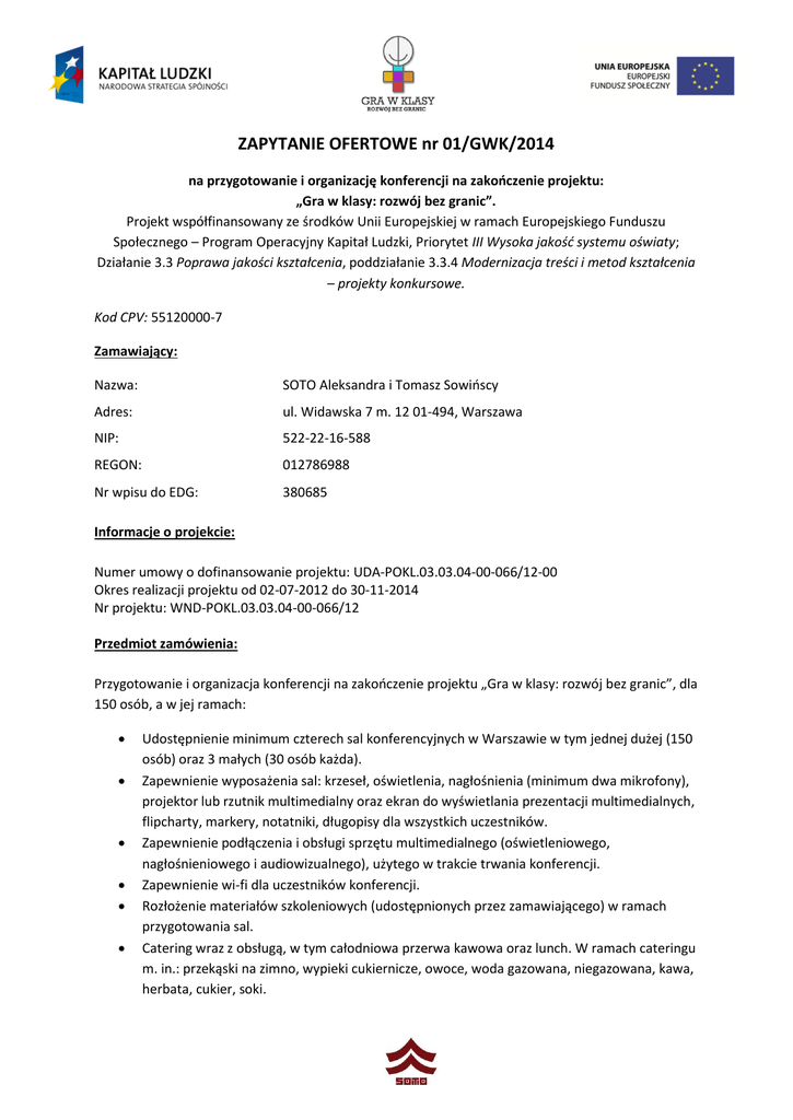 ZAPYTANIE OFERTOWE nr 01/GWK/2014 na przygotowanie i organizację konferencji na zakończenie projektu: „Gra w klasy: rozwój bez granic”. Projekt współfinansowany ze środków Unii Europejskiej w ramach Europejskiego Funduszu Społecznego – Program Operacyjny Kapitał Ludzki, Priorytet III Wysoka jakość systemu oświaty; Działanie 3.3 Poprawa jakości kształcenia, poddziałanie 3.3.4 Modernizacja treści i metod kształcenia – projekty konkursowe. Kod CPV: 55120000-7 Zamawiający: Nazwa: SOTO Aleksandra i Tomasz Sowińscy Adres: ul. Widawska 7 m. 12 01-494, Warszawa NIP: 522-22-16-588 REGON: 012786988 Nr wpisu do EDG: 380685 Informacje o projekcie: Numer umowy o dofinansowanie projektu: UDA-POKL.03.03.04-00-066/12-00 Okres realizacji projektu od 02-07-2012 do 30-11-2014 Nr projektu: WND-POKL.03.03.04-00-066/12 Przedmiot zamówienia: Przygotowanie i organizacja konferencji na zakończenie projektu „Gra w klasy: rozwój bez granic”, dla 150 osób, a w jej ramach: Udostępnienie minimum czterech sal konferencyjnych w Warszawie w tym jednej dużej (150 osób) oraz 3 małych (30 osób każda). Zapewnienie wyposażenia sal: krzeseł, oświetlenia, nagłośnienia (minimum dwa mikrofony), projektor lub rzutnik multimedialny oraz ekran do wyświetlania prezentacji multimedialnych, flipcharty, markery, notatniki, długopisy dla wszystkich uczestników. Zapewnienie podłączenia i obsługi sprzętu multimedialnego (oświetleniowego, nagłośnieniowego i audiowizualnego), użytego w trakcie trwania konferencji. Zapewnienie wi-fi dla uczestników konferencji. Rozłożenie materiałów szkoleniowych (udostępnionych przez zamawiającego) w ramach przygotowania sal. Catering wraz z obsługą, w tym całodniowa przerwa kawowa oraz lunch. W ramach cateringu m. in.: przekąski na zimno, wypieki cukiernicze, owoce, woda gazowana, niegazowana, kawa, herbata, cukier, soki. Właściwe oznakowanie miejsca organizacji konferencji logotypami projektu i znakami unijnymi (Zamawiający udostępnia znaki graficzne). Obsługa szatni. Zamawiający odpowiada za część merytoryczną konferencji: zaproszenie gości, prelegentów oraz program. Termin i miejsce wykonania zamówienia: Termin realizacji zamówienia: 15 listopada 2014 r. (sobota) w godz. 09:00 – 17:00. Miejsce realizacji: Warszawa, z dogodnym dojazdem komunikacją miejską i możliwością zaparkowania samochodów. Termin składania i rozpatrzenia ofert: Termin składania: 15 października 2014 r. Termin rozpatrzenia: do 17 października 2014 r. Oferta powinna zawierać: Nazwę i adres oferenta, Specyfikację organizacji konferencji, Cenę oferty przedstawioną jako cena netto i brutto, Cen całkowita powinna uwzględniać wykonanie wszystkich prac i czynności oraz zawierać wszelkie koszty związane z realizacją zamówienia, zgodnie z przedstawioną przez Zamawiającego specyfikacją, zawartą w opisie przedmiotu zamówienia, Podpisane oświadczenie o braku powiązań z Zamawiającym (załącznik do zapytania ofertowego). Kryterium oceny ofert: Najniższa cena całościowa brutto – 100%. Cena zaproponowana i ustalona w ofercie jest ceną brutto (zawierającą obowiązujący podatek VAT) i musi zawierać wszelkie koszty niezbędne do zrealizowania zamówienia. Cena ofertowa podana przez wykonawcę obowiązuje przez okres ważności umowy i nie podlega waloryzacji. Rozliczenia pomiędzy Zamawiającym a wykonawcą prowadzone będą wyłącznie w PLN. Termin i miejsce składania ofert: Oferty należy przesyłać drogą elektroniczną na adres [email protected] do dnia 15 października 2014 r. (środa) do godz. 17:00 lub pocztą na adres Zamawiającego z dopiskiem: „Oferta – organizacja konferencji”. Oferty złożone po terminie nie będą rozpatrywane. W przypadku pytań, prosimy o kontakt na adres [email protected] Warunki płatności: Na podstawie faktury, płatnej w terminie 14 dni od dnia wystawienia, przelewem na rachunek bankowy Wykonawcy wskazany na fakturze. Uwagi: Zamawiający dopuszcza wyłącznie składanie ofert obejmujących wykonanie całej usługi. Niniejsza informacja nie stanowi oferty w myśl art. 66 Kodeksu Cywilnego, jak również nie jest ogłoszeniem w rozumieniu ustawy Prawo zamówień publicznych.