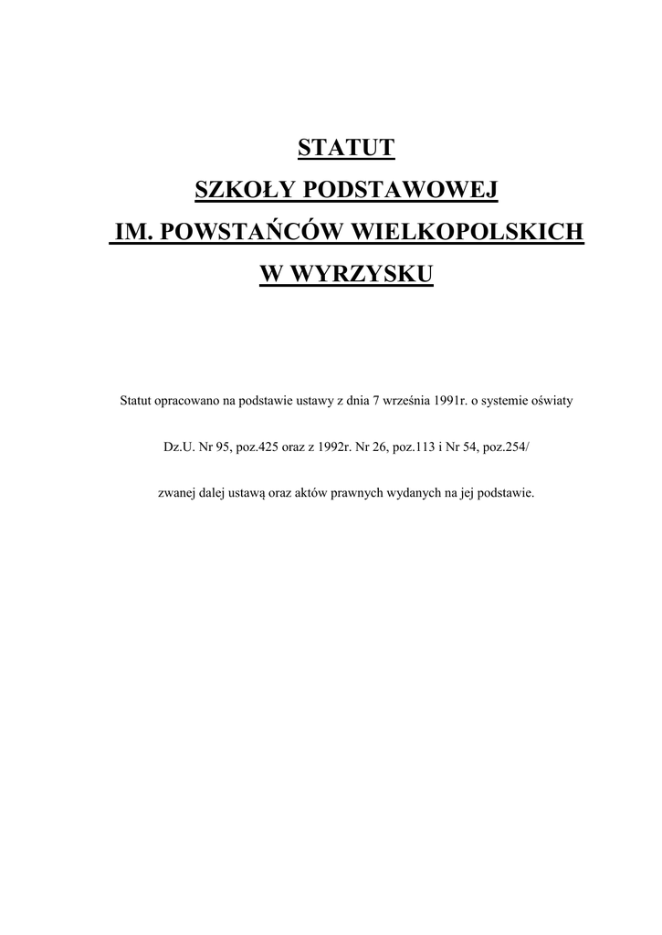 STATUT SZKOŁY PODSTAWOWEJ IM. POWSTAŃCÓW WIELKOPOLSKICH W WYRZYSKU Statut opracowano na podstawie ustawy z dnia 7 września 1991r. o systemie oświaty Dz.U. Nr 95, poz.425 oraz z 1992r. Nr 26, poz.113 i Nr 54, poz.254/ zwanej dalej ustawą oraz aktów prawnych wydanych na jej podstawie. ROZDZIAŁ 1 PRZEPISY OGÓLNE § 1. 1. Nazwa szkoły brzmi: Szkoła Podstawowa im. Powstańców Wielkopolskich w Wyrzysku ul. Parkowa 8. 2. Organem prowadzącym szkołę jest Samorząd Miasta Wyrzyska. 3. Nadzór pedagogiczny pod względem realizacji programu dydaktycznego i wychowawczego sprawuje Wielkopolskie Kuratorium Oświaty w Poznaniu Wydział Nadzoru Pedagogicznego w Pile. 4. Cykl kształcenia trwa 6 lat. 5. W szkole można utworzyć oddział przedszkolny, zwany dalej „zerówką”. 6. Zasady funkcjonowania oddziału zawiera Regulamin Oddziału Przedszkolnego, stanowiący odrębny załącznik do statutu Szkoły. 7.Przyjmowanie dzieci do Oddziału Przedszkolnego określa regulamin stanowiący odrębny załącznik do statutu Szkoły. § 2. 1. Szkoła używa pieczęci urzędowej zgodnie z odrębnymi przepisami. 2. Szkoła posiada sztandar: Szkoła Podstawowa imienia Powstańców Wielkopolskich w Wyrzysku. 3. Szkoła prowadzi i przechowuje dokumentację zgodnie z odrębnymi przepisami. 4. Szkoła posiada logo: srebrna tarcz z napisem "SP im. Powstańców Wielkopolskich w Wyrzysku" umieszczona na tle flagi biało - czerwonej oraz gałązka laurowa na drzewcu flagi, a także złota wstęga z datami znajdująca się pod tarczą". ROZDZIAŁ 2 CELE I ZADANIA SZKOŁY § 1. 1. Szkoła realizuje cele i zadania określone w Ustawie o systemie oświaty. 2. Szkoła w zakresie nauczania zapewnia uczniom w szczególności: 1) naukę poprawnego i swobodnego wypowiadania się, pisania i czytania ze zrozumieniem; 2) poznawanie wymaganych pojęć i zdobywanie rzetelnej wiedzy na poziomie umożliwiającym co najmniej kontynuację nauki na następnym etapie kształcenia; 3) dochodzenie do rozumienia, a nie tylko pamięciowego opanowania przekazywanych treści; 4) rozwijanie zdolności myślenia analitycznego i syntetycznego; 5) poznawanie zasad rozwoju osobowego i społecznego; 6) poznawanie dziedzictwa kultury narodowej; 7) poznawanie historii, tradycji i dziedzictwa kultury regionu; 8) rozwijanie zdolności dostrzegania związków przyczynowo-skutkowych, czasowych, przestrzennych i funkcjonalnych; 9) integrację treści nauczania w celu lepszego, kompleksowego rozumienia świata, ludzi i siebie. 3. Szkoła w zakresie kształcenia umiejętności stwarza warunki do: 1) planowania, organizowania i oceniania własnej nauki i przyjmowania za nią odpowiedzialności; 2) skutecznego porozumiewania się w różnych sytuacjach, prezentacji własnego punktu widzenia, poprawnego posługiwania się językiem ojczystym; 3) efektywnego współdziałania w zespole i pracy w grupie, budowania więzi międzyludzkich, podejmowania decyzji; 4) rozwiązywania problemów w twórczy sposób; 5) poszukiwania, porządkowania i wykorzystywania informacji z różnych źródeł; 6) odnoszenia do praktyki zdobytej wiedzy oraz tworzenia potrzebnych doświadczeń i nawyków; 7) rozwijania osobistych zainteresowań; 8) przyswajania metod i technik negocjacyjnego rozwiązywania konfliktów i problemów społecznych. 4. W zakresie działalności wychowawczej Szkoła: 1) upowszechnia zasady tolerancji, wolności sumienia i poczucia sprawiedliwości; 2) rozwija dociekliwość poznawczą uczniów, ukierunkowując ją na poznanie prawdy, dobra i piękna; 3) wdraża do rzetelnej pracy na drodze do osiągnięcia postawionych sobie celów życiowych; 4) przygotowuje do dokonywania wyborów i hierarchizacji wartości; 5) kształtuje postawę dialogu, umiejętność słuchania innych i zrozumienia dla ich poglądów; 6) kształtuje postawy patriotyczne (także w wymiarze lokalnym); 7) sprzyja zachowaniom proekologicznym; 8) umożliwia uczniom podtrzymanie tożsamości narodowej, etnicznej, językowej i religijnej; 9) szanuje indywidualność uczniów i ich prawo do własnej oceny rzeczywistości, 10) budzi szacunek do pracy poprzez dobrze zorganizowaną pracę Szkoły i na rzecz środowiska; 11) wdraża do dyscypliny i punktualności; 12) Szkoła wypracowuje i realizuje program będący alternatywą dla zagrożeń społecznych młodego człowieka. 5. Kształtuje środowisko wychowawcze sprzyjające realizowaniu celów i zadań określonych w ustawie, stosownie do warunków szkoły i wieku ucznia poprzez: 1) indywidualne zapewnienie odpowiedniej bazy uczniom szkoły; 2) systematyczne monitorowanie i diagnozowanie zachowań uczniów; 3) realizowanie programu wychowawczego. 6. Sprawuje opiekę nad uczniami odpowiednio do ich potrzeb oraz możliwości szkoły poprzez: 1) zorganizowanie zajęć świetlicowych; 2) umożliwianie spożywania posiłków; 3) organizowanie nauczania indywidualnego; 4) prowadzenie zajęć z gimnastyki korekcyjnej; 5) prowadzenie zajęć dydaktyczno-wyrównawczych; 6) prowadzenie zajęć logopedycznych. Zajęcia, o których mowa wyżej, prowadzone są na podstawie diagnozy dokonanej przez PPP Wyrzysku oraz w miarę posiadanych środków. 7. Zapewnia kształcenie i bezpieczne dowożenie uczniów klas IV-VI do szkoły z obwodu Rudy i Glesna. Dowożenie uczniów do szkoły finansuje Urząd Miasta w Wyrzysku, a bezpośrednio nadzoruje dyrektor Szkoły Podstawowej w Wyrzysku. Opiekę nad dowożonymi uczniami sprawuje kompetentna osoba, która posiada umowę o pracę podpisaną przez Burmistrza Miasta Wyrzyska. Dba ona o bezpieczeństwo uczniów w czasie dowożenia. 8. Dąży do zapewnienia uczniom pełnego rozwoju umysłowego, moralnego i fizycznego zgodnie z ich potrzebami i możliwościami psychofizycznymi w warunkach poszanowania ich godności osobistej oraz wolności światopoglądowej i wyznaniowej. Szkoła respektuje zobowiązania wynikające z Powszechnej Deklaracji Praw Człowieka ONZ, Deklaracji Praw Dziecka ONZ oraz Konwencji o P