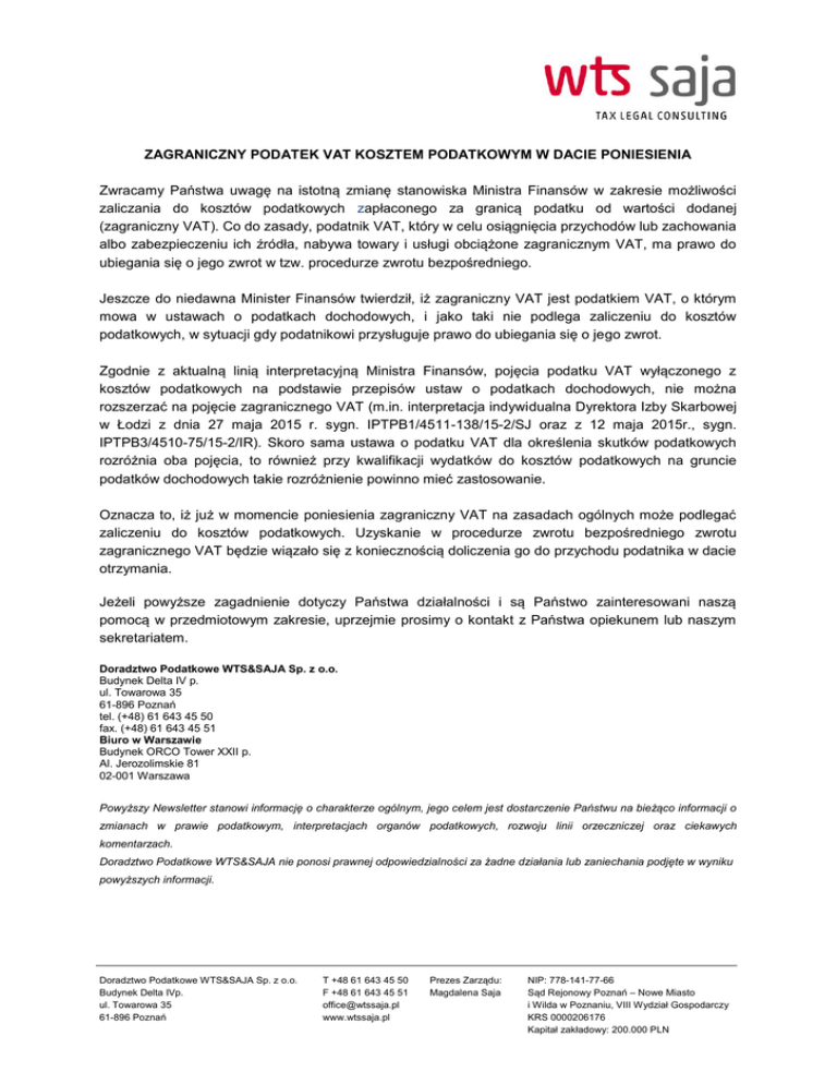 ZAGRANICZNY PODATEK VAT KOSZTEM PODATKOWYM W DACIE PONIESIENIA Zwracamy Państwa uwagę na istotną zmianę stanowiska Ministra Finansów w zakresie możliwości zaliczania do kosztów podatkowych zapłaconego za granicą podatku od wartości dodanej (zagraniczny VAT). Co do zasady, podatnik VAT, który w celu osiągnięcia przychodów lub zachowania albo zabezpieczeniu ich źródła, nabywa towary i usługi obciążone zagranicznym VAT, ma prawo do ubiegania się o jego zwrot w tzw. procedurze zwrotu bezpośredniego. Jeszcze do niedawna Minister Finansów twierdził, iż zagraniczny VAT jest podatkiem VAT, o którym mowa w ustawach o podatkach dochodowych, i jako taki nie podlega zaliczeniu do kosztów podatkowych, w sytuacji gdy podatnikowi przysługuje prawo do ubiegania się o jego zwrot. Zgodnie z aktualną linią interpretacyjną Ministra Finansów, pojęcia podatku VAT wyłączonego z kosztów podatkowych na podstawie przepisów ustaw o podatkach dochodowych, nie można rozszerzać na pojęcie zagranicznego VAT (m.in. interpretacja indywidualna Dyrektora Izby Skarbowej w Łodzi z dnia 27 maja 2015 r. sygn. IPTPB1/4511-138/15-2/SJ oraz z 12 maja 2015r., sygn. IPTPB3/4510-75/15-2/IR). Skoro sama ustawa o podatku VAT dla określenia skutków podatkowych rozróżnia oba pojęcia, to również przy kwalifikacji wydatków do kosztów podatkowych na gruncie podatków dochodowych takie rozróżnienie powinno mieć zastosowanie. Oznacza to, iż już w momencie poniesienia zagraniczny VAT na zasadach ogólnych może podlegać zaliczeniu do kosztów podatkowych. Uzyskanie w procedurze zwrotu bezpośredniego zwrotu zagranicznego VAT będzie wiązało się z koniecznością doliczenia go do przychodu podatnika w dacie otrzymania. Jeżeli powyższe zagadnienie dotyczy Państwa działalności i są Państwo zainteresowani naszą pomocą w przedmiotowym zakresie, uprzejmie prosimy o kontakt z Państwa opiekunem lub naszym sekretariatem. Doradztwo Podatkowe WTS&SAJA Sp. z o.o. Budynek Delta IV p. ul. Towarowa 35 61-896 Poznań tel. (+48) 61 643 45 50 fax. (+48) 61 643 45 51 Biuro w Warszawie Budynek ORCO Tower XXII p. Al. Jerozolimskie 81 02-001 Warszawa Powyższy Newsletter stanowi informację o charakterze ogólnym, jego celem jest dostarczenie Państwu na bieżąco informacji o zmianach w prawie podatkowym, interpretacjach organów podatkowych, rozwoju linii orzeczniczej oraz ciekawych komentarzach. Doradztwo Podatkowe WTS&SAJA nie ponosi prawnej odpowiedzialności za żadne działania lub zaniechania podjęte w wyniku powyższych informacji. Doradztwo Podatkowe WTS&SAJA Sp. z o.o. Budynek Delta IVp. ul. Towarowa 35 61-896 Poznań T +48 61 643 45 50 F +48 61 643 45 51 [email protected] www.wtssaja.pl Prezes Zarządu: Magdalena Saja NIP: 778-141-77-66 Sąd Rejonowy Poznań – Nowe Miasto i Wilda w Poznaniu, VIII Wydział Gospodarczy KRS 0000206176 Kapitał zakładowy: 200.000 PLN