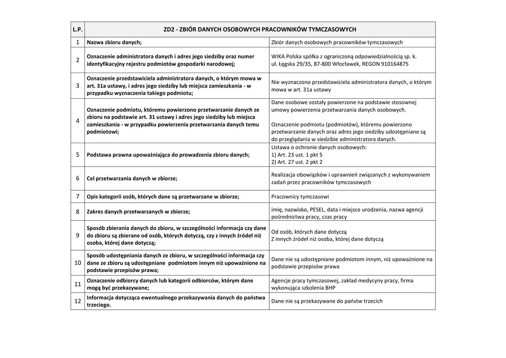L.P. ZD2 - ZBIÓR DANYCH OSOBOWYCH PRACOWNIKÓW TYMCZASOWYCH 1 Nazwa zbioru danych; Zbiór danych osobowych pracowników tymczasowych 2 Oznaczenie administratora danych i adres jego siedziby oraz numer identyfikacyjny rejestru podmiotów gospodarki narodowej; WIKA Polska spółka z ograniczoną odpowiedzialnością sp. k. ul. Łęgska 29/35, 87-800 Włocławek, REGON 910164875 3 Oznaczenie przedstawiciela administratora danych, o którym mowa w art. 31a ustawy, i adres jego siedziby lub miejsca zamieszkania - w przypadku wyznaczenia takiego podmiotu; Nie wyznaczono przedstawiciela administratora danych, o którym mowa w art. 31a ustawy 4 Oznaczenie podmiotu, któremu powierzono przetwarzanie danych ze zbioru na podstawie art. 31 ustawy i adres jego siedziby lub miejsca zamieszkania - w przypadku powierzenia przetwarzania danych temu podmiotowi; 5 Podstawa prawna upoważniająca do prowadzenia zbioru danych; 6 Cel przetwarzania danych w zbiorze; Realizacja obowiązków i uprawnień związanych z wykonywaniem zadań przez pracowników tymczasowych 7 Opis kategorii osób, których dane są przetwarzane w zbiorze; Pracownicy tymczasowi 8 Zakres danych przetwarzanych w zbiorze; imię, nazwisko, PESEL, data i miejsce urodzenia, nazwa agencji pośrednictwa pracy, czas pracy 9 Sposób zbierania danych do zbioru, w szczególności informacja czy dane Od osób, których dane dotyczą do zbioru są zbierane od osób, których dotyczą, czy z innych źródeł niż Z innych źródeł niż osoba, której dane dotyczą osoba, której dane dotyczą; Sposób udostępniania danych ze zbioru, w szczególności informacja czy 10 dane ze zbioru są udostępniane podmiotom innym niż upoważnione na podstawie przepisów prawa; Dane osobowe zostały powierzone na podstawie stosownej umowy powierzenia przetwarzania danych osobowych. Oznaczenie podmiotu (podmiotów), któremu powierzono przetwarzanie danych oraz adres jego siedziby udostępniane są do przeglądania w siedzibie administratora danych. Ustawa o ochronie danych osobowych: 1) Art. 23 ust. 1 pkt 5 2) Art. 27 ust. 2 pkt 2 Dane nie są udostępniane podmiotom innym, niż upoważnione na podstawie przepisów prawa 11 Oznaczenie odbiorcy danych lub kategorii odbiorców, którym dane mogą być przekazywane; Agencje pracy tymczasowej, zakład medycyny pracy, firma wykonująca szkolenia BHP 12 Informacja dotycząca ewentualnego przekazywania danych do państwa trzeciego. Dane nie są przekazywane do państw trzecich