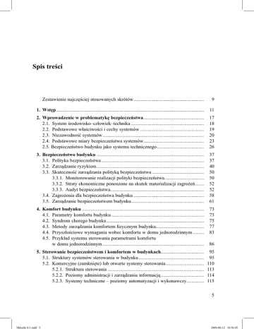 Spis treści Zestawienie najczęściej stosowanych skrótów ......................................................... 9 1. Wstęp ........................................................................................................................ 11 2. Wprowadzenie w problematykę bezpieczeństwa ................................................. 2.1. System środowisko–człowiek–technika ........................................................... 2.2. Podstawowe właściwości i cechy systemów .................................................... 2.3. Niezawodność systemów .................................................................................. 2.4. Podstawowe miary bezpieczeństwa systemów ................................................. 2.5. Bezpieczeństwo budynku jako systemu technicznego ...................................... 17 18 19 20 23 26 3. Bezpieczeństwo budynku ....................................................................................... 3.1. Polityka bezpieczeństwa ................................................................................... 3.2. Zarządzanie ryzykiem ....................................................................................... 3.3. Skuteczność zarządzania polityką bezpieczeństwa .......................................... 3.3.1. Monitorowanie realizacji polityki bezpieczeństwa................................ 3.3.2. Straty ekonomiczne ponoszone na skutek materializacji zagrożeń ....... 3.3.3. Audyt bezpieczeństwa............................................................................ 3.4. Zagrożenia dla bezpieczeństwa budynku ......................................................... 3.5. Zarządzanie bezpieczeństwem budynku ........................................................... 37 37 40 50 50 52 52 58 61 4. Komfort budynku ................................................................................................... 4.1. Parametry komfortu budynku ........................................................................... 4.2. Syndrom chorego budynku ............................................................................... 4.3. Metody zarządzania komfortem fizycznym budynku....................................... 4.4. Przyszłościowe wymagania wobec komfortu w domu jednorodzinnym ......... 4.5. Przykład systemu sterowania parametrami komfortu w domu jednorodzinnym .................................................................................. 73 73 75 77 83 5. Sterowanie bezpieczeństwem i komfortem w budynkach................................... 5.1. Struktury systemów sterowania w budynku ..................................................... 5.2. Komercyjne (zamknięte) lub otwarte systemy sterowania ............................... 5.2.1. Struktura sterowania .............................................................................. 5.2.2. Poziomy administracji i zarządzania informacją ................................... 5.2.3. Systemy techniczne – poziomy automatyzacji i wykonawczy.............. 95 95 110 113 114 115 86 5 Mikulik 0-1.indd 5 2008-06-12 10:56:05 5.2.4. Systemy bezpieczeństwa – poziomy automatyzacji i wykonawczy ........................................................................................ 5.2.5. Wybrane otwarte systemy sterowania.................................................... 5.2.6. Podsumowanie ....................................................................................... 5.3. Zintegrowane systemy sterowania .................................................................... 5.3.1. Przykład systemu integrującego ............................................................ 6. Systemy zapewniania bezpieczeństwa ludzi w budynkach ................................. 6.1. Bezpieczeństwo pożarowe budynków .............................................................. 6.2. System sygnalizacji pożarowej SSP ................................................................. 6.2.1. Pożar i możliwości jego detekcji ........................................................... 6.2.2. Czujki dymu ........................................................................................... 6.2.3. Czujki płomieni ...................................................................................... 6.2.4. Czujki temperatury ................................................................................. 6.2.5. Ręczne ostrzegacze pożarowe................................................................ 6.2.6. Izolatory zwarć ....................................................................................... 6.2.7. Centrala alarmowa systemu SSP............................................................ 6.2.8. Współpraca SSP z systemami bezpieczeństwa pożarowego budynku ............................................................................. 6.2.9. Zalecenia ochrony przeciwpożarowej dla zarządcy budynku ............... 6.3. Systemy gaszenia pożarów ............................................................................... 6.3.1. Wymagania ogólne stawiane systemom automatycznego gaszenia ...... 6.3.2. Systemy gaszenia wodą ......................................................................... 6.3.3. System tryskaczowy ............................................................................... 6.3.4. System zraszaczy ................................................................................... 6.3.5. Niskociśnieniowe systemy gaszenia mgłą wodną Fog .......................... 6.3.6. Systemy gaszenia ditlenkiem węgla (CO2) ............................................ 6.3.7. Systemy gaszenia gazami inercyjnymi .................................................. 6.3.8. Systemy gaszenia gazem FM-200 ......................................................... 6.3.9. Systemy gaszenia gazami pomieszczeń specjalnych ............................. 6.3.10. Gaszenie pożarów w obiektach budowlanych wy