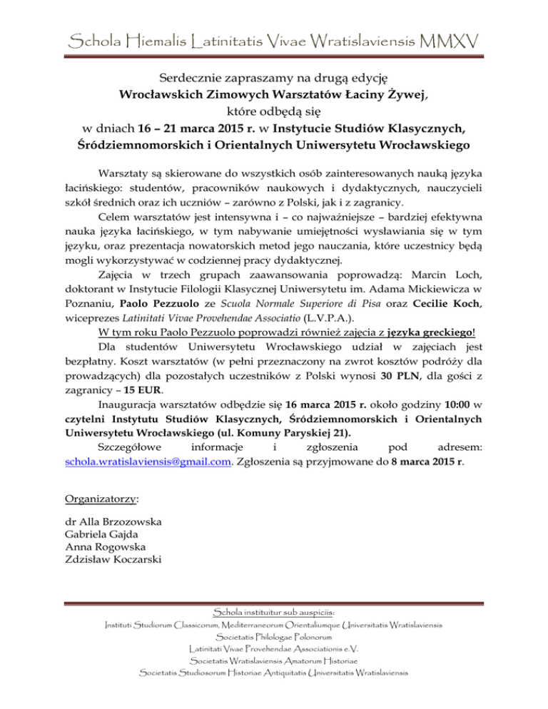 Schola Hiemalis Latinitatis Vivae Wratislaviensis MMXV Serdecznie zapraszamy na drugą edycję Wrocławskich Zimowych Warsztatów Łaciny Żywej, które odbędą się w dniach 16 – 21 marca 2015 r. w Instytucie Studiów Klasycznych, Śródziemnomorskich i Orientalnych Uniwersytetu Wrocławskiego Warsztaty są skierowane do wszystkich osób zainteresowanych nauką języka łacińskiego: studentów, pracowników naukowych i dydaktycznych, nauczycieli szkół średnich oraz ich uczniów – zarówno z Polski, jak i z zagranicy. Celem warsztatów jest intensywna i – co najważniejsze – bardziej efektywna nauka języka łacińskiego, w tym nabywanie umiejętności wysławiania się w tym języku, oraz prezentacja nowatorskich metod jego nauczania, które uczestnicy będą mogli wykorzystywać w codziennej pracy dydaktycznej. Zajęcia w trzech grupach zaawansowania poprowadzą: Marcin Loch, doktorant w Instytucie Filologii Klasycznej Uniwersytetu im. Adama Mickiewicza w Poznaniu, Paolo Pezzuolo ze Scuola Normale Superiore di Pisa oraz Cecilie Koch, wiceprezes Latinitati Vivae Provehendae Associatio (L.V.P.A.). W tym roku Paolo Pezzuolo poprowadzi również zajęcia z języka greckiego! Dla studentów Uniwersytetu Wrocławskiego udział w zajęciach jest bezpłatny. Koszt warsztatów (w pełni przeznaczony na zwrot kosztów podróży dla prowadzących) dla pozostałych uczestników z Polski wynosi 30 PLN, dla gości z zagranicy – 15 EUR. Inauguracja warsztatów odbędzie się 16 marca 2015 r. około godziny 10:00 w czytelni Instytutu Studiów Klasycznych, Śródziemnomorskich i Orientalnych Uniwersytetu Wrocławskiego (ul. Komuny Paryskiej 21). Szczegółowe informacje i zgłoszenia pod adresem: [email protected]. Zgłoszenia są przyjmowane do 8 marca 2015 r. Organizatorzy: dr Alla Brzozowska Gabriela Gajda Anna Rogowska Zdzisław Koczarski Schola instituitur sub auspiciis: Instituti Studiorum Classicorum, Mediterraneorum Orientaliumque Universitatis Wratislaviensis Societatis Philologae Polonorum Latinitati Vivae Provehendae Associationis e.V. Societatis Wratislaviensis Amatorum Historiae Societatis Studiosorum Historiae Antiquitatis Universitatis Wratislaviensis