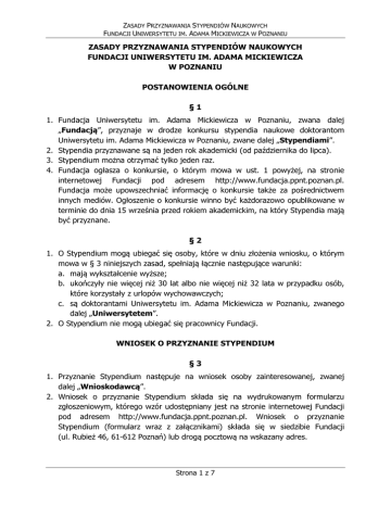 ZASADY PRZYZNAWANIA STYPENDIÓW NAUKOWYCH FUNDACJI UNIWERSYTETU IM. ADAMA MICKIEWICZA W POZNANIU ZASADY PRZYZNAWANIA STYPENDIÓW NAUKOWYCH FUNDACJI UNIWERSYTETU IM. ADAMA MICKIEWICZA W POZNANIU POSTANOWIENIA OGÓLNE §1 1. Fundacja Uniwersytetu im. Adama Mickiewicza w Poznaniu, zwana dalej „Fundacją”, przyznaje w drodze konkursu stypendia naukowe doktorantom Uniwersytetu im. Adama Mickiewicza w Poznaniu, zwane dalej „Stypendiami”. 2. Stypendia przyznawane są na jeden rok akademicki (od października do lipca). 3. Stypendium można otrzymać tylko jeden raz. 4. Fundacja ogłasza o konkursie, o którym mowa w ust. 1 powyżej, na stronie internetowej Fundacji pod adresem http://www.fundacja.ppnt.poznan.pl. Fundacja może upowszechniać informację o konkursie także za pośrednictwem innych mediów. Ogłoszenie o konkursie winno być każdorazowo opublikowane w terminie do dnia 15 września przed rokiem akademickim, na który Stypendia mają być przyznane. §2 1. O Stypendium mogą ubiegać się osoby, które w dniu złożenia wniosku, o którym mowa w § 3 niniejszych zasad, spełniają łącznie następujące warunki: a. mają wykształcenie wyższe; b. ukończyły nie więcej niż 30 lat albo nie więcej niż 32 lata w przypadku osób, które korzystały z urlopów wychowawczych; c. są doktorantami Uniwersytetu im. Adama Mickiewicza w Poznaniu, zwanego dalej „Uniwersytetem”. 2. O Stypendium nie mogą ubiegać się pracownicy Fundacji. WNIOSEK O PRZYZNANIE STYPENDIUM §3 1. Przyznanie Stypendium następuje na wniosek osoby zainteresowanej, zwanej dalej „Wnioskodawcą”. 2. Wniosek o przyznanie Stypendium składa się na wydrukowanym formularzu zgłoszeniowym, którego wzór udostępniany jest na stronie internetowej Fundacji pod adresem http://www.fundacja.ppnt.poznan.pl. Wniosek o przyznanie Stypendium (formularz wraz z załącznikami) składa się w siedzibie Fundacji (ul. Rubież 46, 61-612 Poznań) lub drogą pocztową na wskazany adres. Strona 1 z 7 ZASADY PRZYZNAWANIA STYPENDIÓW NAUKOWYCH FUNDACJI UNIWERSYTETU IM. ADAMA MICKIEWICZA W POZNANIU 3. Wniosek o przyznanie Stypendium winien być podpisany przez Wnioskodawcę oraz przez Dziekana Wydziału Uniwersytetu, w którym Wnioskodawca jest doktorantem. 4. Do wniosku (formularza zgłoszeniowego) o przyznanie Stypendium należy załączyć następujące dokumenty: a. potwierdzenie statusu doktoranta Wnioskodawcy złożone na piśmie przez Dziekana Wydziału Uniwersytetu, w którym Wnioskodawca jest doktorantem; b. w przypadku Wnioskodawcy, który ukończył 31 rok życia – oryginał dokumentu potwierdzającego korzystanie z urlopu wychowawczego albo jego odpis poświadczony przez Wnioskodawcę za zgodność z oryginałem; c. krótki opis przebiegu dotychczasowej pracy naukowej Wnioskodawcy; d. krótki, obejmujący nie więcej niż dwie strony maszynopisu opis planów naukowych Wnioskodawcy na najbliższy rok akademicki, e. w przypadku realizacji przez Wnioskodawcę projektu związanego z koniecznością wykonania doświadczeń na zwierzętach – dokument obejmujący zgodę właściwej komisji etycznej wymaganą na podstawie przepisów o doświadczeniach na zwierzętach; f. w przypadku realizacji przez Wnioskodawcę projektu naukowego obejmującego badania nad gatunkami roślin, zwierząt lub grzybów objętych ochroną gatunkową albo na obszarach objętych ochroną – dokument obejmujący zgodę lub zezwolenie wymagane na podstawie przepisów o ochronie przyrody; g. w przypadku realizacji przez Wnioskodawcę projektu naukowego obejmującego prowadzenie badań nad organizmami genetycznie zmodyfikowanymi lub z zastosowaniem takich organizmów - oświadczenie kierownika jednostki naukowej, w której projekt ma być realizowany, o posiadaniu zgody wymaganej na podstawie przepisów o organizmach genetycznie zmodyfikowanych; h. opinię o Wnioskodawcy jego opiekuna naukowego; i. nadbitki lub kserokopie najważniejszych publikacji Wnioskodawcy; j. wykaz ocen uzyskanych przez Wnioskodawcę do dnia złożenia wniosku na egzaminach i zaliczeniach w trakcie studiów doktoranckich. 5. Wniosek o przyznanie Stypendium na dany rok akademicki składa się w terminie do dnia 30 września, poprzedzającego rok akademicki. 6. Wniosek może być cofnięty przez Wnioskodawcę na każdym etapie postępowania. Cofnięcie wniosku następuje przez złożenie Fundacji oświadczenia w tym przedmiocie na piśmie. 7. Wniosek, który nie spełnia warunków określonych w § 2 niniejszych zasad oraz w ust. 2-4 powyżej, jak również wniosek złożony po terminie określonym w ust. 5 powyżej, nie podlega rozpoznaniu. W przypadku wniosku złożonego drogą pocztową, o zachowaniu terminu decyduje data doręczenia wniosku do siedziby Fundacji. Strona 2 z 7 ZASADY PRZYZNAWANIA STYPENDIÓW NAUKOWYCH FUNDACJI UNIWERSYTETU IM. ADAMA MICKIEWICZA W POZNANIU PRZYZNANIE STYPENDIUM §4 1. Wniosek o przyznanie Stypendium podlega ocenie merytorycznej. Podstawowym kryterium oceny wniosku są udokumentowane publikacjami twórcze osiągnięcia naukowe Wnioskodawcy uzyskane przez Wnioskodawcę w okresie poprzedzającym ubieganie się o Stypendium. Kryterium uzupełniającym oceny wniosku jest zgłoszony przez Wnioskodawcę opis planów naukowych na najbliższy rok akademicki. 2. Oceny merytorycznej wniosku o przyznanie Stypendium dokonuje Rada funduszu celowego pod nazwą „Stypendia Fundacji Uniwersytetu im. Adama Mickiewicza w Poznaniu” zwanego dalej „Funduszem”, w skład której wchodzą: a) Rektor Uniwersytetu albo upoważniony przez Rektora Uniwersytetu Prorektor właściwy ds. studiów doktoranckich, b) Prezes Zarządu Fundacji albo osoba przez niego upoważniona, c) przedstawiciel Rady Nadzorczej Fundacji, wyłoniony w drodze uchwały Rady Nadzorczej Fundacji, d) przedstawiciel Stowarzyszenia Absolwentów Uniwersytetu Poznańskiego, e) pracownik Fundacji upoważniony przez Zarząd Fundacji. 3. Upoważnienie do działania w imieniu osób wskazan