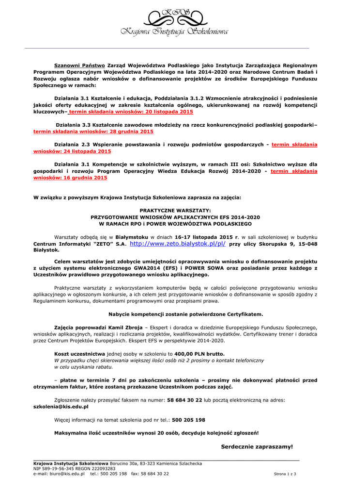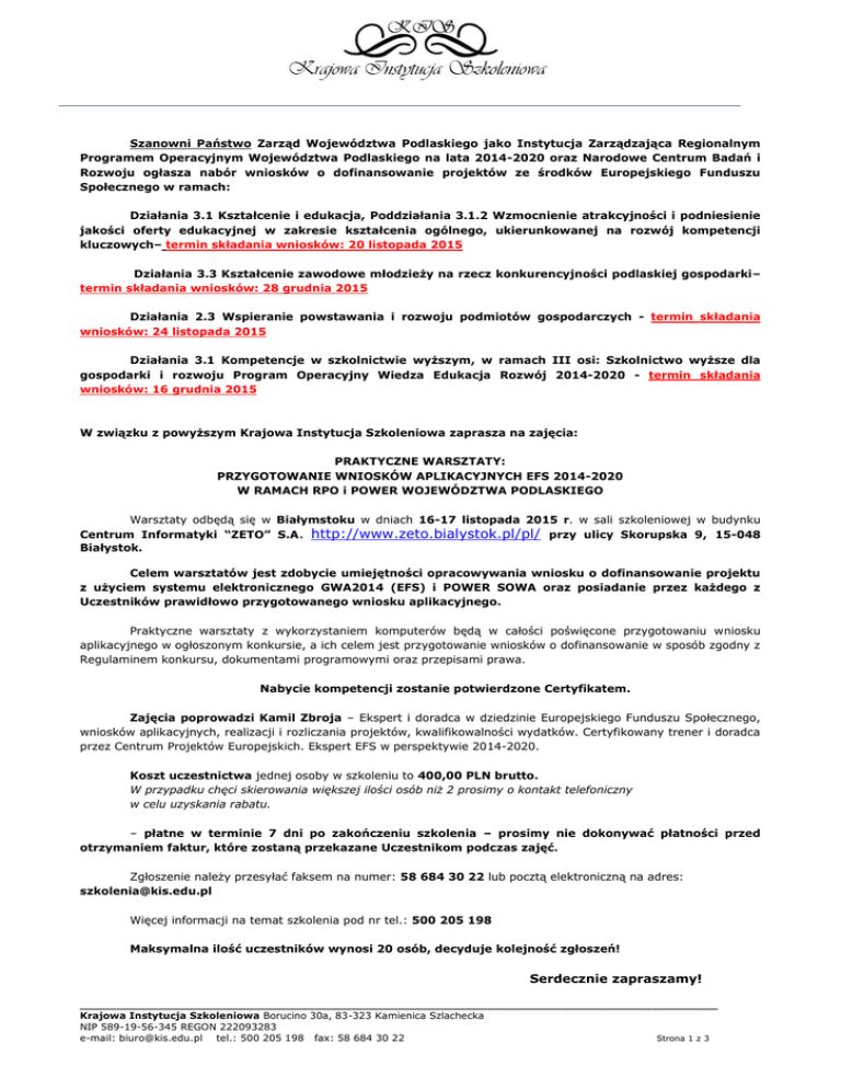 Szanowni Państwo Zarząd Województwa Podlaskiego jako Instytucja Zarządzająca Regionalnym Programem Operacyjnym Województwa Podlaskiego na lata 2014-2020 oraz Narodowe Centrum Badań i Rozwoju ogłasza nabór wniosków o dofinansowanie projektów ze środków Europejskiego Funduszu Społecznego w ramach: Działania 3.1 Kształcenie i edukacja, Poddziałania 3.1.2 Wzmocnienie atrakcyjności i podniesienie jakości oferty edukacyjnej w zakresie kształcenia ogólnego, ukierunkowanej na rozwój kompetencji kluczowych– termin składania wniosków: 20 listopada 2015 Działania 3.3 Kształcenie zawodowe młodzieży na rzecz konkurencyjności podlaskiej gospodarki– termin składania wniosków: 28 grudnia 2015 Działania 2.3 Wspieranie powstawania i rozwoju podmiotów gospodarczych - termin składania wniosków: 24 listopada 2015 Działania 3.1 Kompetencje w szkolnictwie wyższym, w ramach III osi: Szkolnictwo wyższe dla gospodarki i rozwoju Program Operacyjny Wiedza Edukacja Rozwój 2014-2020 - termin składania wniosków: 16 grudnia 2015 W związku z powyższym Krajowa Instytucja Szkoleniowa zaprasza na zajęcia: PRAKTYCZNE WARSZTATY: PRZYGOTOWANIE WNIOSKÓW APLIKACYJNYCH EFS 2014-2020 W RAMACH RPO i POWER WOJEWÓDZTWA PODLASKIEGO Warsztaty odbędą się w Białymstoku w dniach 16-17 listopada 2015 r. w sali szkoleniowej w budynku Centrum Informatyki “ZETO” S.A. http://www.zeto.bialystok.pl/pl/ przy ulicy Skorupska 9, 15-048 Białystok. Celem warsztatów jest zdobycie umiejętności opracowywania wniosku o dofinansowanie projektu z użyciem systemu elektronicznego GWA2014 (EFS) i POWER SOWA oraz posiadanie przez każdego z Uczestników prawidłowo przygotowanego wniosku aplikacyjnego. Praktyczne warsztaty z wykorzystaniem komputerów będą w całości poświęcone przygotowaniu wniosku aplikacyjnego w ogłoszonym konkursie, a ich celem jest przygotowanie wniosków o dofinansowanie w sposób zgodny z Regulaminem konkursu, dokumentami programowymi oraz przepisami prawa. Nabycie kompetencji zostanie potwierdzone Certyfikatem. Zajęcia poprowadzi Kamil Zbroja – Ekspert i doradca w dziedzinie Europejskiego Funduszu Społecznego, wniosków aplikacyjnych, realizacji i rozliczania projektów, kwalifikowalności wydatków. Certyfikowany trener i doradca przez Centrum Projektów Europejskich. Ekspert EFS w perspektywie 2014-2020. Koszt uczestnictwa jednej osoby w szkoleniu to 400,00 PLN brutto. W przypadku chęci skierowania większej ilości osób niż 2 prosimy o kontakt telefoniczny w celu uzyskania rabatu. – płatne w terminie 7 dni po zakończeniu szkolenia – prosimy nie dokonywać płatności przed otrzymaniem faktur, które zostaną przekazane Uczestnikom podczas zajęć. Zgłoszenie należy przesyłać faksem na numer: 58 684 30 22 lub pocztą elektroniczną na adres: [email protected] Więcej informacji na temat szkolenia pod nr tel.: 500 205 198 Maksymalna ilość uczestników wynosi 20 osób, decyduje kolejność zgłoszeń! Serdecznie zapraszamy! __________________________________________________________________________________________________________ Krajowa Instytucja Szkoleniowa Borucino 30a, 83-323 Kamienica Szlachecka NIP 589-19-56-345 REGON 222093283 e-mail: [email protected] tel.: 500 205 198 fax: 58 684 30 22 Strona 1 z 3 PROGRAM PRAKTYCZNE WARSZTATY: PRZYGOTOWANIE WNIOSKÓW APLIKACYJNYCH EFS 2014-2020 W RAMACH RPO i POWER WOJEWÓDZTWA PODLASKIEGO Trener: Kamil Zbroja Dzień I Godzina 9.00 – 10.30 10.30 – 10.45 10.45 – 12.15 Temat Praca z Generatorem wniosków aplikacyjnych RPO w podlaskiego. Praca z Generatorem wniosków aplikacyjnych PO WER SOWA Regulaminy konkursów ogłoszonych konkursów Wybór rodzaju projektów do opracowania na warsztatach. Przerwa na kawę Karta oceny formalnej wniosku. Karta oceny merytorycznej wniosku. Wytyczne kwalifikowania wydatków. Szczegółowe kryteria dostępu. 12.15 – 12.45 Przerwa na lunch 12.45 – 14.15 14.15 – 14.30 Przerwa na kawę 14.30 – 16.00 Wskaźniki realizacji Celu projektu oraz Celu szczegółowego Programu Operacyjnego Cel szczegółowy projektu. Grupy docelowe projektu. Potrzeby i oczekiwania uczestników. Rekrutacja, równy dostęp, równość płci. Dzień II Godzina 9.00 – 10.30 10.30 – 10.45 10.45 – 12.15 Temat Opis zadań – wskaźniki. Zgodność realizacji projektu z przepisami prawa krajowego. Przerwa na kawę Trwałość rezultatów i oddziaływanie. Szczegółowy budżet projektu. Koszty pośrednie rozliczane ryczałtem. Projekty w całości rozliczane kwotami ryczałtowymi. 12.15 – 12.45 Przerwa na lunch 12.45 – 14.15 14.15 – 14.30 Przerwa na kawę 14.30 – 16.00 16.00 Budżet ogólny projektu. Wkład własny w projektach. Oświadczenia i uzasadnienia. Analiza opracowanych merytorycznych. projektów na podstawie kart ocen formalnych i Podsumowanie, zakończenie i rozdanie certyfikatów. Praktyczne warsztaty będą składały się z trzech części: 1. Prezentacja konkursów oraz dokumentów regulujących przygotowanie wniosków i realizację projektów. 2. Wybór projektów do opracowania podczas zajęć i przygotowanie wniosków o dofinansowanie projektów. 3. Ocena formalna i merytoryczna opracowanych wniosków. Na warsztatach uczestnicy będą mogli korzystać z komputerów posiadających dostęp do Internetu co pozwoli na wyszukiwanie informacji niezbędnych do opracowania wniosków oraz na przygotowanie ich w Systemie GWA. __________________________________________________________________________________________________________ Krajowa Instytucja Szkoleniowa Borucino 30a, 83-323 Kamienica Szlachecka NIP 589-19-56-345 REGON 222093283 e-mail: [email protected] tel.: 500 205 198 fax: 58 684 30 22 Strona 2 z 3 FORMULARZ ZGŁOSZENIOWY NA SZKOLENIE 1. DANE DOTYCZĄCE SZKOLENIA Nazwa szkolenia lub kursu: PRAKTYCZNE WARSZTATY: PRZYGOTOWANIE WNIOSKÓW APLIKACYJNYCH EFS 2014-2020 W RAMACH RPO i POWER WOJEWÓDZTWA PODLASKIEGO Cena jednostkowa w PLN brutto: 400,00 Termin: Białystok