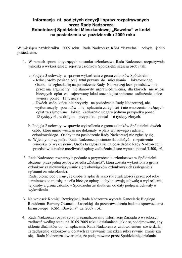 Informacja nt. podjętych decyzji i spraw rozpatrywanych przez Radę Nadzorczą Robotniczej Spółdzielni Mieszkaniowej „Bawełna” w Łodzi na posiedzeniu w październiku 2009 roku W miesiącu październiku 2009 roku Rada Nadzorcza RSM “Bawełna” odbyła jedno posiedzenie. 1. W ramach spraw dotyczących stosunku członkostwa Rada Nadzorcza rozpatrywała wnioski o wykreślenie z rejestru członków Spółdzielni sześciu osób i tak: a. Podjęła 3 uchwały w sprawie wykreślenia z grona członków Spółdzielni: - Jednej osoby posiadającej tytuł prawny do mieszkania lokatorskiego. Osoba ta zgłosiła się na posiedzenie Rady Nadzorczej lecz przedstawione przez nią argumenty nie stanowiły usprawiedliwienia, dla których nie wnosi bieżących opłat za zajmowany lokal oraz nie jest spłacane zadłużenie, które wynosi ponad 13 tysięcy zl. - Dwóch osób, które nie przyszły na posiedzenie Rady Nadzorczej, nie wytłumaczyły powodów nie spłacania zaległości i nie wnoszenia bieżących opłat za zajmowane lokale. Zadłużenie sięga w jednym przypadku ponad 18 tysięcy zł , w drugim przypadku ponad 16 tysięcy złotych. b. Podjęła 2 uchwały w sprawie wykreślenia z grona członków Spółdzielni dwóch osób, które mimo wezwań nie dokonały wpłaty wpisowego i udziału członkowskiego. Osoby te na posiedzenie Rady Nadzorczej nie zgłosiły się. c. W jednym przypadku Rada Nadzorcza postanowiła odłożyć rozpatrzenie wniosku o wykreślenie. Osoba ta zgłosiła się na posiedzenie Rady Nadzorczej i przedstawiła realne możliwości spłaty zadłużenia, które wynosi ponad 3.500,- zł. 2. Rada Nadzorcza rozpatrzyła podanie o przywrócenie członkostwa w Spółdzielni złożone przez jedną osobę z osiedla „Żubardż”, która została wykreślona z grona członków za niewywiązywanie się z obowiązków członkowskich (zaleganie z opłatami za mieszkanie). Rada, biorąc pod uwagę, że osoba ta spłaciła wszystkie zaległości i przez pół roku terminowo co miesiąc płaciła bieżące opłaty, uchyliła swoją uchwałę o wykreśleniu tej osoby z grona członków Spółdzielni ze skutkiem od daty podjęcia uchwały o wykreśleniu. 3. Na wniosek Komisji Rewizyjnej, Rada Nadzorcza wybrała Kancelarię Biegłego Rewidenta Barbary Cwanek – Łaseckiej do przeprowadzenia badania sprawozdania finansowego RSM „Bawełna” za 2009 rok. 4. Rada Nadzorcza rozpatrzyła i przeanalizowaniu Informację Zarządu o wysokości zadłużeń według stanu na 30.09.2009 roku i działaniach jakie są podejmowane, aby skłonić dłużników do ich spłacania. Rada Nadzorcza z zadowoleniem stwierdziła, iż zadłużenie członków w opłatach za używanie mieszkań sukcesywnie zmniejsza się. Rada Nadzorcza stwierdziła, że podejmowane przez Spółdzielnię działania windykacyjne przynoszą efekty i utrzymuje się tendencja spadkowa zadłużeń. 5. Rada Nadzorcza podjęła decyzję o udzieleniu bonifikaty od opłat rocznych z tytułu wieczystego użytkowania gruntu w formie jednorazowej ulgi w opłatach za używanie lokali 419 uprawnionym członkom Spółdzielni. 6. Rada Nadzorcza wybrała spośród swoich członków dwie osoby do udziału w pracach Komisji do spraw wyboru wykonawców na roboty remontowe w 2010 roku, w charakterze obserwatorów z dostępem do materiałów. 7. Rada Nadzorcza po rozpatrzeniu wniosków podjęła uchwały dotyczące wyrażenia zgody na ustanowienie nieodpłatnej służebności : a) na rzecz nieruchomości położonych przy ul. 1 Maja 76 ( bl. 18), 76a (garaże), 84/86 (bl.15) oraz przy ul. Więckowskiego 97 ( bl.16), b) gruntowej na działce drogowej przylegającej do nieruchomości położonych przy ul. Zakładowej 48, 50, 52 (budynki 103,102,101) oraz przy ul. Ziemowita 1, 3, 5. 7/9, 11, 13 (budynki 105 – 110) oraz służebności wzajemnych między tymi nieruchomościami polegającymi na prawie wzajemnego korzystania z placów zabaw i terenów zieleni , c) na rzecz nieruchomości położonych przy ul. Zakładowej 54, 56, 58 (budynki 139, 138, 137 ) oraz przy ul. Ziemowita 15, 17, 19/21, 23, 25 27 ( budynki 141 – 146) , d) prawa przejścia i przejazdu przez działki położone przy ul. Ziemowita 6 ( bl.111) i przy ul. Dąbrówki 3, 5, 7 ( budynki 112, 113, 114) , e) na rzecz nieruchomości położonych przy ul. Sierakowskiego 1/5 ( bl. 222) oraz przy ul. Wrześnieńskiej 67/69, 71/73 ( budynki 220, 221). 8. Rada Nadzorcza udzieliła odpowiedzi na wystąpienie mieszkańców bloku 138 dotyczące uciążliwości zamieszkania spowodowanej głównie zakłócaniem spokoju przez odbywającą się działalność handlową przy ul. Zakładowej. Łódź, dnia 10.11.2009 roku Sporządziła: Urszula Gorzkiewicz