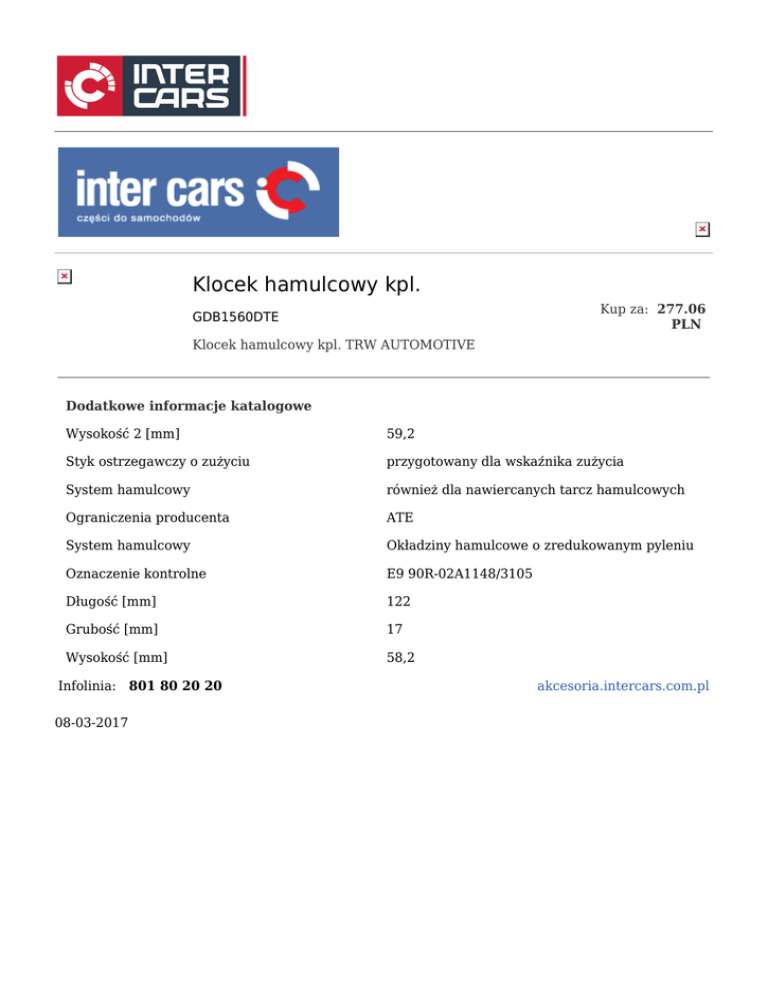 Klocek hamulcowy kpl. Kup za: 277.06 PLN GDB1560DTE Klocek hamulcowy kpl. TRW AUTOMOTIVE Dodatkowe informacje katalogowe Wysokość 2 [mm] 59,2 Styk ostrzegawczy o zużyciu przygotowany dla wskaźnika zużycia System hamulcowy również dla nawiercanych tarcz hamulcowych Ograniczenia producenta ATE System hamulcowy Okładziny hamulcowe o zredukowanym pyleniu Oznaczenie kontrolne E9 90R-02A1148/3105 Długość [mm] 122 Grubość [mm] 17 Wysokość [mm] 58,2 Infolinia: 801 80 20 20 08-03-2017 akcesoria.intercars.com.pl