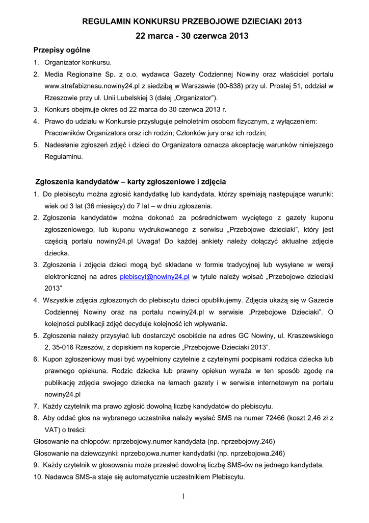 REGULAMIN KONKURSU PRZEBOJOWE DZIECIAKI 2013 22 marca - 30 czerwca 2013 Przepisy ogólne 1. Organizator konkursu. 2. Media Regionalne Sp. z o.o. wydawca Gazety Codziennej Nowiny oraz właściciel portalu www.strefabiznesu.nowiny24.pl z siedzibą w Warszawie (00-838) przy ul. Prostej 51, oddział w Rzeszowie przy ul. Unii Lubelskiej 3 (dalej „Organizator”). 3. Konkurs obejmuje okres od 22 marca do 30 czerwca 2013 r. 4. Prawo do udziału w Konkursie przysługuje pełnoletnim osobom fizycznym, z wyłączeniem: Pracowników Organizatora oraz ich rodzin; Członków jury oraz ich rodzin; 5. Nadesłanie zgłoszeń zdjęć i dzieci do Organizatora oznacza akceptację warunków niniejszego Regulaminu. Zgłoszenia kandydatów – karty zgłoszeniowe i zdjęcia 1. Do plebiscytu można zgłosić kandydatkę lub kandydata, którzy spełniają następujące warunki: wiek od 3 lat (36 miesięcy) do 7 lat – w dniu zgłoszenia. 2. Zgłoszenia kandydatów można dokonać za pośrednictwem wyciętego z gazety kuponu zgłoszeniowego, lub kuponu wydrukowanego z serwisu „Przebojowe dzieciaki”, który jest częścią portalu nowiny24.pl Uwaga! Do każdej ankiety należy dołączyć aktualne zdjęcie dziecka. 3. Zgłoszenia i zdjęcia dzieci mogą być składane w formie tradycyjnej lub wysyłane w wersji elektronicznej na adres [email protected] w tytule należy wpisać „Przebojowe dzieciaki 2013” 4. Wszystkie zdjęcia zgłoszonych do plebiscytu dzieci opublikujemy. Zdjęcia ukażą się w Gazecie Codziennej Nowiny oraz na portalu nowiny24.pl w serwisie „Przebojowe Dzieciaki”. O kolejności publikacji zdjęć decyduje kolejność ich wpływania. 5. Zgłoszenia należy przysyłać lub dostarczyć osobiście na adres GC Nowiny, ul. Kraszewskiego 2, 35-016 Rzeszów, z dopiskiem na kopercie „Przebojowe Dzieciaki 2013”. 6. Kupon zgłoszeniowy musi być wypełniony czytelnie z czytelnymi podpisami rodzica dziecka lub prawnego opiekuna. Rodzic dziecka lub prawny opiekun wyraża w ten sposób zgodę na publikację zdjęcia swojego dziecka na łamach gazety i w serwisie internetowym na portalu nowiny24.pl 7. Każdy czytelnik ma prawo zgłosić dowolną liczbę kandydatów do plebiscytu. 8. Aby oddać głos na wybranego uczestnika należy wysłać SMS na numer 72466 (koszt 2,46 zł z VAT) o treści: Głosowanie na chłopców: nprzebojowy.numer kandydata (np. nprzebojowy.246) Głosowanie na dziewczynki: nprzebojowa.numer kandydatki (np. nprzebojowa.246) 9. Każdy czytelnik w głosowaniu może przesłać dowolną liczbę SMS-ów na jednego kandydata. 10. Nadawca SMS-a staje się automatycznie uczestnikiem Plebiscytu. 1 11. Wysłanie przez Użytkownika wiadomości SMS na zasadach określonych w niniejszym regulaminie jest równoznaczne ze złożeniem przez niego oświadczenia, iż wyraża on zgodę na postanowienia niniejszego Regulaminu. 12. Z jednego telefonu można przesłać dowolną liczbę SMS-ów na dowolnego kandydata. 13. SMS-y przesłane po zakończeniu głosowania (po godzinie 24.00 w ostatnim dniu głosowania) nie zostaną uznane. 14. Uczestnik plebiscytu poprzez wysłanie SMS-a z głosem na wybraną opcję zamawia wiadomość informacyjno-reklamową sponsora plebiscytu i lub partnerów reklamowych organizatora. Wysyłanie wiadomości może być zablokowane po wysłaniu SMS-a o treści n.stop na nr 71466. Koszt wysłania wiadomości - 1 zł / 1,23 zł z VAT. Numer telefonu uczestnika zostanie usunięty z bazy w ciągu 48 godzin. 15. Numery telefonów osób biorących udział w głosowaniu SMS-owym będą przechowywane w celach marketingowych przez firmę M2A Sp. z o.o. 16. Zaplecze techniczne usług SMS zapewnia firma Mobile Marketing Alliance, właściciel systemu Cumulus. Harmonogram przebiegu plebiscytu I etap (22 marca 2013 – 19 maja 2013) Czas zgłaszania kandydatów z fotografiami i druk kuponu zgłoszeniowego. Rozpoczęcie głosowania i publikacja zdjęć kandydatów:. Zakończenie przyjmowania zgłoszeń 5.05.2013 Na podstawie zgromadzonych głosów, w dniu 19 maja 2013 do ścisłego finału przejdzie 20 dziewczynek i 20 chłopców z największą liczbą głosów. Zakończenie głosowania SMS-ami w I etapie - 19 maja 2013, godz. 24.00. II etap (21 maja 2013 – 5 czerwca 2013) Rozpoczęcie głosowania na finałową „40” (20 dziewczynek i 20 chłopców) Zakończenie głosowania SMS-ami w II etapie - 5 czerwca 2013, godz. 24.00. Uwaga! Głosy z pierwszego etapu nie przechodzą do II etapu zabawy i tym samym nie będą sumowane. Nagrody W plebiscycie nagrodzone zostaną dzieci, które zdobyły największą liczbę głosów. Ponadto komisja konkursowa przyzna własne nagrody, biorąc pod uwagę treść wypełnionej ankiety i oryginalność dzieci. O tym komu przypadnie dodatkowa nagroda zdecydują członkowie komisji, w skład której wejdą również przedstawiciele sponsorów i partnerów plebiscytu. Z posiedzenia komisji spisany zostanie protokół. Wyniki obrad komisji zostaną opublikowane na łamach Nowin i na portalu nowiny24.pl 2 Szczegółowy wykaz nagród dla poszczególnych laureatów i uczestników konkursu stanowi załącznik nr 1 do niniejszego regulaminu. Organizator zastrzega sobie prawo zmiany treści w/w załącznika (celem dodania lub zmiany poszczególnych drobnych nagród, w przypadku rozszerzenia listy sponsorów) - Wszystkie dzieci biorące udział w konkursie zostaną zaproszone na galę finałową konkursu, która odbędzie się w Rzeszowie. Jej miejsce i data zostaną opublikowane na łamach Nowin - Podczas gali finałowej zwycięzcy otrzymają nagrody, a wszyscy uczestnicy otrzymają dyplomy, - Laureaci otrzymują nagrody wg Załącznika nr 1, - Każde dziecko, uczestnik konkursu, które nie będzie obecne podczas rozdania nagród otrzyma za pośrednictwem poczty dyplom uczestnictwa w konkursie. - Na podstawie Art. 30. 1. Pkt 2. ustawy z dnia 26 lipca 1991 r. o podatku dochodowym od osób fizycznych (tekst jednolity - Dz.U. z 2000, Nr 14, poz. 176 z po