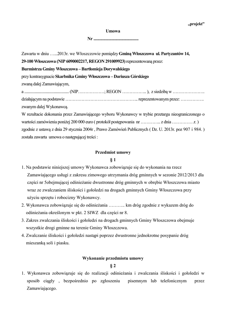 „projekt” Umowa Nr ........................................... Zawarta w dniu …...2013r. we Włoszczowie pomiędzy Gminą Włoszczowa ul. Partyzantów 14, 29-100 Włoszczowa (NIP 6090002217, REGON 291009923) reprezentowaną przez: Burmistrza Gminy Włoszczowa – Bartłomieja Dorywalskiego przy kontrasygnacie Skarbnika Gminy Włoszczowa – Dariusza Górskiego zwaną dalej Zamawiającym, a .............................................. (NIP………………; REGON …………….. ), z siedzibą w …………………. działającym na podstawie ………………………………………….. reprezentowanym przez: ……………. zwanym dalej Wykonawcą. W rezultacie dokonania przez Zamawiającego wyboru Wykonawcy w trybie przetargu nieograniczonego o wartości zamówienia poniżej 200 000 euro ( protokół postępowania nr ………….. z dnia ……………r. ) zgodnie z ustawą z dnia 29 stycznia 2004r , Prawo Zamówień Publicznych ( Dz. U. 2013r. poz 907 i 984. ) została zawarta umowa o następującej treści : Przedmiot umowy §1 1. Na podstawie niniejszej umowy Wykonawca zobowiązuje się do wykonania na rzecz Zamawiającego usługi z zakresu zimowego utrzymania dróg gminnych w sezonie 2012/2013 dla części nr 5obejmującej odśnieżanie dwustronne dróg gminnych w obrębie Włoszczowa miasto wraz ze zwalczaniem śliskości i gołoledzi na drogach gminnych Gminy Włoszczowa przy użyciu sprzętu i robocizny Wykonawcy. 2. Wykonawca zobowiązuje się do odśnieżania ……….. km dróg zgodnie z wykazem dróg do odśnieżania określonym w pkt. 2 SIWZ dla części nr 8. 3. Zakres zwalczania śliskości i gołoledzi na drogach gminnych Gminy Włoszczowa obejmuje wszystkie drogi gminne na terenie Gminy Włoszczowa. 4. Zwalczanie śliskości i gołoledzi nastąpi poprzez dwustronne jednokrotne posypanie dróg mieszanką soli i piasku. Wykonanie przedmiotu umowy §2 1. Wykonawca zobowiązuje się do realizacji odśnieżania i zwalczania śliskości i gołoledzi w sposób ciągły , bezpośrednio po zgłoszeniu Zamawiającego. pisemnym lub telefonicznym przez 2. Wykonawca podejmuje się stałego nadzoru nad przygotowaniem i realizacją przedmiotu umowy oraz ponosi całkowitą odpowiedzialność za jej wykonanie. §3 Sprzęt do realizacji odśnieżania 1.Część nr 5 tj.: odśnieżanie dwustronne dróg gminnych w obrębie Włoszczowa miasto wraz ze zwalczaniem śliskości i gołoledzi na drogach gminnych Gminy Włoszczowa zostanie zrealizowane przy zapewnieniu minimum następującego sprzętu: - piaskarki samochodowej wyposażonej w pług do odśnieżania-szt.1 - pługokoparki typu JCB3CX lub równoważnej o pojemności łyżki nie mniejszej niż 1,0 m3 – szt.1 §4 Materiał do realizacji zwalczania śliskości i gołoledzi na drogach gminnych Gminy Włoszczowa dla części nr 8: 1. Zwalczanie śliskości i gołoledzi na drogach gminnych Gminy Włoszczowa realizowane będzie przy zastosowaniu 20% mieszankę soli i piasku o stosunku wagowym piasku do soli 80%20% - Przygotowanie materiału tj. mieszanki soli i piasku w ilości min. 240 ton - zadanie Wykonawcy. - Mieszanka soli i piasku użyta do realizacji zadania nr 8 stanowi materiał Wykonawcy, winna być zgodna z Rozporządzeniem Ministra Środowiska z dnia 27 października 2005r. w sprawie rodzajów i warunków stosowania środków, jakie mogą być używane na drogach publicznych oraz ulicach i placach. 2. Wykonawca zobowiązuje się do przygotowania w/w mieszanki soli i piasku w ilości 240 ton w terminie do 31.10.2012r. Skład mieszanki – piasek 200 ton , sól 40 ton Terminy §5 1. Termin realizacji umowy obejmuje sezon zimowego utrzymania dróg 2013/2014. 2. Zamawiający i Wykonawca ustalają następujące terminy związane z realizacją umowy: 1) rozpoczęcie usług – od chwili pierwszego zgłoszenia przez Zamawiającego, 2) zakończenie usług – do 30.04.2014 r. Obowiązki Wykonawcy §6 1. Wykonawca zobowiązany jest do: 1) Przestrzegania przepisów BHP na terenie realizacji przedmiotu umowy, 2) Ponoszenia pełnej odpowiedzialność przed Policją, Strażą Miejską i innymi służbami publicznymi z tytułu bezpieczeństwa wykonywanej pracy. 2. W przypadku opóźnienia ponad 2 dni, wykonania zgłoszonych przez Zamawiającego do realizacji czynności odśnieżania, Zamawiający może zlecić ich wykonanie innemu przedsiębiorcy a Wykonawca zobowiązany jest pokryć koszty dodatkowe spowodowane powierzeniem wykonania przedmiotu umowy innemu przedsiębiorcy. Dokumentacja odśnieżania i zwalczania śliskości i gołoledzi §7 1. Wykonawca obowiązany będzie z każdej przeprowadzonej czynności odśnieżania sporządzić protokoły zgodnie ze wzorem stanowiącym załącznik nr 1, potwierdzone przez Wykonawcę i Zamawiającego, zawierające istotne ustalenia dotyczące terminu, miejsca i zakresu wykonywanych prac . 2. Protokóły zostaną sporządzone odrębnie dla : - odśnieżania pługopiaskarką - odśnieżania pługokoparką - odśnieżania pługopiaskarką ze zwalczaniem śliskości i gołoledzi przez posypywanie mieszanką soli i piasku 3. Ustala się termin przedkładania przez Wykonawcę protokołu w okresie dwutygodniowym. 4. Zamawiający ma prawo zmniejszyć ilość jednostek obmiarowych po sprawdzeniu jakości i ilości wykonanej usługi. Ubezpieczenie OC §6 Wykonawca jest zobowiązany do przedłożenia przed podpisaniem umowy kopii polisy ubezpieczeniowej od odpowiedzialności cywilnej (OC) deliktowej i kontraktowej w minimalnej wysokości 30.000,00zł na wszystkie i jedno zdarzenie oraz dowodu opłacenia polisy. Odstąpienie od umowy §7 1. Zamawiający może odstąpić od Umowy, jeżeli: 1) Wykonawca ogłosi upadłość lub w stosunku do którego otwarto likwidację 2) Wykonawca przerwał realizację usług i nie realizuje ich bez uzasadnionych przyczyn przez okres kolejnych 2 dni, 3) Wykonawca bez uzasadnionych przyczyn nie rozpoczął usług i nie podjął ich pomimo dodatkowego wezwani