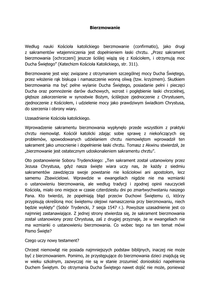 Bierzmowanie Według nauki Kościoła katolickiego bierzmowanie (confirmatio), jako drugi z sakramentów wtajemniczenia jest dopełnieniem łaski chrztu. „Przez sakrament bierzmowania [ochrzczeni] jeszcze ściślej wiążą się z Kościołem, i otrzymują moc Ducha Świętego” (Katechizm Kościoła Katolickiego, str. 311). Bierzmowanie jest więc związane z otrzymaniem szczególnej mocy Ducha Świętego, przez włożenie rąk biskupa i namaszczenie wonną oliwą (tzw. krzyżmem). Skutkiem bierzmowania ma być pełne wylanie Ducha Świętego, posiadanie pełni i pieczęci Ducha oraz pomnożenie darów duchowych, wzrost i pogłębienie łaski chrzcielnej, głębsze zakorzenienie w synostwie Bożym, ściślejsze zjednoczenie z Chrystusem, zjednoczenie z Kościołem, i udzielenie mocy jako prawdziwym świadkom Chrystusa, do szerzenia i obrony wiary. Uzasadnienie Kościoła katolickiego. Wprowadzenie sakramentu bierzmowania wypłynęło przede wszystkim z praktyki chrztu niemowląt. Kościół katolicki zdając sobie sprawę z niekończących się problemów, spowodowanych udzielaniem chrztu niemowlętom wprowadził ten sakrament jako umocnienie i dopełnienie łaski chrztu. Tomasz z Akwinu stwierdził, że „bierzmowanie jest ostatecznym udoskonaleniem sakramentu chrztu”. Oto postanowienie Soboru Trydenckiego: „Ten sakrament został ustanowiony przez Jezusa Chrystusa, gdyż nasza święte wiara uczy nas, że każdy z siedmiu sakramentów zawdzięcza swoje powstanie nie kościołowi ani apostołom, lecz samemu Zbawicielowi. Wprawdzie w ewangeliach nigdzie nie ma wzmianki o ustanowieniu bierzmowania, ale według tradycji i zgodnej opinii nauczycieli Kościoła, miało ono miejsce w czasie czterdziestu dni po zmartwychwstaniu naszego Pana. Kto twierdzi, że popełniają błąd przeciw Duchowi Świętemu ci, którzy przypisują określoną moc świętemu olejowi namaszczenia przy bierzmowaniu, niech będzie wyklęty” (Sobór Trydencki, 7 sesja 1547 r.). Powyższe uzasadnienie jest co najmniej zastanawiające. Z jednej strony stwierdza się, że sakrament bierzmowania został ustanowiony przez Chrystusa, zaś z drugiej przyznaje, że w ewangeliach nie ma wzmianki o ustanowieniu bierzmowania. Co wobec tego na ten temat mówi Pismo Święte? Czego uczy nowy testament? Chrzest niemowląt nie posiada najmniejszych podstaw biblijnych, inaczej nie może być z bierzmowaniem. Pomimo, że przystępujące do bierzmowania dzieci znajdują się w wieku szkolnym, zazwyczaj nie są w stanie zrozumieć doniosłości napełnienia Duchem Świętym. Do otrzymania Ducha Świętego nawet dojść nie może, ponieważ Bóg nie honoruje fałszywych podstaw. W Dziejach Apostolskich czytamy, że Bóg udziela Ducha Świętego tym, „którzy mu są posłuszni” (Dzieje 5:32). Chrzest niemowląt, od którego rozpoczyna się chrześcijańskie życie wiary katolika, jest sprzeczny z nauczaniem Pana Jezusa i z Jego przykładem. A zatem również bierzmowanie jest aktem chybionym. Czytając Nowy Testament nigdzie nie znajdziemy uwarunkowania otrzymania Ducha Świętego namaszczeniem olejem. W czasach apostolskich chrześcijanie otrzymywali Ducha Świętego tuż po chrzcie, podobnie do Syna Bożego i Jego wyznawców (Mateusza 3:16; Dzieje apostolskie 2:38-39). W przypadku wiernych Kościoła katolickiego mamy do czynienia z rozpiętością czasu wynoszącą 7-14 lat. Pierwsi chrześcijanie stawali się pełnoprawnymi członkami zboru (kościoła) z chwilą chrztu, i w pełni korzystali z wszelkich dóbr duchowych. Czytamy o tym w Dziejach Apostolskich: „Ci więc, którzy przyjęli słowo jego, zostali ochrzczeni (…) I trwali w nauce apostolskiej i we wspólnocie, w łamaniu chleba i w modlitwach” (Dzieje 2:41-42). Zupełnie inaczej wygląda to w życiu ochrzczonych katolickich niemowląt. Samo otrzymanie Ducha Świętego było uwarunkowane wiarą i chrztem przez zanurzenie w Imię Jezusa Chrystusa, a nie pośrednictwem biskupa, jak tego chcą katoliccy hierarchowie. Inna kwestia to nakładanie rąk przy udzielaniu Ducha Świętego. Kościół katolicki powołuje się na Dzieje apostolskie 8:14-17 twierdząc, że nakładanie rąk biskupów, jakoby następców apostołów, umożliwią bierzmowanym otrzymanie Ducha Świętego. Należy jednak zaznaczyć, że nakładanie rąk samo w sobie nie decyduje o otrzymaniu Ducha Świętego, ale absolutne posłuszeństwo wiary. Tylko wtedy możemy oczekiwać wielkich rzeczy, gdy Bóg „wyciąga rękę, aby uzdrawiać i aby się działy znaki i cuda przez imię świętego Syna swego, Jezusa” (Dzieje apostolskie 4:30-31). W przypadku Samarytan zwaśnionych z Żydami, należało postępować szczególnie rozważnie. W tej delikatnej sprawie uznano za stosowne wysłać tam apostołów, a gdy tam przybyli, „modlili się za nimi, aby otrzymali Ducha Świętego. Wtedy wkładali na nich ręce, a oni otrzymywali Ducha Świętego” (Dzieje 8:15, 17). W całym tym zdarzeniu najważniejsze było przyjęcie Słowa Bożego przez Samarytan, ich wiara, chrzest w imię Jezusa i modlitwa o dar Ducha Świętego. Natomiast nałożenie rąk było wyrazem pełnej ich akceptacji. W wielu innych przypadkach wierzący na różne sposoby otrzymywali Ducha Świętego. Na przykład w domu rzymskiego setnika, Korneliusza, w trakcie zwiastowania Ewangelii, zanim apostoł Piotr kogokolwiek ochrzcił, „zstąpił Duch Święty na wszystkich słuchających tej mowy. I zdumiewali się wierni pochodzenia żydowskiego, którzy z Piotrem przyszli, że i na pogan został wylany dar Ducha Świętego” (Dzieje apostolskie 10:44-45). Powyższy przykład dowodzi, że Piotr był do tego stopnia zaskoczony działaniem Boga, że o nakładaniu rąk nie było nawet mowy, a napełnienie Duchem Świętym, w tym wyjątkowym przypadku, poprzedziło sam chrzest (wersety 46-48). W tym miejscu wypada dodać, że „w każdym różnie przejawia się Duch ku wspólnemu pożytkowi”. Udziela On darów duchowych wierzą
