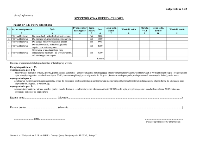 Załącznik nr 1.23 ........................................... pieczęć wykonawcy SZCZEGÓŁOWA OFERTA CENOWA Pakiet nr 1.23 Filtry oddechowe Lp. Nazwa asortymentu 1 2 1 Filtry oddechowe 2 Filtry oddechowe 3 Filtry oddechowe 4 Filtry oddechowe 5 Filtry oddechowe Producent/nr Jedn. katalogowy Miary 3 4 5 Dla dorosłych, mikrobiologicznie czyste Szt. Dla niemowląt, mikrobiologicznie czyste szt. Dla dzieci, mikrobiologicznie czyste szt. Do tracheostomii, mikrobiologicznie szt. czyste , tzw. sztuczny nos Stosowane w anestezjologii przy znieczuleniu ogólnym i do worków ambu, szt. mikrobiologicznie czyste Opis Ilość 6 5400 1800 900 Cena jedn. Netto 7 Wartość netto 8 Stawka VAT 9 Cena jedn. Brutto 10 Wartość brutto 11 4000 3000 Razem: Prosimy o wpisanie do tabeli producenta i nr katalogowy wyrobu Uwagi do pakietu nr 1. 23: wymagania dla poz. 1-3: − zatrzymujące bakterie, wirusy, grzyby, prątki; zasada działania – elektrostatyczne; zapobiegające spadkowi temperatury gazów oddechowych z wymiennikiem ciepła i wilgoci; niski opór przepływu gazów; standardowe złącze 22/15; łatwe do utylizacji; czas uŜywania do 24 godz.; konektor do kapnografu; mała przestrzeń martwa (dla dzieci); mała masa; wymagania do poz. 4: celulozowa membrana filtrująca; centralny otwór do odsysania lub bronchoskopii; zintegrowana moŜliwość podłączenia tlenoterapii; standardowe złącze; łatwe do utylizacji; czas uŜywania do 24 godz.. o wadze 6,3g wymagania dla poz. 5: zatrzymujące bakterie, wirusy, grzyby, prątki; zasada działania – elektrostatyczne; skuteczność min 99,99% niski opór przepływu gazów; standardowe złącze 22/15; łatwe do utylizacji; konektor do kapnografu Razem netto.............................................. (słownie................................................................................................................................................................) Razem brutto............................................. (słownie................................................................................................................................................................) ............................dnia.................................... ..................................................... Pieczęć i podpis osoby uprawnionej Strona 1 z 1 Załącznik nr 1.23 do SIWZ – Drobny Sprzęt Medyczny dla SPSZOZ „Zdroje”.
