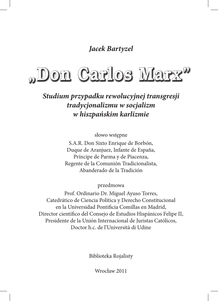 Jacek Bartyzel „Don Carlos Marx” Studium przypadku rewolucyjnej transgresji tradycjonalizmu w socjalizm w hiszpańskim karlizmie słowo wstępne S.A.R. Don Sixto Enrique de Borbón, Duque de Aranjuez, Infante de España, Príncipe de Parma y de Piacenza, Regente de la Comunión Tradicionalista, Abanderado de la Tradición przedmowa Prof. Ordinario Dr. Miguel Ayuso Torres, Catedrático de Ciencia Política y Derecho Constitucional en la Universidad Pontificia Comillas en Madrid, Director científico del Consejo de Estudios Hispánicos Felipe II, Presidente de la Unión Internacional de Juristas Católicos, Doctor h.c. de l’Università di Udine Biblioteka Rojalisty Wrocław 2011 Korekta Adrian Nikiel, Michał J. Czarnecki Recenzent Prof. dr hab. Wojciech Polak Łamanie Rafał Łapiński Copyright © 2011 of text by Jacek Bartyzel Copyright © 2011 of this edition by Organizacja Monarchistów Polskich Wersja skrócona została zamieszczona w „Studia Philosophica Wratislaviensia”, vol. V, fasc. 4 (2010). Wydawnictwo: Fundacja „Virtus Nobilitat” www.virtusnobilitat.pl ISBN 978-83-932741-1-6 SPIS RZECZY Sixto Enrique de Borbón / Sykstus Henryk Burboński Prólogo / Słowo wstępne .................................................................................... 4 Miguel Ayuso Introducción / Przedmowa ............................................................................. 6 Wprowadzenie ................................................................................................. 11 1. „Sytuacja rewolucyjna”: karliści bez ludu i bez króla ............................. 15 2. „Rewolucja w faktach”. Od Wspólnoty do Partii...................................... 22 3. „Rewolucja w ideach”. Carlismo socialista contra carlismo tradicionalista . .................................... 38 4. „Rewolucja w tendencjach”. Jak to było możliwe? .................................. 56 Resumen / Summary......................................................................................... 62 Słowniczek ważniejszych postaci................................................................... 64 Bibliografia........................................................................................................ 72 Z recenzji prof. Wojciecha Polaka.................................................................. 78