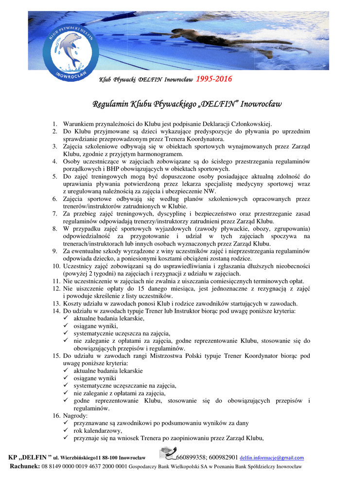 Klub Pływacki DELFIN Inowrocław 1995-2016 Regulamin Klubu Pływackiego „DELFIN” Inowrocław 1. Warunkiem przynależnoś żności ci do Klubu jest podpisanie Deklaracji Członkowskiej Członkowskiej. 2. Do Klubu lubu przyjmowane są s dzieci wykazujące predyspozycje do pływania po uprzednim sprawdzianie przeprowadzonym przez Trenera Koordynatora. 3. Zajęcia cia szkoleniowe odbywaj odbywają się w obiektach sportowych wynajmowanych przez Zarząd Klubu, zgodnie z przyjętym harmonogramem. 4. Osoby uczestniczące ce w zaj zajęciach zobowiązane są do ścisłego isłego przestrzegania regulaminów porządkowych dkowych i BHP obowi obowiązujących w obiektach sportowych. 5. Do zajęć treningowych mog mogą być dopuszczone osoby posiadające ce aktualn aktualną zdolność do uprawiania pływania potwierdzoną potwierdzon przez lekarza specjalistę medycyny sportowej wraz z uregulowaną należnością ścią za zajęcia i ubezpieczenie NW. 6. Zajęcia cia sportowe odbywaj odbywają się według planów szkoleniowych opracowanych przez trenerów/instruktorów zatrudnionych w Klubie. 7. Za przebieg zajęć treningowych, dyscyplinę dyscyplin i bezpieczeństwo stwo oraz przestrzeganie przestrze zasad regulaminów odpowiadają trenerzy/instruktorzy zatrudnieni przez Zarząd ąd Klubu. 8. W przypadku zajęć ęć sportowych wyjazdowych (zawody pływackie, obozy, zgrupowania) odpowiedzialność za przygotowanie i udział w tych zajęciach zajęciach spoczywa na trenerach/instruktorach ruktorach lub innych osobach wyznaczonych przez Zarząd Zarząd Klubu. 9. Za ewentualne szkody wyrządzone wyrz z winy uczestników zajęć i nieprzestrzegania regulaminów odpowiada dziecko, a poniesionymi kosztami obciążeni obci zostaną rodzice. 10. Uczestnicy zajęć zobowiązani zobowią są do usprawiedliwiania i zgłaszania dłuższych dłuż nieobecności (powyżej ej 2 tygodni) na zaj zajęciach i rezygnacji z udziału w zajęciach. 11. Nie uczestniczenie w zajęciach zaję nie zwalnia z uiszczania comiesięcznych cznych terminowych opłat. 12. Nie uiszczenie opłaty do 15 danego miesiąca, miesi , jest jednoznaczne z rezygnacją rezygnacj z zajęć i powoduje skreślenie lenie z listy uczestników. 13. Koszty udziału w zawodach ponosi Klub i rodzice zawodników startujących startujących w zawodach. 14. Do udziału w zawodach typuje Trener lub Instruktor biorąc bior pod uwagęę poni poniższe kryteria: aktualne badania lekarskie, osiągane wyniki, systematycznie uczęszcza na zajęcia, zaj nie zaleganie z opłatami za zajęcia, zaj godne reprezentowanie Klubu, stosowanie się si do obowiązujących przepisów i regulaminów. 15. Do udziału w zawodach rangi Mistrzostwa Polski typuje typuje Trener Koordynator biorąc pod uwagę poniższe sze kryteria: aktualne badania lekarskie osiągane wyniki systematyczne uczęszczanie ęszczanie na zaj zajęcia, nie zaleganie z opłatami za zajęcia, zaj godne reprezentowanie Klubu, stosowanie się si do obowiązują ązujących przepisów i regulaminów. 16. Nagrody: przyznawane są zawodnikowi po podsumowaniu wyników za dany rok kalendarzowy, przyznaje się na wniosek Trenera po zaopiniowaniu przez Zarząd Zarz d Klubu, Klubu KP „DELFIN ” ul. Wierzbińskiego11 88-100 100 Inowrocław 660899358; 600982901 [email protected] delfin.informacje@ Rachunek: 08 8149 0000 0019 4637 2000 0001 Gospodarczy Bank Wielkopolski SA w Poznaniu Bank Spółdzielczy Inowrocław Klub Pływacki DELFIN Inowrocław 1995-2016 Zarządd Klubu wraz z Trenerem mogą mog wnioskować o przyznanie, nagrody zawodnikowi przez Prezydenta Prezyd Miasta Inowrocławia. 17. Kary Zawodnik możee być ukarany za: niesportowe zachowanie się si podczas zajęć treningowych i startów w zawodach nieprzestrzeganie regulaminu Klubu. Klubu 18. Zawodnik może być ukarany zawieszeniem w prawach członka Klubu tj. niedopuszczeniem do zajęć zaj treningowych i startów w zawodach, zawodach wykluczeniem zeniem z członkostwa w Klubie (zgodnie ( ze Statutem). REGULAMIN OPŁAT ZA UDZIAŁ w ZAJĘCIACH ZAJ CIACH ORGANIZOWANYCH PRZEZ KLUB PŁYWACKI „DELFIN” INOWROCŁAW zaj ciach została ustalona na 130 PLN/ miesiąc. miesią 1. Wysokość opłat za udział w zajęciach 2. Opłatę należy uiścić do 15 ka każdego m-ca – płatność przelewem na konto 08 8149 0000 0019 4637 2000 0001 lub gotówką gotówk w biurze klubu w trakcie zajęć od poniedziałku do czwartku. 3. Brak należnej nej wpłaty w terminie i nie zgłoszenie przyczyny spowoduje zawieszenie w prawach członka i odsunięcie odsuni od zajęć do czasu wyjaśnienia i uregulowania należności. nale 4. Za wysokie osiągnięcia ęcia sportowe (Mistrzostwa Polski) możliwe liwe jest obniż obniżenie lub zwolnienie z opłat za zajęcia – na wniosek Trenera Koordynatora, do następnego pnego startu w M.P. Decyzję podejmuje Zarządd Klubu. KP „DELFIN ” ul. Wierzbińskiego11 88-100 100 Inowrocław 660899358; 600982901 [email protected] delfin.informacje@ Rachunek: 08 8149 0000 0019 4637 2000 0001 Gospodarczy Bank Wielkopolski SA w Poznaniu Bank Spółdzielczy Inowrocław