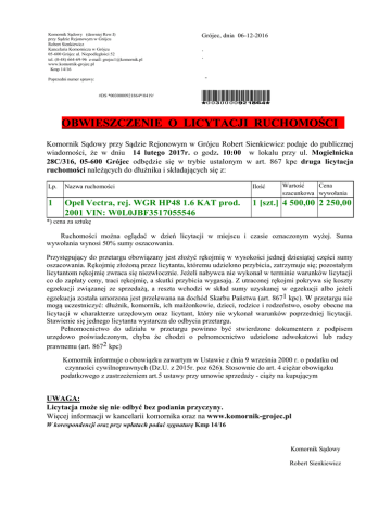 Komornik Sądowy (dawniej Rew.I) przy Sądzie Rejonowym w Grójcu Robert Sienkiewicz Kancelaria Komornicza w Grójcu 05-600 Grójec ul. Niepodległości 52 tel. (0-48) 664-69-96 e-mail: [email protected] www.komornik-grojec.pl Kmp 14/16 Grójec, dnia 06-12-2016 . . - Poprzedni numer sprawy: #DS *0030000921864*/0419/ *0030000921864* OBWIESZCZENIE O LICYTACJI RUCHOMOŚCI Komornik Sądowy przy Sądzie Rejonowym w Grójcu Robert Sienkiewicz podaje do publicznej wiadomości, że w dniu 14 lutego 2017r. o godz. 10:00 w lokalu przy ul. Mogielnicka 28C/316, 05-600 Grójec odbędzie się w trybie ustalonym w art. 867 kpc druga licytacja ruchomości należących do dłużnika i składających się z: Wartość Cena szacunkowa wywołania Lp. Nazwa ruchomości Ilość 1 Opel Vectra, rej. WGR HP48 1.6 KAT prod. 2001 VIN: W0L0JBF3517055546 1 [szt.] 4 500,00 2 250,00 *) cena za sztukę Ruchomości można oglądać w dzień licytacji w miejscu i czasie oznaczonym wyżej. Suma wywołania wynosi 50% sumy oszacowania. Przystępujący do przetargu obowiązany jest złożyć rękojmię w wysokości jednej dziesiątej części sumy oszacowania. Rękojmię złożoną przez licytanta, któremu udzielono przybicia, zatrzymuje się; pozostałym licytantom rękojmię zwraca się niezwłocznie. Jeżeli nabywca nie wykonał w terminie warunków licytacji co do zapłaty ceny, traci rękojmię, a skutki przybicia wygasają. Z utraconej rękojmi pokrywa się koszty egzekucji związanej ze sprzedażą, a reszta wchodzi w skład sumy uzyskanej w egzekucji albo jeżeli egzekucja została umorzona jest przelewana na dochód Skarbu Państwa (art. 8671 kpc). W przetargu nie mogą uczestniczyć: dłużnik, komornik, ich małżonkowie, dzieci, rodzice i rodzeństwo, osoby obecne na licytacji w charakterze urzędowym oraz licytant, który nie wykonał warunków poprzedniej licytacji. Stawienie się jednego licytanta wystarcza do odbycia przetargu. Pełnomocnictwo do udziału w przetargu powinno być stwierdzone dokumentem z podpisem urzędowo poświadczonym, chyba że chodzi o pełnomocnictwo udzielone adwokatowi lub radcy prawnemu (art. 8672 kpc) Komornik informuje o obowiązku zawartym w Ustawie z dnia 9 września 2000 r. o podatku od czynności cywilnoprawnych (Dz.U. z 2015r. poz 626). Stosownie do art. 4 ciężar obowiązku podatkowego z zastrzeżeniem art.5 ustawy przy umowie sprzedaży - ciąży na kupującym UWAGA: Licytacja może się nie odbyć bez podania przyczyny. Więcej informacji w kancelarii komornika oraz na www.komornik-grojec.pl W korespondencji oraz przy wpłatach podać sygnaturę Kmp 14/16 Komornik Sądowy Robert Sienkiewicz