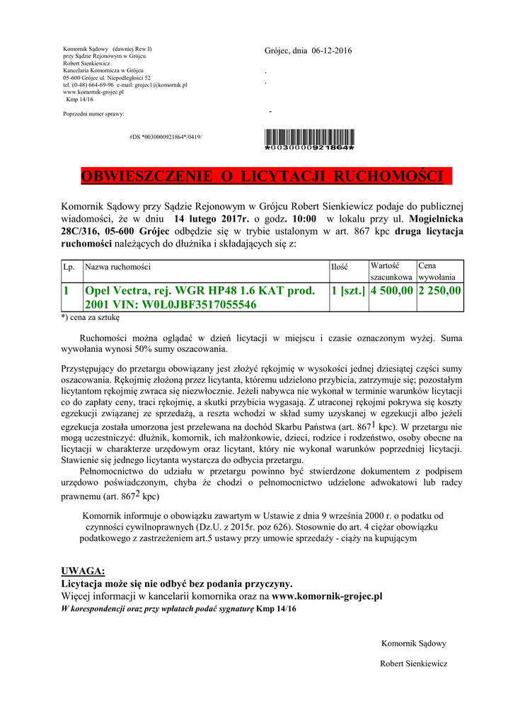 Kmp 14/16 - Komornik Sądowy przy Sądzie Rejonowym w Grójcu