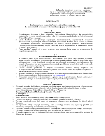 PROJEKT Załącznik: do uchwały w sprawie wyrażenia zgody na organizację V edycji „Konkursu o Laur Marszałka Województwa Mazowieckiego dla mazowieckich producentów żywności za najlepszy produkt roku” REGULAMIN Konkursu o Laur Marszałka Województwa Mazowieckiego dla mazowieckich producentów żywności za najlepszy produkt roku 2011 1. 2. 3. 1. 2. 3. 4. 1. 2. 3. 4. 5. 6. 7. 8. § 1. Postanowienia ogólne Organizatorem Konkursu o Laur Marszałka Województwa Mazowieckiego dla mazowieckich producentów żywności za najlepszy produkt roku 2011, zwanego dalej „Konkursem”, jest Samorząd Województwa Mazowieckiego. Celem Konkursu jest promocja najlepszych, najsmaczniejszych, najzdrowszych produktów żywnościowych wytwarzanych przez mazowieckich producentów. Konkurs ma za zadanie wyłonienie i nagrodzenie producentów wyróżniających się wysoką jakością produkcji, kultywowaniem i popularyzowaniem mazowieckiej tradycji kulinarnej, a także oryginalnością w podejściu do tematu żywności i przetwórstwa. Przez „produkt” rozumie się wyroby, przetwory oraz surowce, które mogą być przeznaczone do bezpośredniego spożycia. § 2. Warunki uczestnictwa w Konkursie W konkursie mogą wziąć udział producenci funkcjonujący jako firmy, koła gospodyń wiejskich, stowarzyszenia, gospodarstwa agroturystyczne, gospodarstwa ekologiczne, osoby fizyczne, które mogą udokumentować swoją działalność posiadanymi certyfikatami, dyplomami, zaświadczeniami lub innymi dokumentami np. potwierdzającymi prezentację produktu na targach, festynach, wystawach, imprezach lokalnych i regionalnych. Główna siedziba producenta i miejsce wytwarzania produktu muszą znajdować się w Województwie Mazowieckim. Produkty zgłoszone do Konkursu muszą być wytwarzane głównie z surowców pozyskiwanych na Mazowszu. Warunki udziału oraz formularz zgłoszeniowy do Konkursu określane są każdorazowo w Regulaminie, dostępnym u organizatora Konkursu na stronie: www.mazovia.pl Warunkiem uczestnictwa w Konkursie jest podpisanie zgody na przetwarzanie danych osobowych w zakresie określonym w oświadczeniu będącym częścią formularza zgłoszeniowego. § 3. Zgłoszenia do Konkursu Zgłoszenie produktu do Konkursu polega na przesłaniu pocztą wypełnionego formularza zgłoszeniowego, zgodnie z wzorem stanowiącym załącznik Nr 1 do Regulaminu, do Sekretariatu Konkursu na adres: Urząd Marszałkowski Województwa Mazowieckiego w Warszawie Departament Rolnictwa i Modernizacji Terenów Wiejskich ul. Skoczylasa 4 03-469 Warszawa Każdy uczestnik Konkursu może zgłosić tylko jeden produkt w danym roku. Produkty nagrodzone w poprzednich edycjach Konkursu nie mogą być powtórnie zgłaszane. Ten sam produkt nie może być więcej niż trzykrotnie zgłaszany przez producenta do różnych edycji Konkursu. Do zgłoszenia należy dołączyć dokumenty, które pozwalają określić, czy zgłoszony produkt jest powtarzalny (certyfikaty, oświadczenia, zaświadczenia, itp.). Zgłoszenia do konkursu przyjmowane są do dnia 29 lutego 2012 roku (decyduje data stempla pocztowego). Zgłoszenia niekompletne oraz opóźnione nie będą uwzględniane w Konkursie. W terminie podanym przez organizatora Konkursu należy przekazać reprezentatywną próbkę produktu do Sekretariatu Konkursu. § 4. Kategorie 1. Konkurs jest organizowany w następujących kategoriach: 1) Mazowiecki produkt konwencjonalny: a) wyroby piekarnicze, b) wyroby cukiernicze, c) wędliny oraz przetwory mięsne, d) produkty mleczarskie, e) owoce, warzywa, przetwory owocowe i warzywne; produkty pochodzenia roślinnego, f) miody, g) napoje; 2) Mazowiecki produkt tradycyjny i naturalny (produkcja bez chemii, naturalne procesy technologiczne, tradycyjna receptura, surowce pochodzące z rolnictwa ekologicznego lub rolnictwa zintegrowanego): a) wyroby piekarnicze, b) wyroby cukiernicze, c) wędliny oraz przetwory mięsne, d) produkty mleczarskie, e) owoce, warzywa, przetwory owocowe i warzywne, produkty pochodzenia roślinnego, f) miody, g) napoje. 2. Organizator zastrzega sobie prawo do zmiany kategorii zgłaszanych produktów. 1. 2. 3. 4. 5. 6. 7. 8. 9. 1. 2. 3. 4. 5. § 5. Rozstrzygnięcie Konkursu Rozstrzygnięcie Konkursu nastąpi na przełomie I i II kwartału 2012 r. Rozstrzygnięcie Konkursu nastąpi podczas posiedzenia Kapituły Konkursu, w której skład wchodzą pracownicy Urzędu Marszałkowskiego Województwa Mazowieckiego w Warszawie (4 osoby) oraz instytucji zewnętrznych (3 osoby). Osobowy skład Kapituły Konkursu zostanie powołany zarządzeniem Marszałka. Ocena zakwalifikowanych do Konkursu produktów może odbyć się przy obecności co najmniej 5 członków Kapituły. Członkowie Kapituły będą oceniać produkty na Karcie Oceny Produktów, której wzór stanowi załącznik Nr 2 do Regulaminu. Przed oceną uczestnicy Konkursu zostaną powiadomieni o terminie dostarczenia reprezentatywnych próbek produktu do Sekretariatu Konkursu. Członkowie Kapituły Konkursu mają prawo do przeprowadzenia, uzgodnionych z producentem, wizytacji miejsc wytwarzania zgłoszonych produktów. O wynikach pracy Kapituły laureaci Konkursu zostaną poinformowani listownie. Wyniki Konkursu zostaną umieszczone na stronie www.mazovia.pl § 6. Finał Konkursu W każdej z 14 kategorii nagrodzony zostanie jeden produkt. W szczególnych przypadkach Kapituła Konkursu może przyznać nagrody specjalne oraz wyróżnienia. Laureaci Konkursu w poszczególnych kategoriach otrzymają dyplom zawierający: nazwę producenta, nazwę produktu oraz nazwę zdobytego tytułu, a także nagrodę rzeczową. Laureaci Konkursu otrzymują prawo używania logo „Konkursu o Laur Marszałka Województwa Mazowieckiego dla mazowieckich producentów żywności za najlepszy produkt roku 2011”. Nagrody we wszystkich kategoriach Konkursu wręczone zostaną laureatom Konkursu podczas uroczystości, która odbędzie się w II kwartale 2012 r. Załączniki: • Formularz z