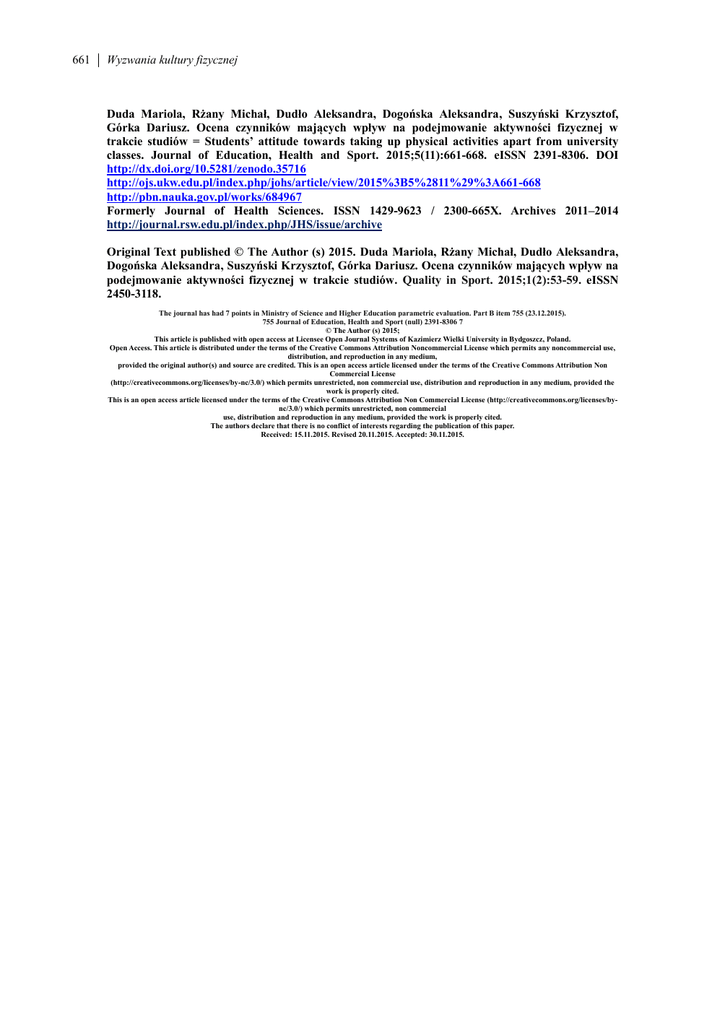 Original Text published © The Author (s) 2015. Duda Mariola, Rżany Michał, Dudło Aleksandra,