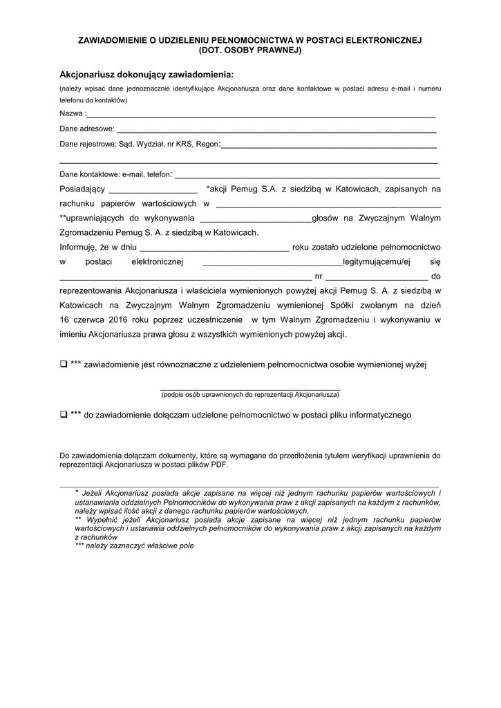 ZAWIADOMIENIE O UDZIELENIU PEŁNOMOCNICTWA W POSTACI ELEKTRONICZNEJ (DOT. OSOBY PRAWNEJ) Akcjonariusz dokonujący zawiadomienia: (należy wpisać dane jednoznacznie identyfikujące Akcjonariusza oraz dane kontaktowe w postaci adresu e-mail i numeru telefonu do kontaktów) Nazwa :_______________________________________________________________________ Dane adresowe: _________________________________________________________________ Dane rejestrowe: Sąd, Wydział, nr KRS, Regon:____________________________________________ _____________________________________________________________________________ Dane kontaktowe: e-mail, telefon: ______________________________________________________ Posiadający ___________________ *akcji Pemug S.A. z siedzibą w Katowicach, zapisanych na rachunku papierów wartościowych w ________________________________________________ **uprawniających do wykonywania ________________________głosów na Zwyczajnym Walnym Zgromadzeniu Pemug S. A. z siedzibą w Katowicach. Informuję, że w dniu ________________________________ roku zostało udzielone pełnomocnictwo w postaci elektronicznej ______________________________legitymującemu/ej się ______________________________________________________ nr ______________________ do reprezentowania Akcjonariusza i właściciela wymienionych powyżej akcji Pemug S. A. z siedzibą w Katowicach na Zwyczajnym Walnym Zgromadzeniu wymienionej Spółki zwołanym na dzień 16 czerwca 2016 roku poprzez uczestniczenie w tym Walnym Zgromadzeniu i wykonywaniu w imieniu Akcjonariusza prawa głosu z wszystkich wymienionych powyżej akcji. *** zawiadomienie jest równoznaczne z udzieleniem pełnomocnictwa osobie wymienionej wyżej ___________________________________ (podpis osób uprawnionych do reprezentacji Akcjonariusza) *** do zawiadomienie dołączam udzielone pełnomocnictwo w postaci pliku informatycznego Do zawiadomienia dołączam dokumenty, które są wymagane do przedłożenia tytułem weryfikacji uprawnienia do reprezentacji Akcjonariusza w postaci plików PDF. _______________________________________________________________________________________________ * Jeżeli Akcjonariusz posiada akcje zapisane na więcej niż jednym rachunku papierów wartościowych i ustanawiania oddzielnych Pełnomocników do wykonywania praw z akcji zapisanych na każdym z rachunków, należy wpisać ilość akcji z danego rachunku papierów wartościowych. ** Wypełnić jeżeli Akcjonariusz posiada akcje zapisane na więcej niż jednym rachunku papierów wartościowych i ustanawia oddzielnych pełnomocników do wykonywania praw z akcji zapisanych na każdym z rachunków *** należy zaznaczyć właściwe pole